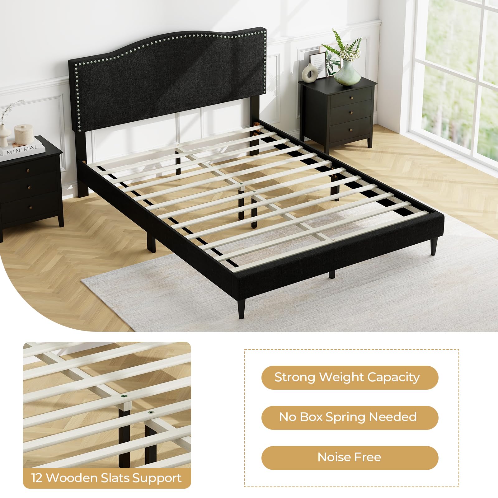 Suitable for queen size mattress, no box spring required
