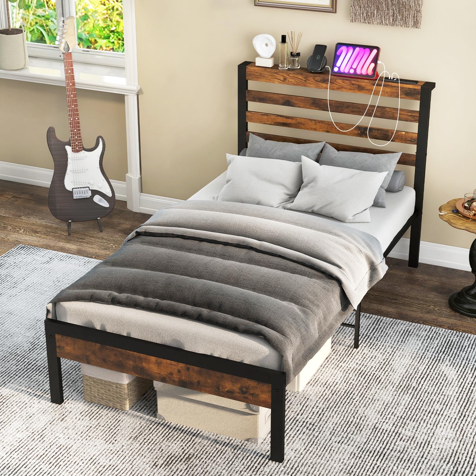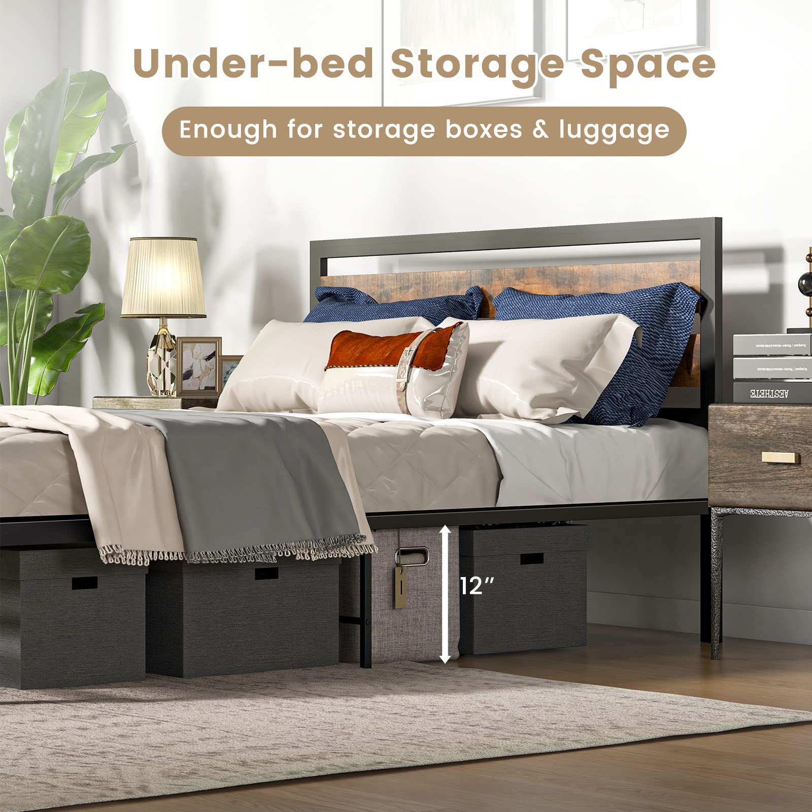 - [All-match Vintage Appearance]: The platform bed base with headboard and footboard is adorned with rustic brown wood grain boards, which go well with the matte black metal frame for an industrial and vintage appearance, creating a warm and inviting atmosphere.