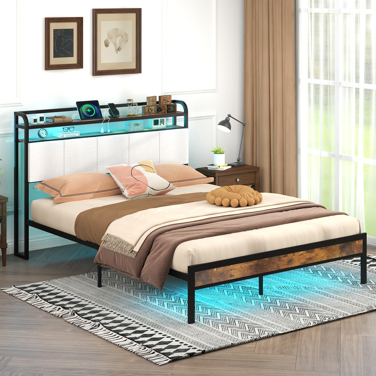What sets this bed apart is the customized LED light embedded around the frame, which includes adjustable colors, modes, speed, and brightness. In addition, the linen upholstered headboard is filled with soft sponge for comfortable back support and 2-tier storage space to keep bedtime essentials within reach. Built for stability, the robust metal slats provide a solid mattress foundation. The ample under-bed storage space is perfect for keeping seasonal clothing, bedding neatly organized in one place. Transform your bedroom into a haven of relaxation and modernity.