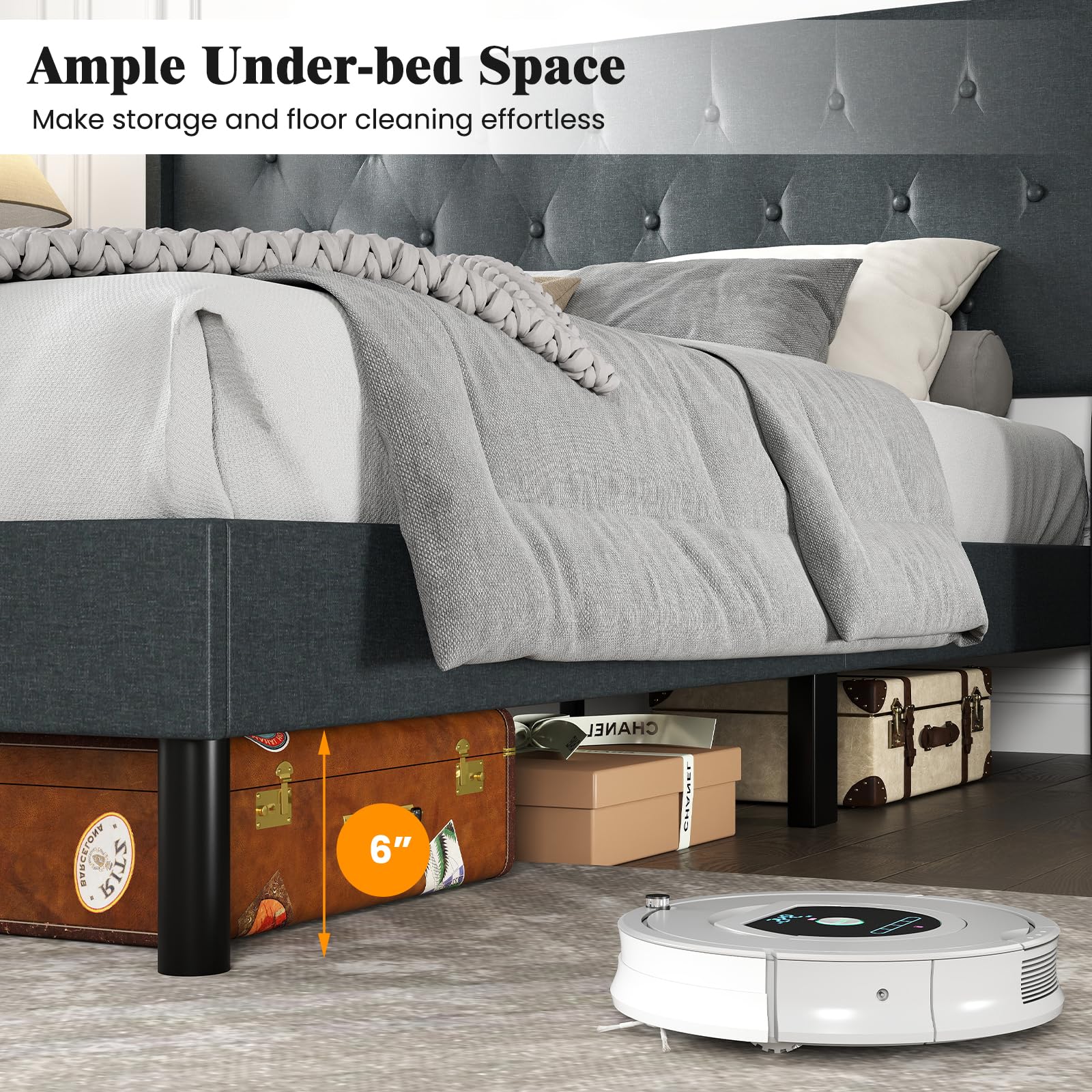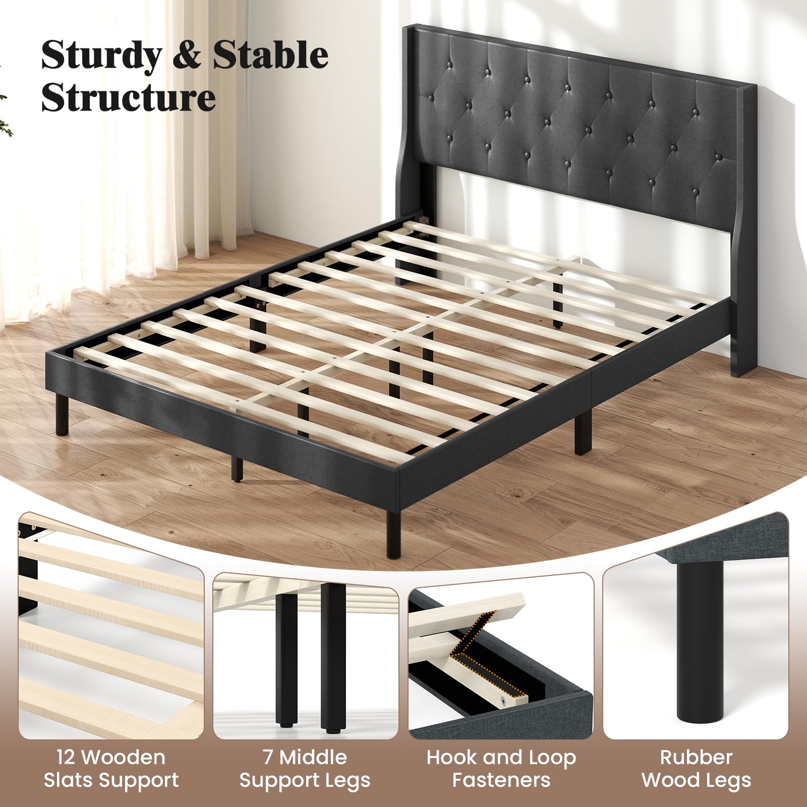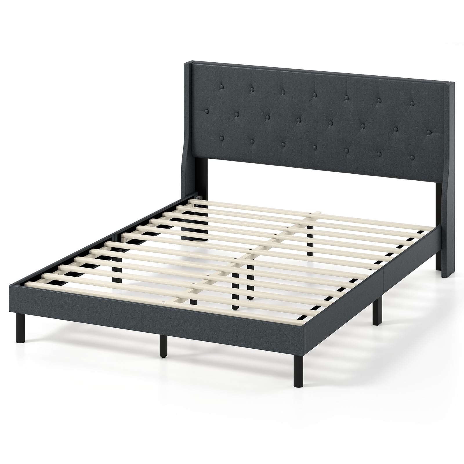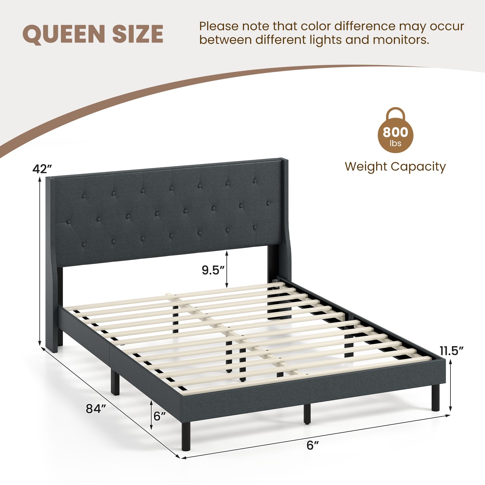 Elevate your bedroom with this queen size upholstered bed frame, clad in soft linen fabric with sponge padding for added comfort. The button-tufted wingback headboard not only provides a cozy surface to lean against but also brings a touch of sophistication to your bedroom. The robust wooden slats provide a stable foundation for your mattress. Combined with sturdy support legs, the bed frame is built to last. For storage convenience, 6-inch under-bed clearance keeps occasional-use items stashed away yet easily accessible. All in all, this platform bed frame fits well into any bedroom decoration while providing a reliable and comfortable sleeping space.