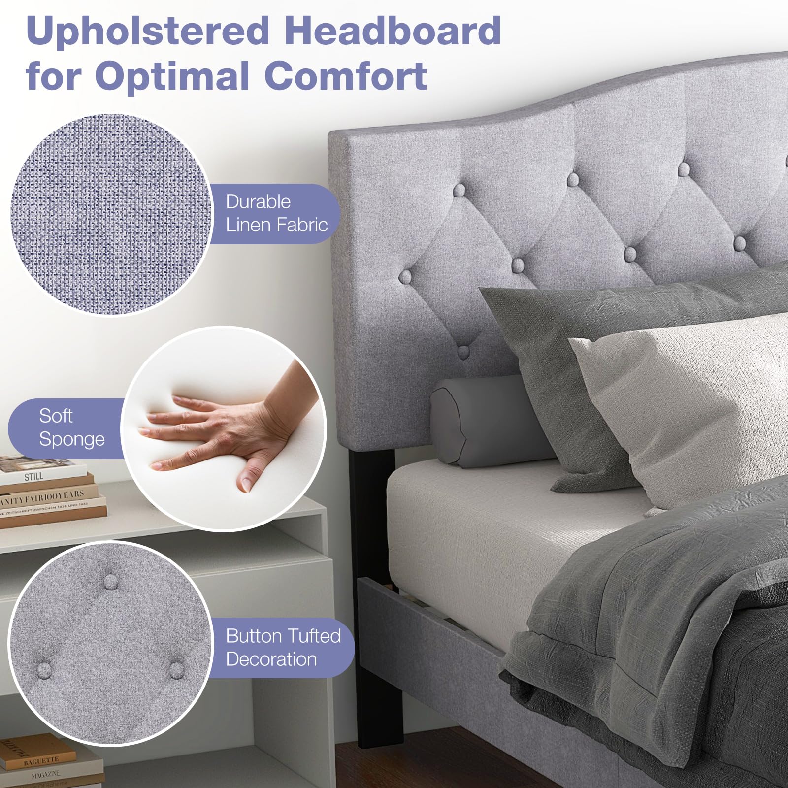 - Upholstered Headboard: The upholstered bed frame features linen fabric upholstery, complete with a classic button-tufted headboard. Its sleek lines and sophisticated design complement any home style, making it an ideal centerpiece for your bedroom.