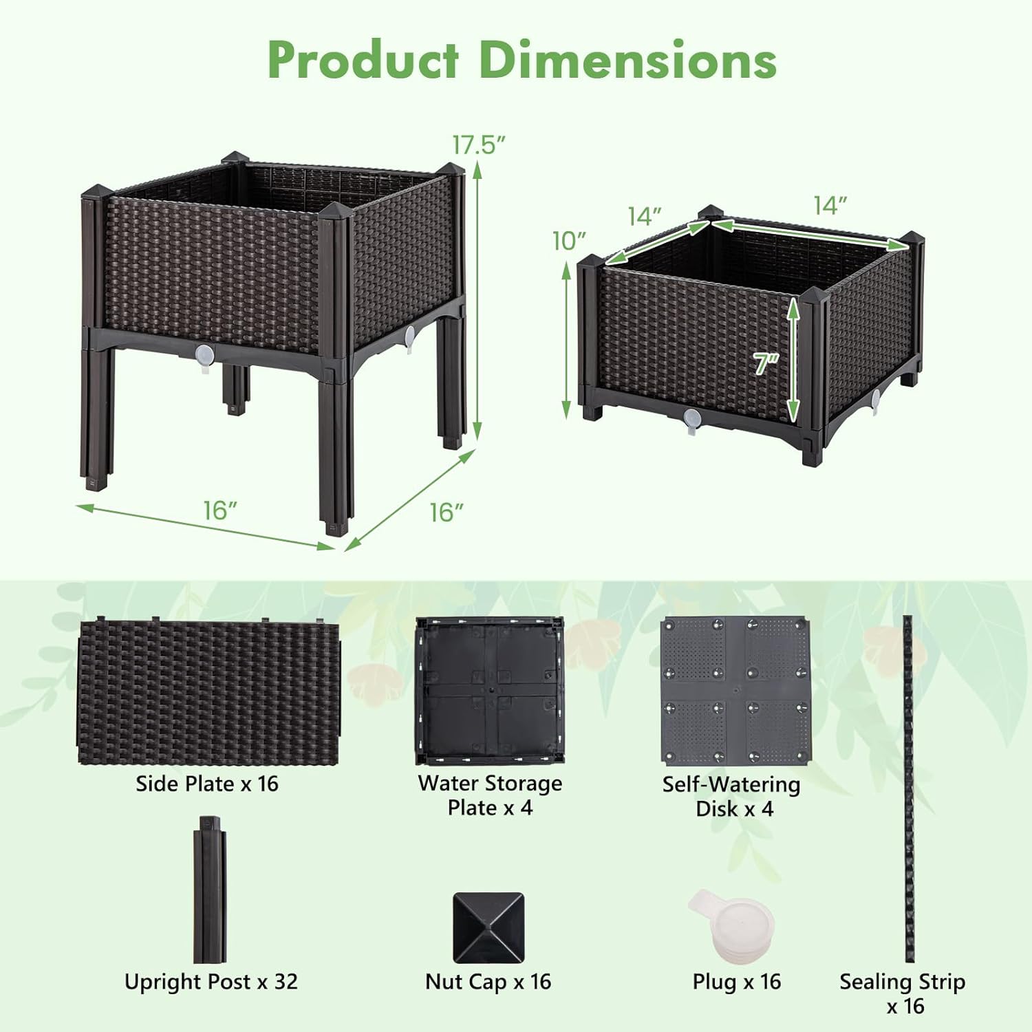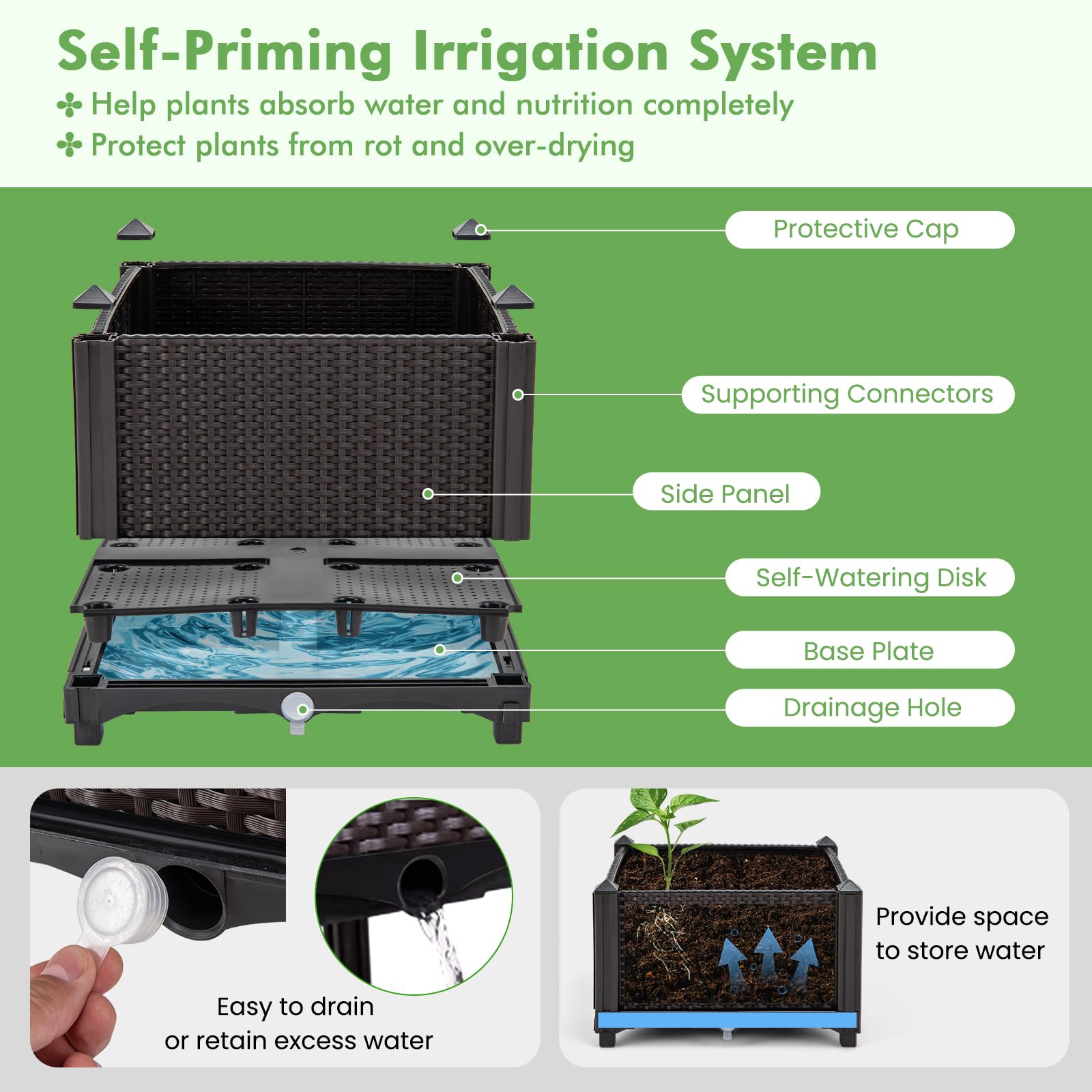 Our raised garden bed kit is designed with 8 elevated legs and 2 planter boxes, allowing you to freely combine the garden boxes as you desire, and each planter box measures 14”x 14”x 10”(L x W x H) with a depth of 7”. It is made of premium PP materials that are durable and weatherproof for long-lasting indoor and outdoor uses. Moreover, the PP materials are designed with rattan patterns, adding a sense of beauty and elegance to your space. More importantly, the elevated planter kit requires no tools for effortless assembly, just insert walls into the base plate and insert the columns along grooves of sideboards, and you can choose whether to install the elevated legs for different purposes. More than that, it is equipped with a self-watering disk, a water storage box, and drainage holes for self-priming irrigation, allowing roots to aerate while having moisture nearby.