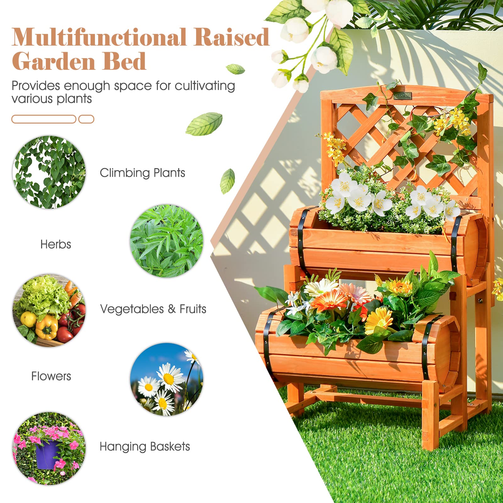 [Multifunctional Raised Garden Bed]: The wooden planter comes with 2 planter boxes, providing enough space for cultivating various plants, such as flowers, vegetables, fruits, herbs, etc. And there exists a trellis for climbing plants to grow. You can also add some decorations to it.