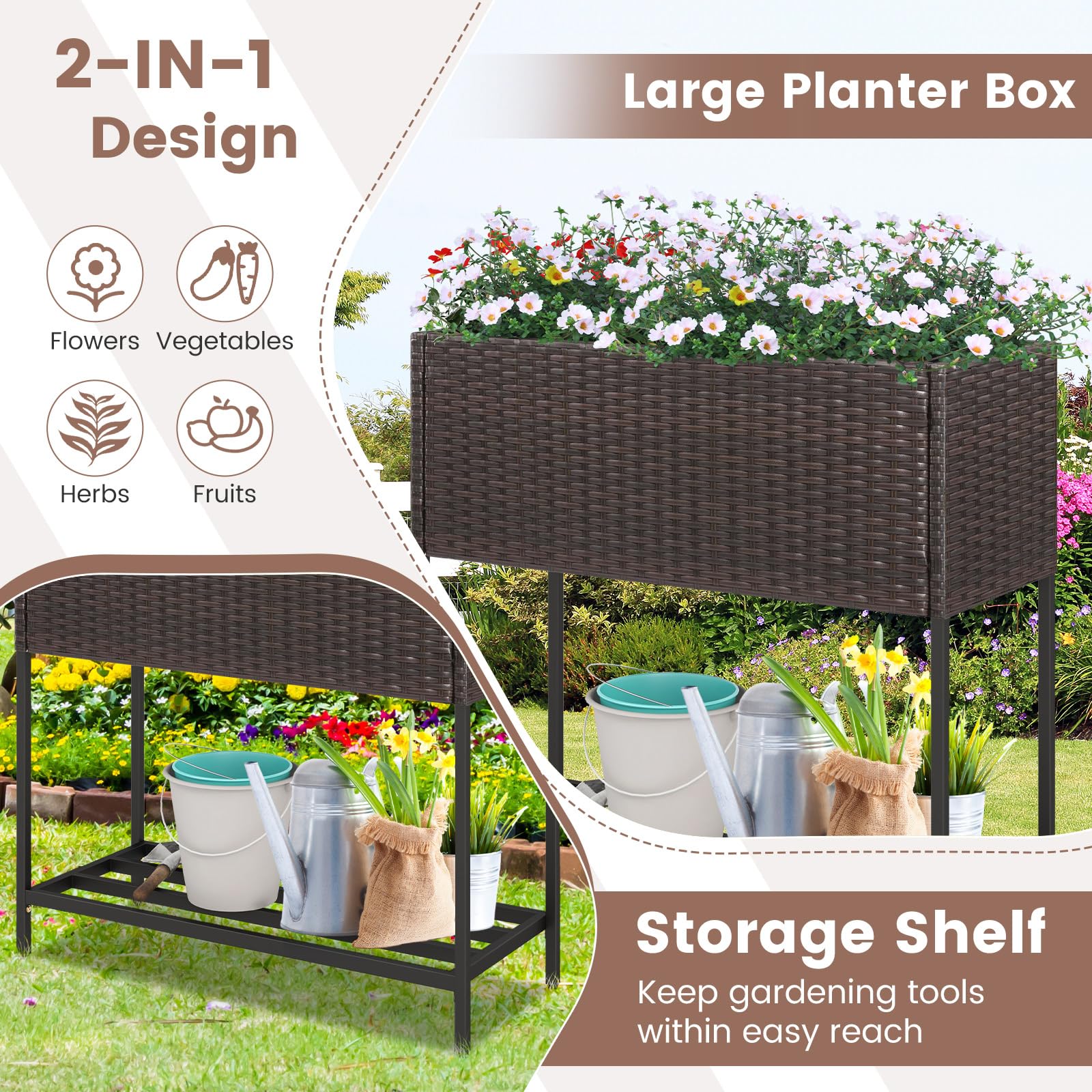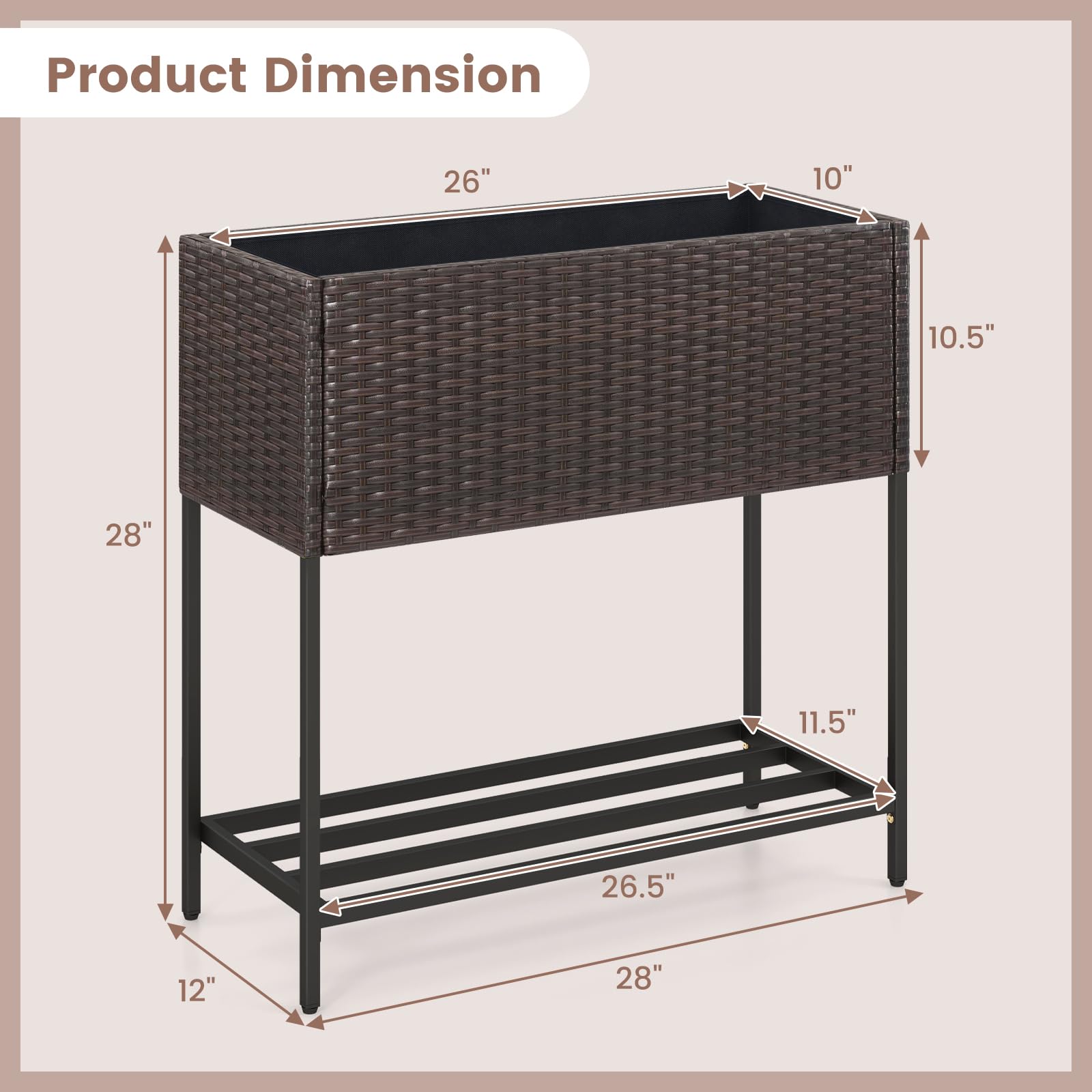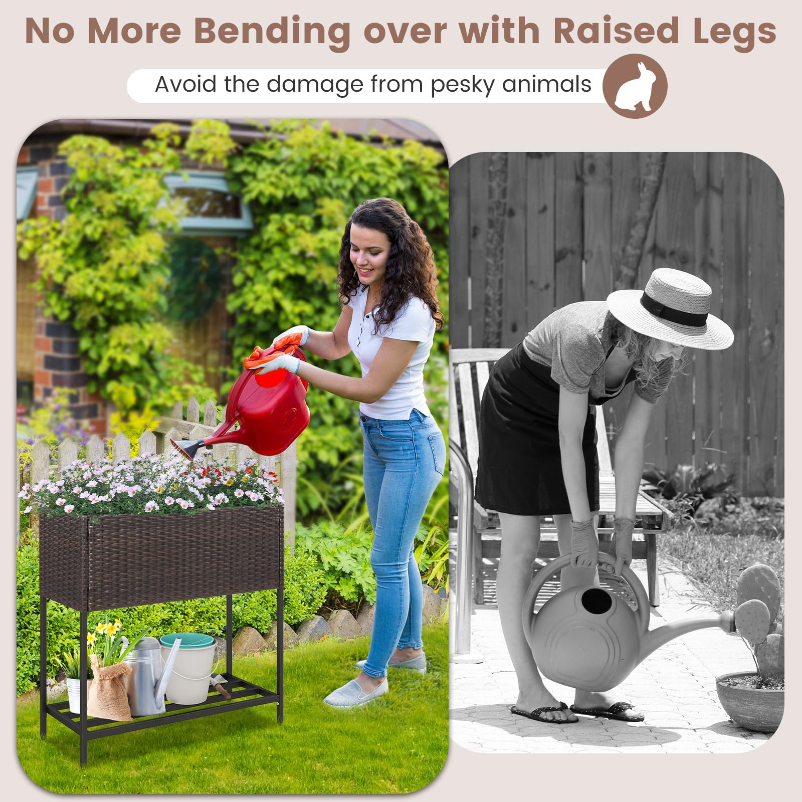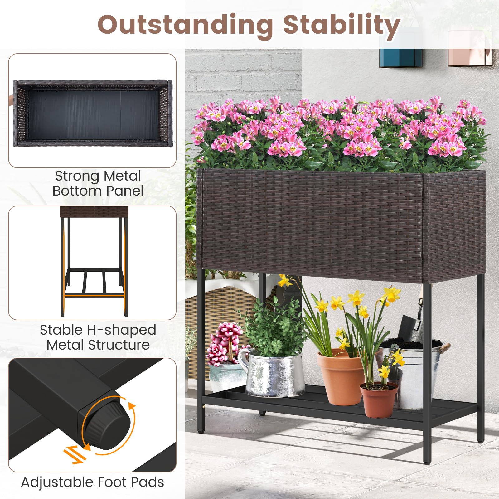 The 10.5" depth of the planter box provides ample space for a wide variety of plants to thrive. Moreover, the elevated planter box includes a storage shelf for keeping your gardening tools in organized. Equipped with a liner and excellent drainage system, the planter box will effectively separate the soil from the wicker and maintain proper humidity. The elevated design can not only avoid the damage from pesky animals, but also allow you to enjoy your gardening experience without painful waist. Supported by H-shaped metal legs, the wicker planting bed boasts superior stability. Thanks to the 4 adjustable foot pads, the standing planting bed can be easily placed on any ground surface, whether in your garden, on your lawn, or even on your balcony. Furthermore, the charming hand-woven rattan will add a touch of elegance, while ensuring long-lasting use.