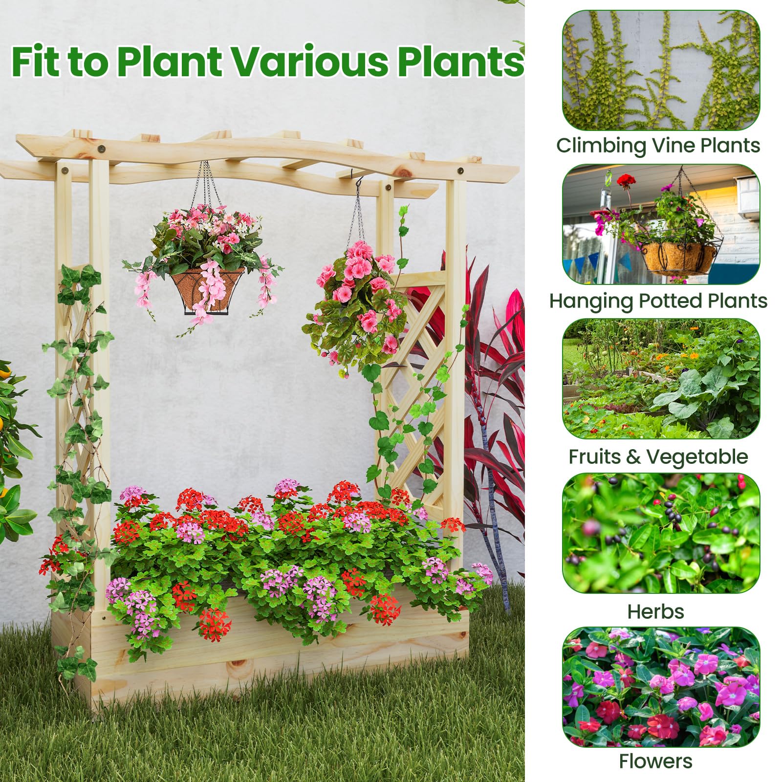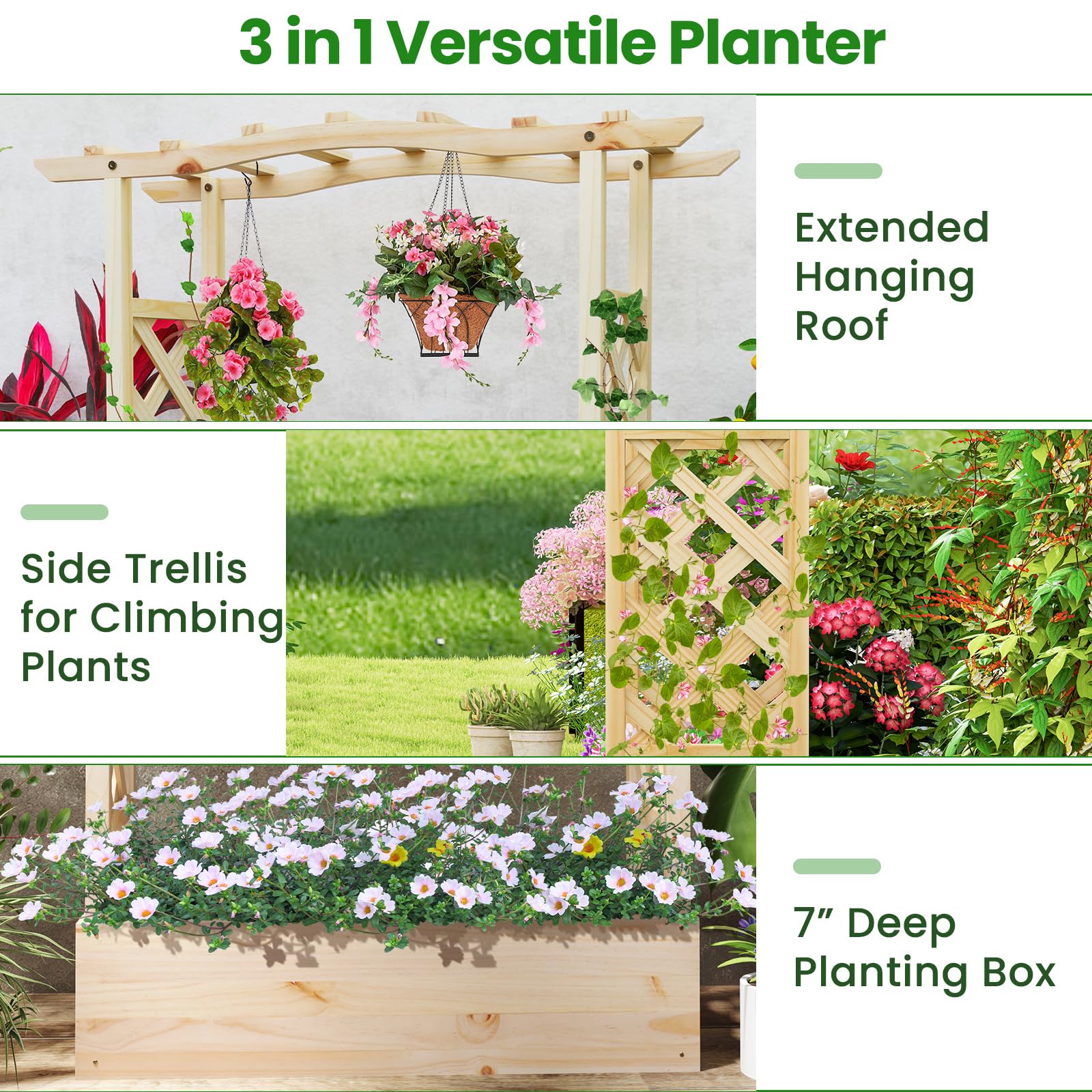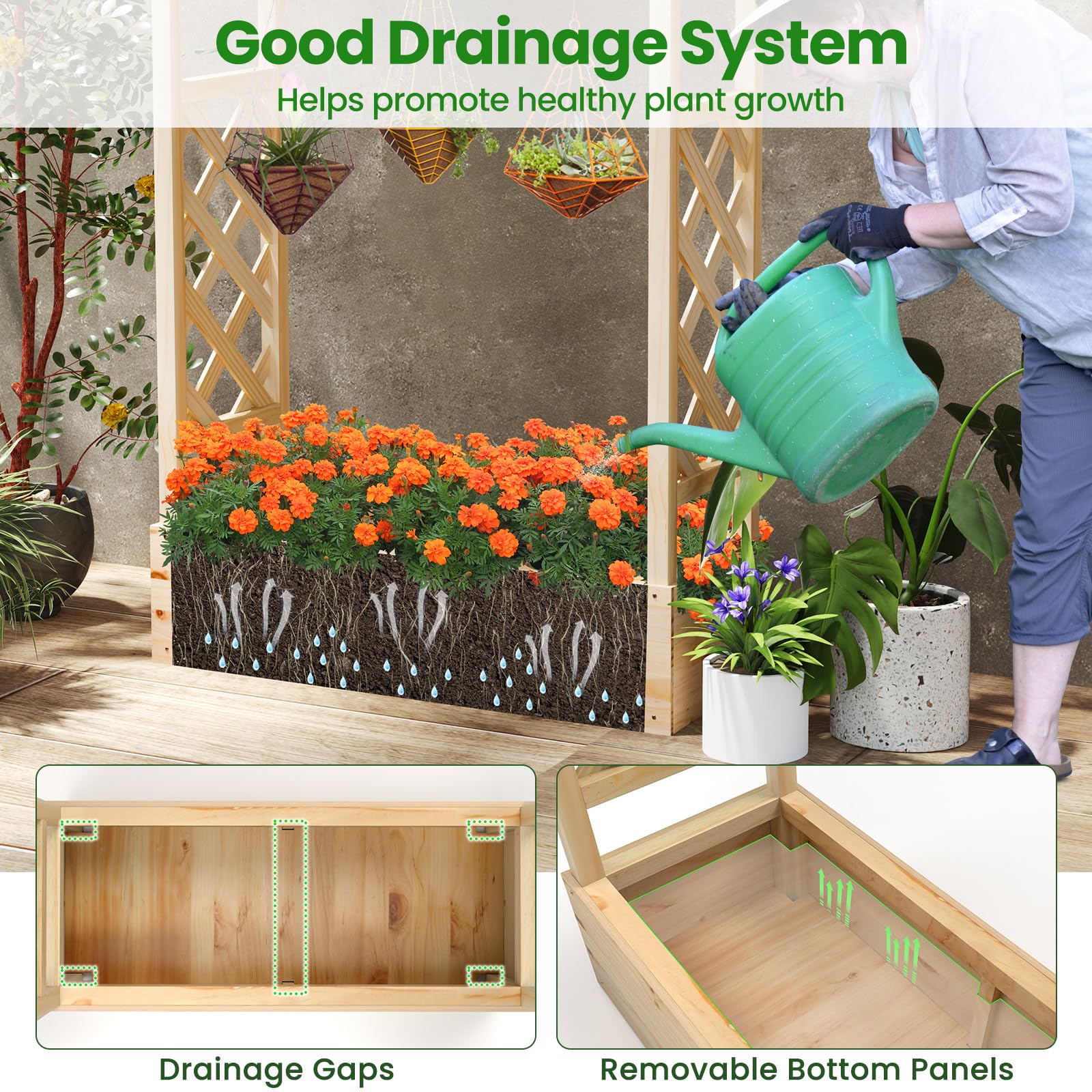 Are you looking for a versatile gardening solution that combines style with functionality? Our 3 in 1 raised garden bed is the perfect choice for you. It features a 7” deep planting box ideal for a variety of plants, two side trellises for vertical growth of climbing plants, and an extended hanging roof for potted plants or cozy vine spots. Designed to fit a wide range of plants including climbing vines, hanging pots, fruits, vegetables, herbs, and flowers, this garden bed is perfect for both indoor and outdoor settings. With its good drainage system, featuring bottom drainage gaps and removable panels, it ensures healthy root development and prevents root rot. Hence, our garden bed can fit perfectly in balconies, backyards, and gardens, adding a touch of greenery to your living space.
