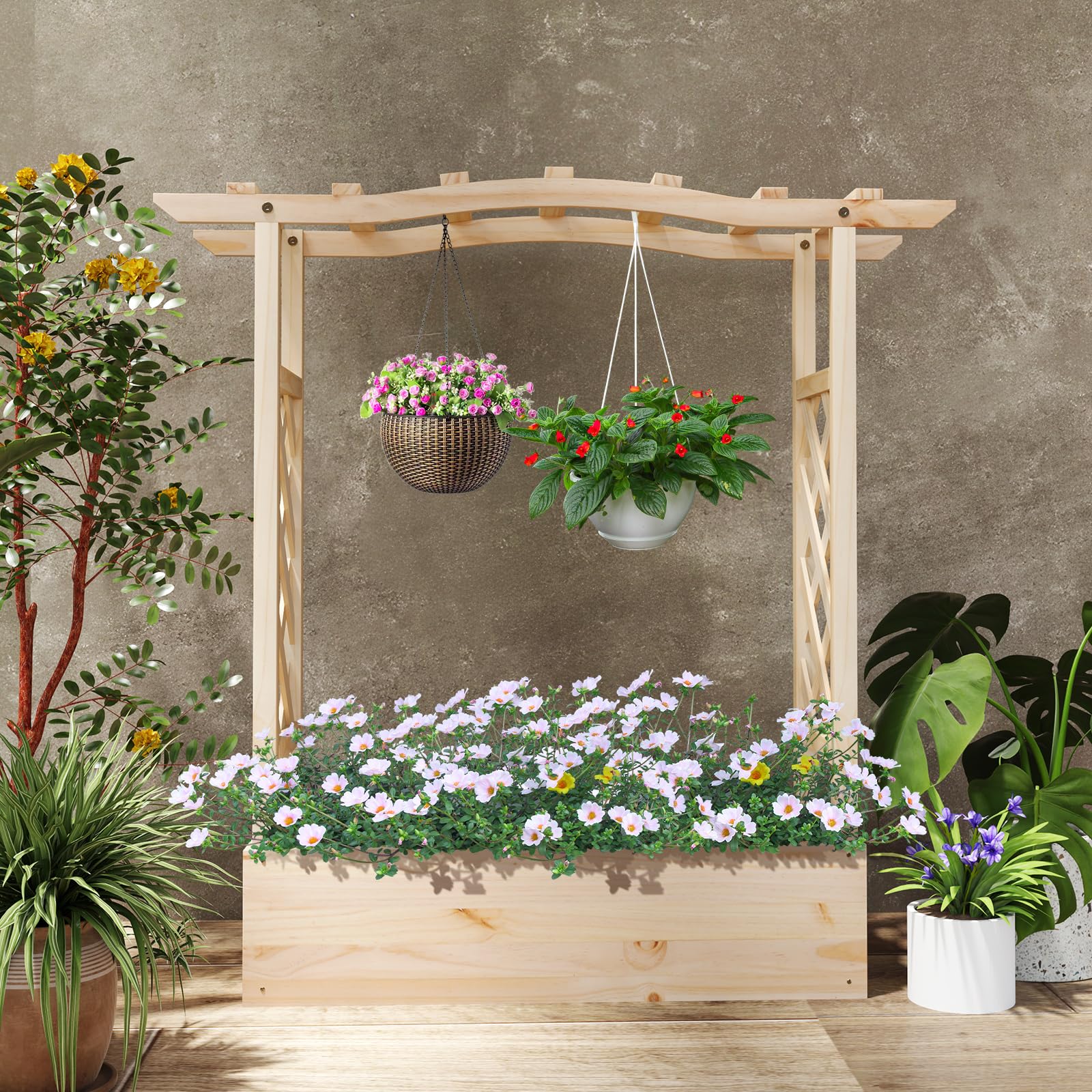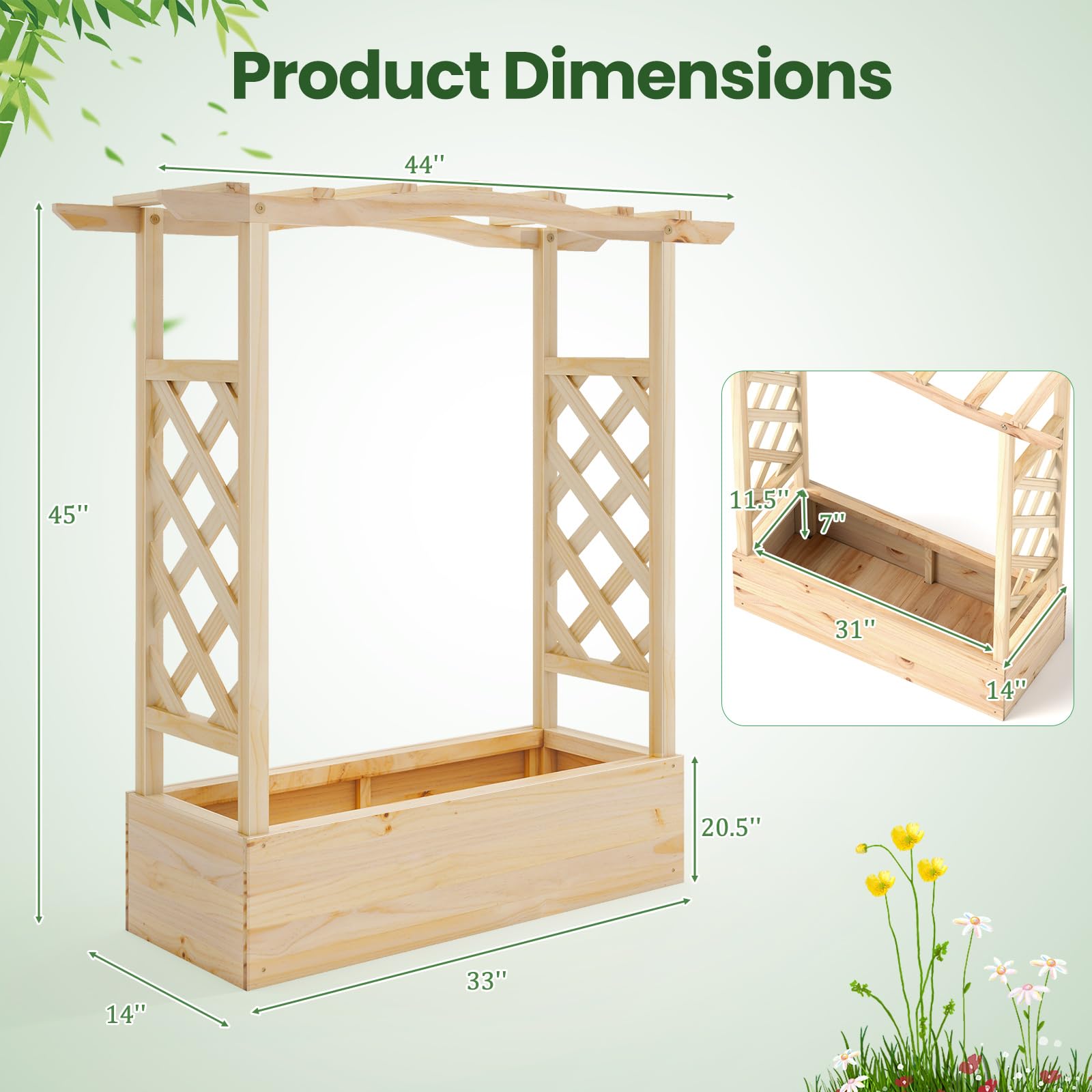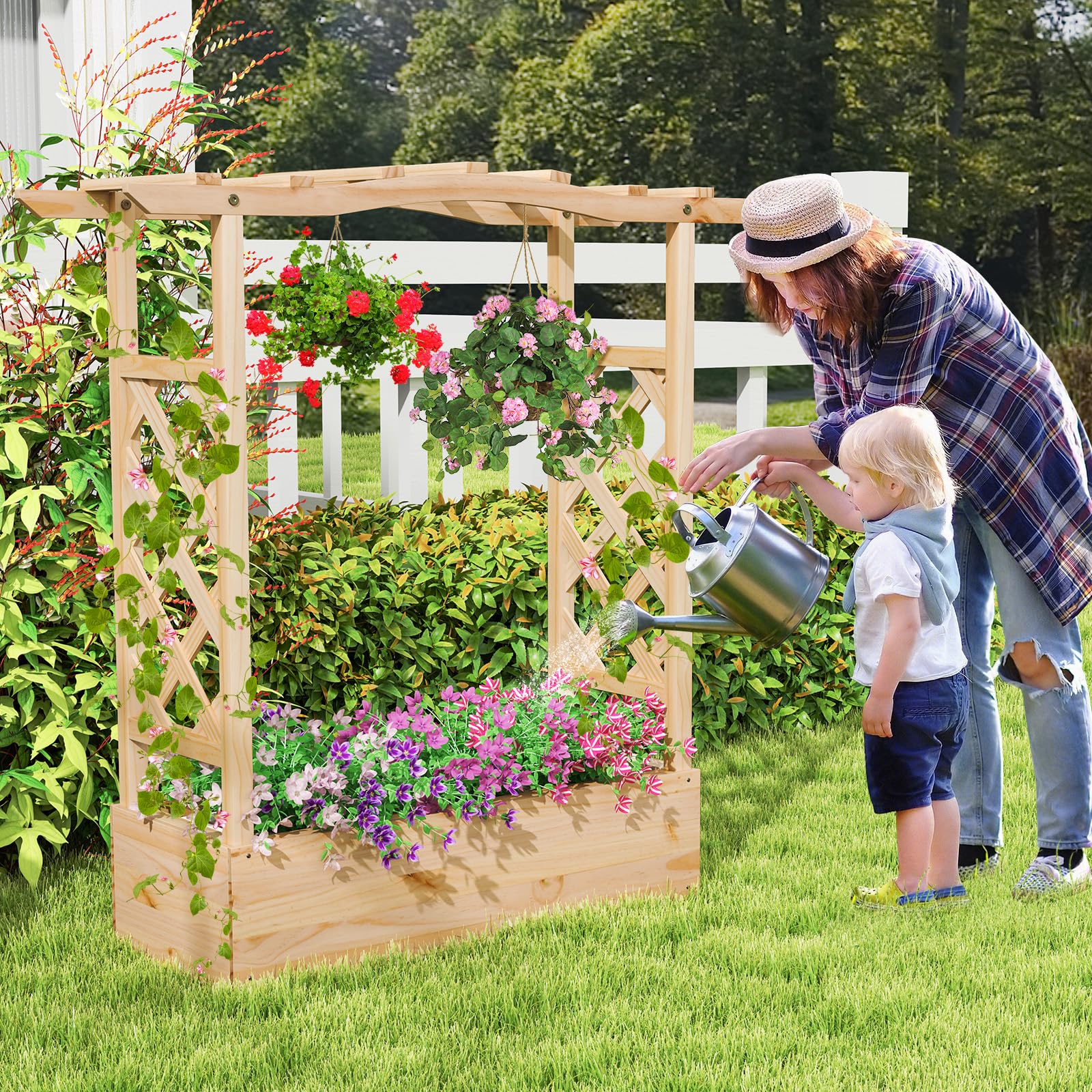 Are you looking for a versatile gardening solution that combines style with functionality? Our 3 in 1 raised garden bed is the perfect choice for you. It features a 7” deep planting box ideal for a variety of plants, two side trellises for vertical growth of climbing plants, and an extended hanging roof for potted plants or cozy vine spots. Designed to fit a wide range of plants including climbing vines, hanging pots, fruits, vegetables, herbs, and flowers, this garden bed is perfect for both indoor and outdoor settings. With its good drainage system, featuring bottom drainage gaps and removable panels, it ensures healthy root development and prevents root rot. Hence, our garden bed can fit perfectly in balconies, backyards, and gardens, adding a touch of greenery to your living space.