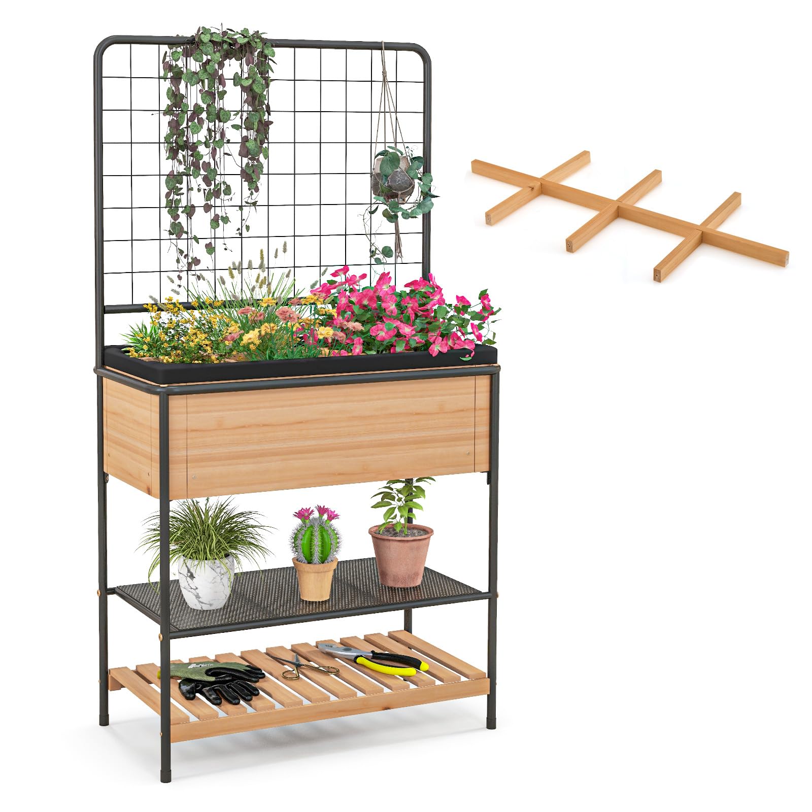 The raised garden bed features large planter box, which comes with a removable 8-grid divider, allowing you to customize the growing space. Therefore, you can grow different types of plants together or cultivate one of your favorites as needed. Besides, the trellis is perfect to supporting climbing plants or hanging decorations. As for the storage, metal mesh grid and wooden shelf at the bottom can hold kinds of gardening tools. Thanks to the durable fir wood construction, our planter box is less prone to warp and crack for long term use. Meanwhile, it is weather-resistant to withstand outdoor conditions. To form a healthy growing environment, a black liner is offered to keep the soil in place, while the drainage hole at the bottom helps to drain away excess water easily. The ergonomic elevated design prevents bending and kneeling, providing you a enjoyable planting experience.