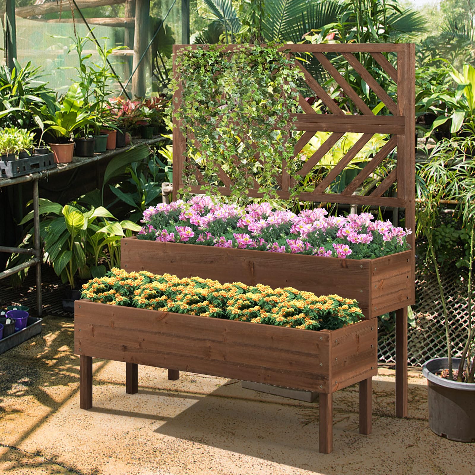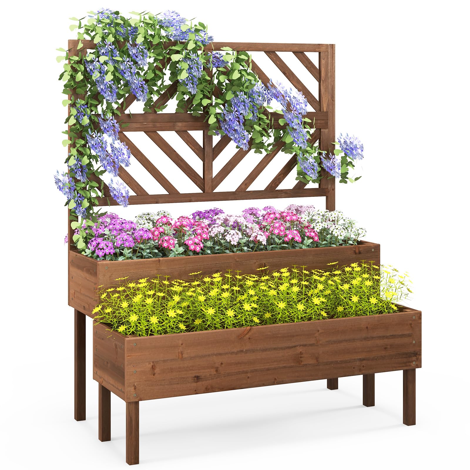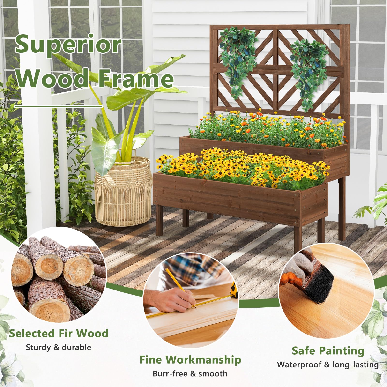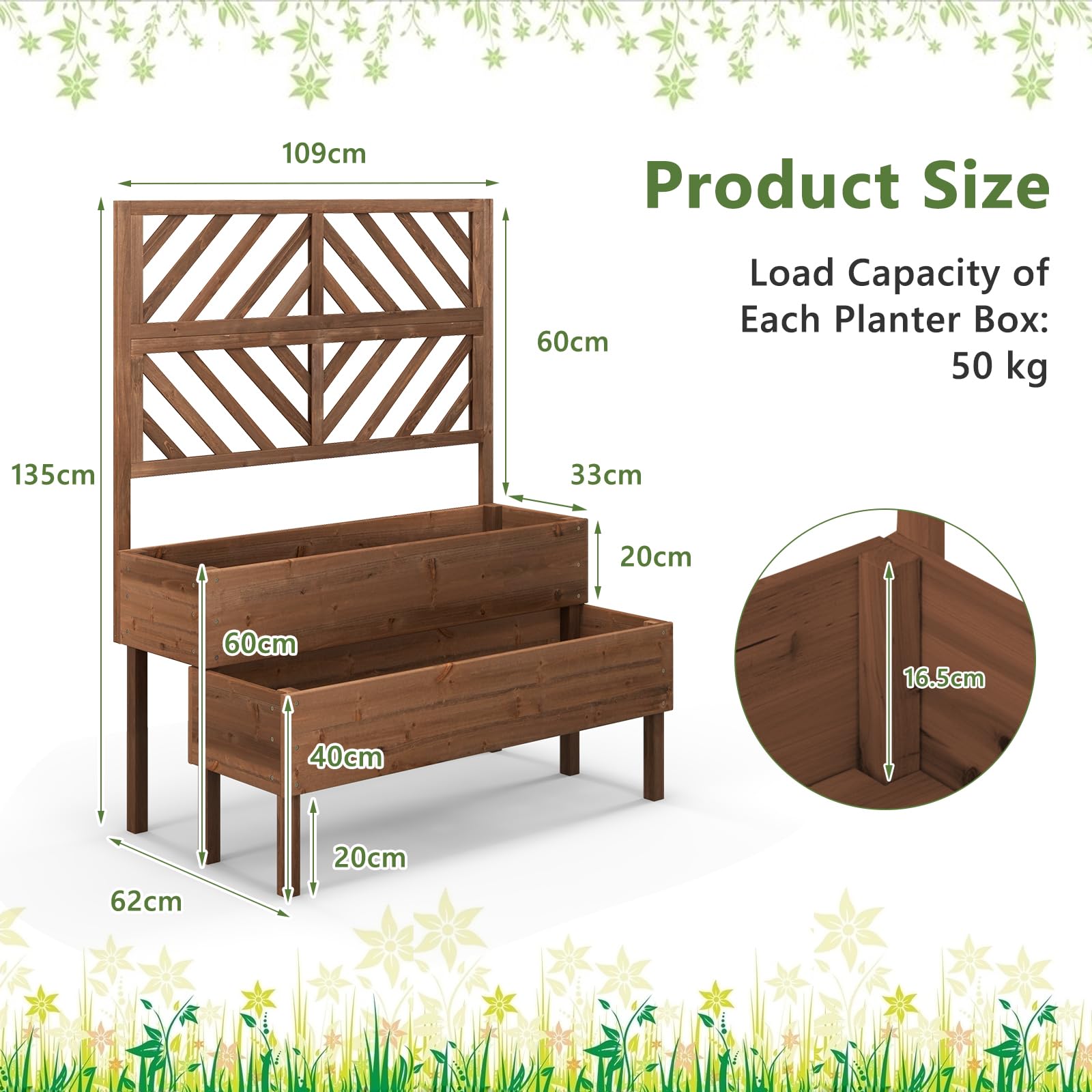Enhance the Elegance of Your Living Space with a Touch of Sophistication! Our innovative 2-in-1 raised garden bed features two spacious planter boxes, each measuring 43” x 13” x 8” (L x W x H), offering ample room for a diverse range of plants. The included trellis provides a perfect climbing space for plants and allows for the addition of decorations or hanging baskets. With thoughtful water drainage design, concerns about water accumulation or drought are easily alleviated. Crafted from 100% natural fir wood, this garden bed is resistant to deformation, weather damage, and ensures lasting durability, making it an ideal choice for both indoor and outdoor gardening. Not only does it provide an ideal environment for plant growth, but it also simplifies plant management.