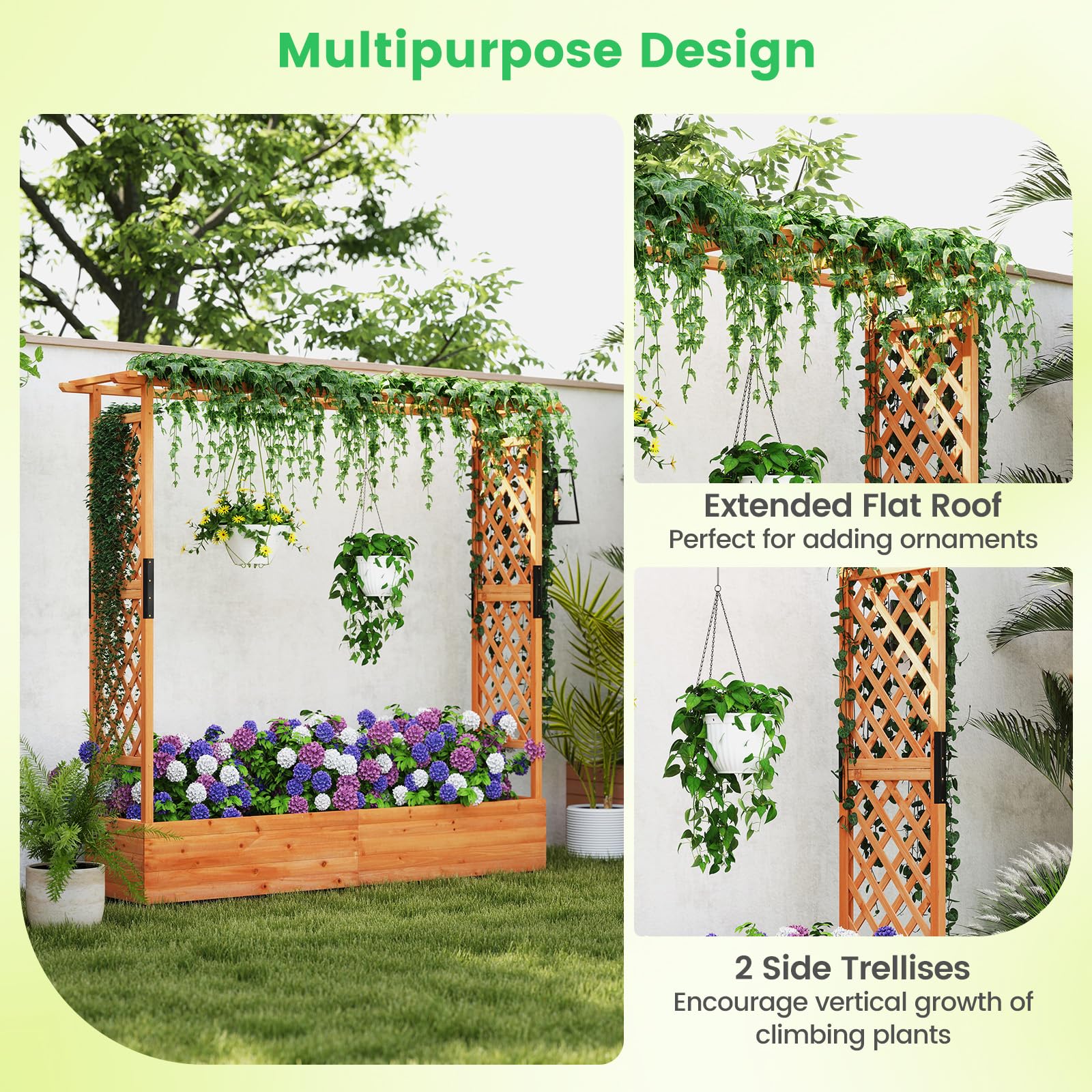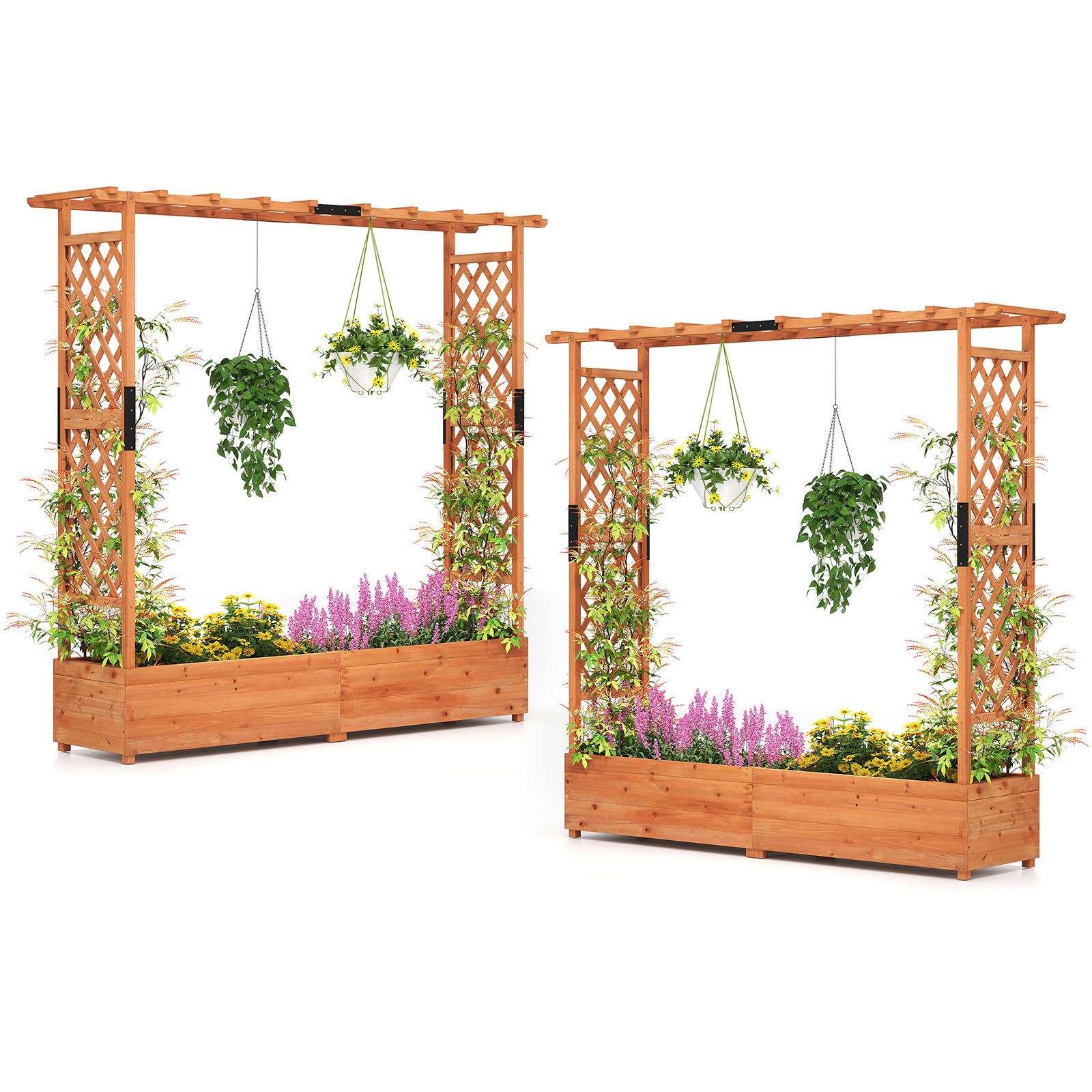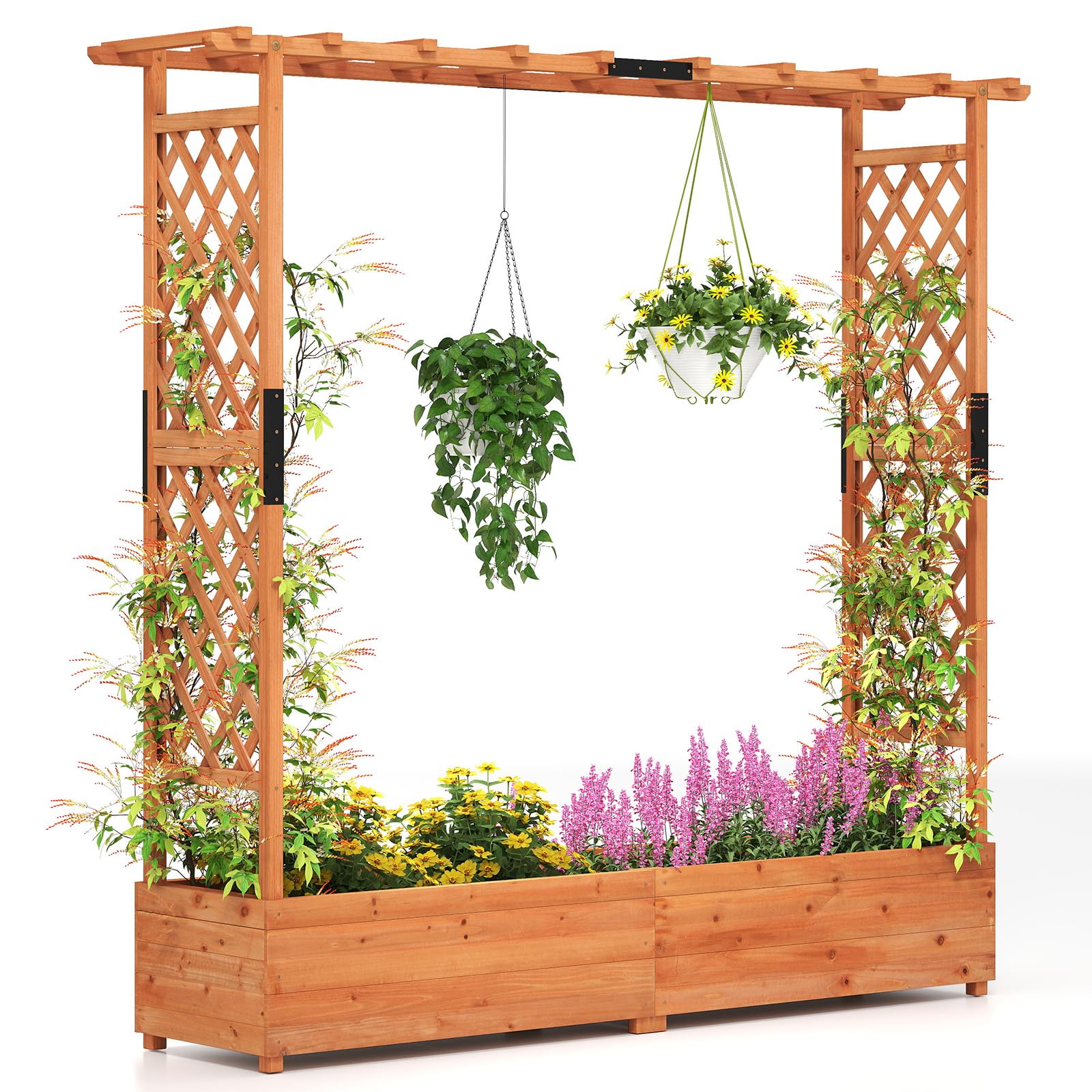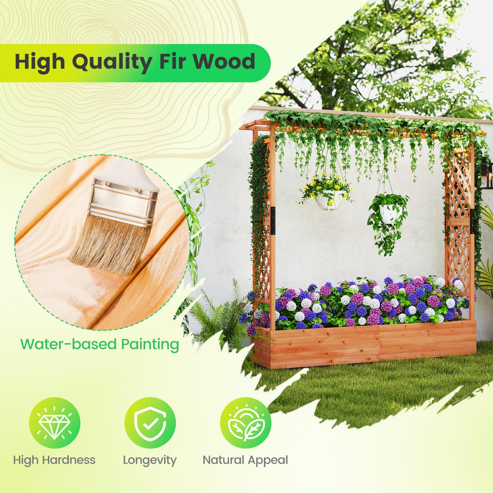 Discover the ultimate garden bed with a trellis, designed to elevate your gardening experience. Its versatile raised design includes a hanging roof, providing ample growing space for basket plants. The planter box is ingeniously divided, featuring 2 trellises that maximize gardening space. Crafted from solid fir wood, this frame is sturdy, durable and safe. With its all-weather painting, it is applicable to different outdoor occasions. The advanced drainage system, complete with drainage holes and bottom gaps, eliminates the worry of overwatering. Setting up this garden bed with trellis is a breeze with the provided clear instructions and hardware.