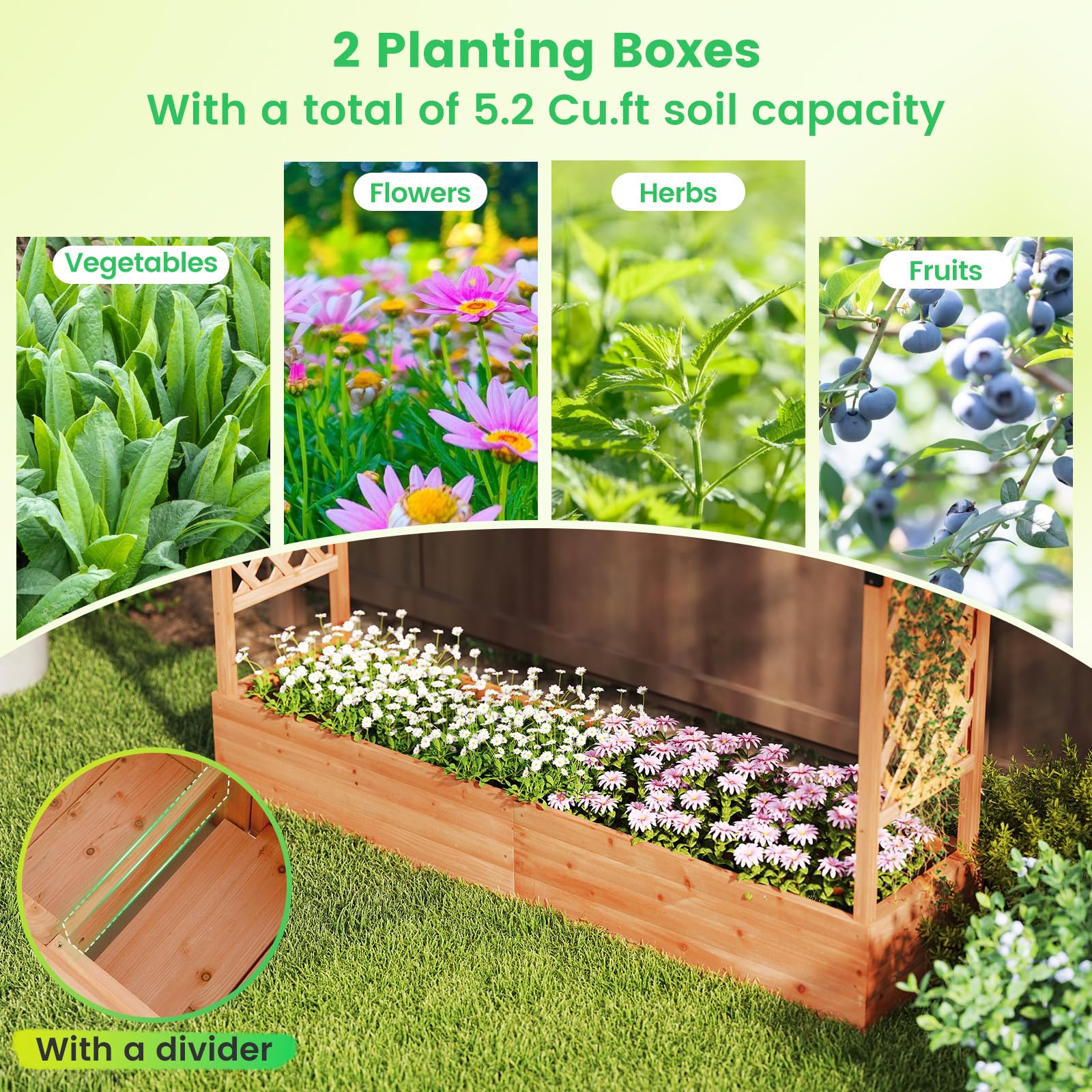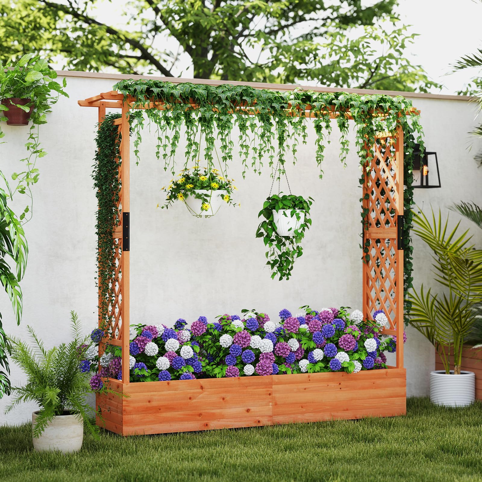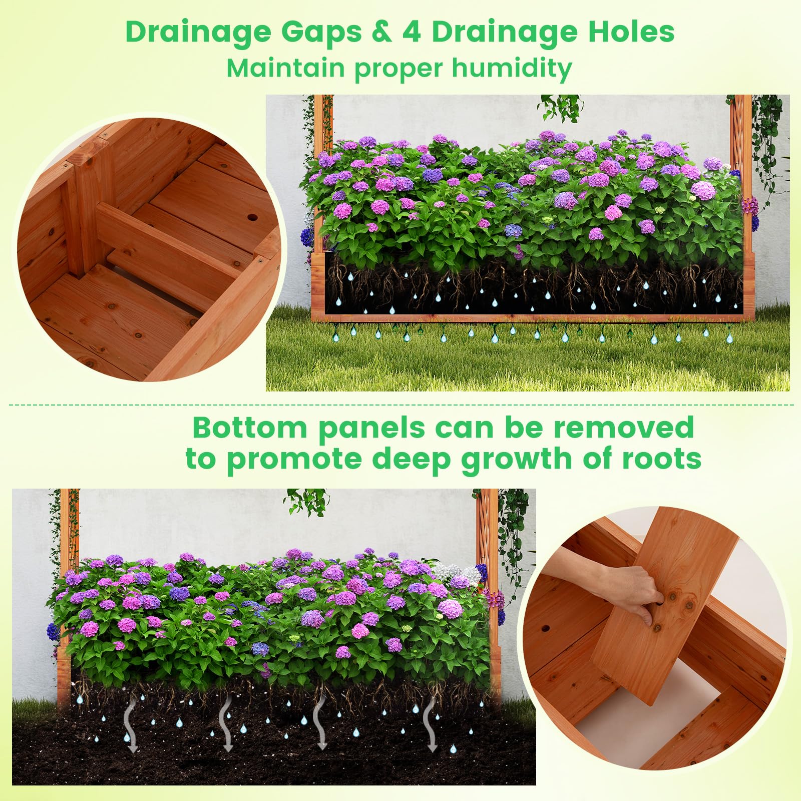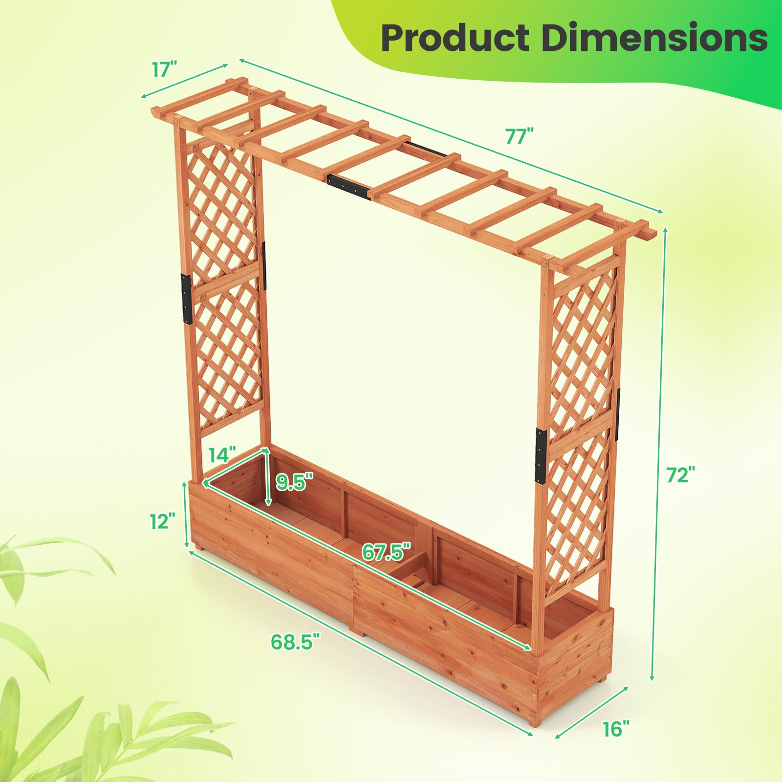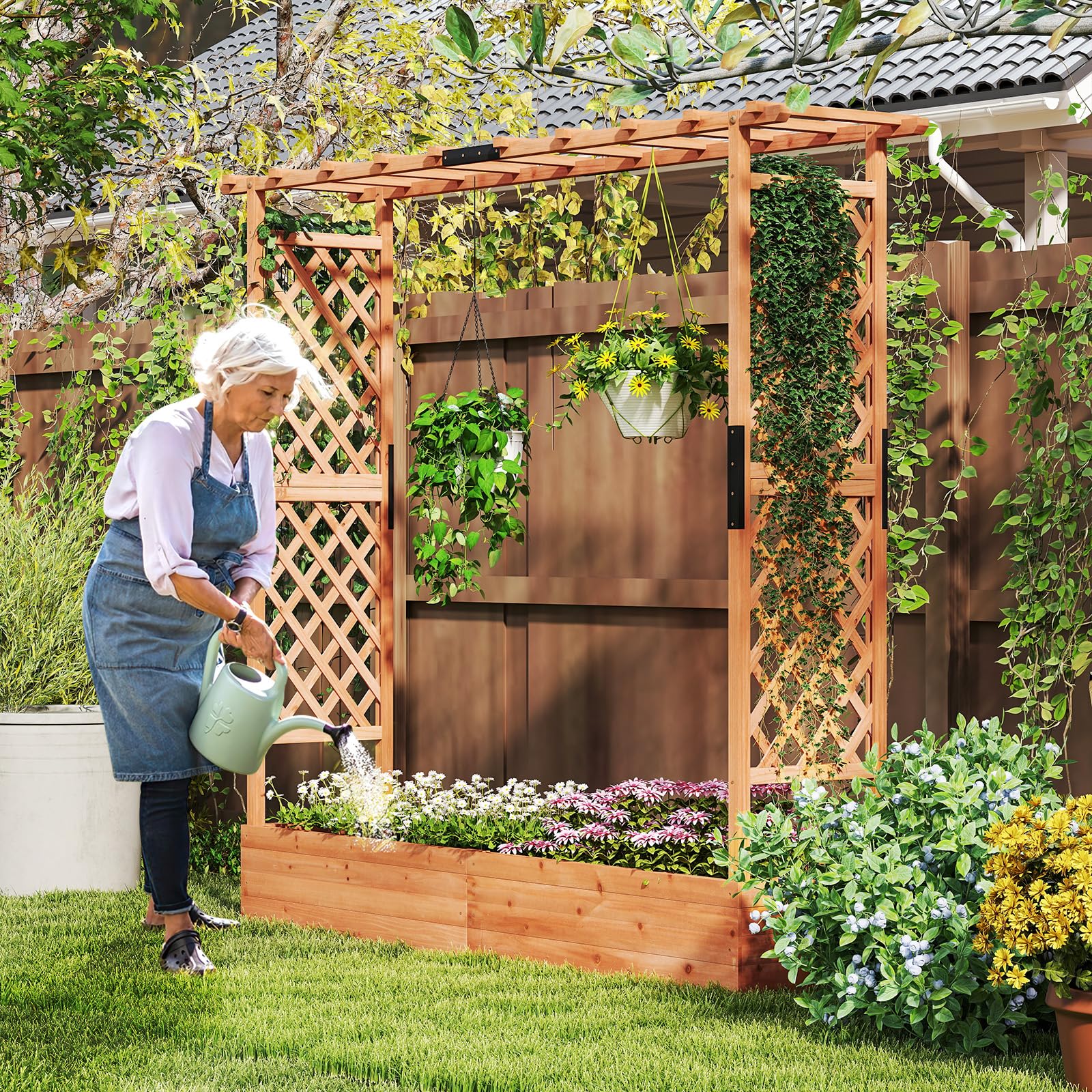 Discover the ultimate garden bed with a trellis, designed to elevate your gardening experience. Its versatile raised design includes a hanging roof, providing ample growing space for basket plants. The planter box is ingeniously divided, featuring 2 trellises that maximize gardening space. Crafted from solid fir wood, this frame is sturdy, durable and safe. With its all-weather painting, it is applicable to different outdoor occasions. The advanced drainage system, complete with drainage holes and bottom gaps, eliminates the worry of overwatering. Setting up this garden bed with trellis is a breeze with the provided clear instructions and hardware.