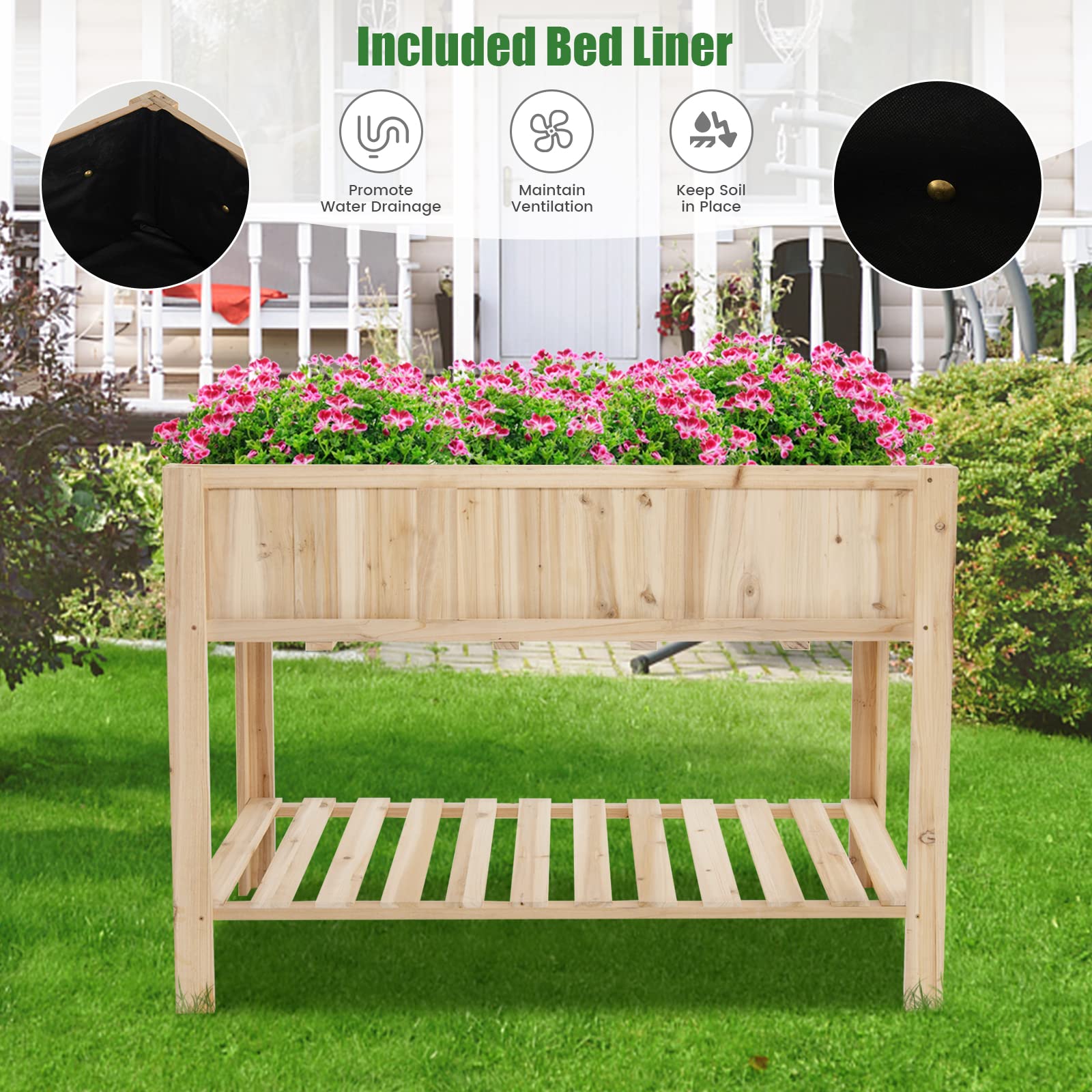 This wooden garden bed is made of natural quality fir, which can support a long service life. And its natural look will add a comfortable aesthetic to your balcony, garden, yard. The garden bed has a 5.5 cubic foot planter box, perfect for growing vegetables, herbs or flowers. And it is 35" tall for easy caring of plants without back pain. Besides, four reinforced bars at the bottom of the planter box make the structure more stable and can hold 309 lbs. In addition, there is a storage rack at the bottom of the garden bed, which provides additional storage space for your planting tools. The garden bed set also includes a liner that helps you separate the soil from the planter box for easy maintenance of cleanliness. And in order to reduce your assembly time, we also provide detailed instructions and videos to help you put them together quickly.