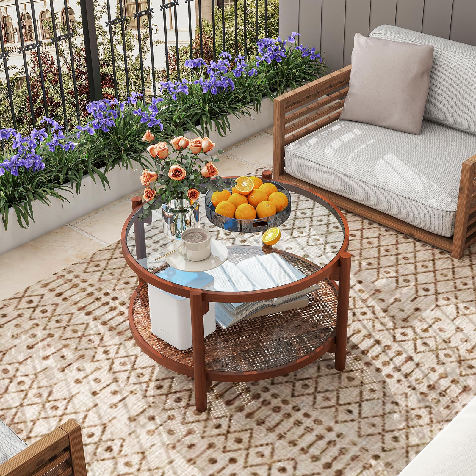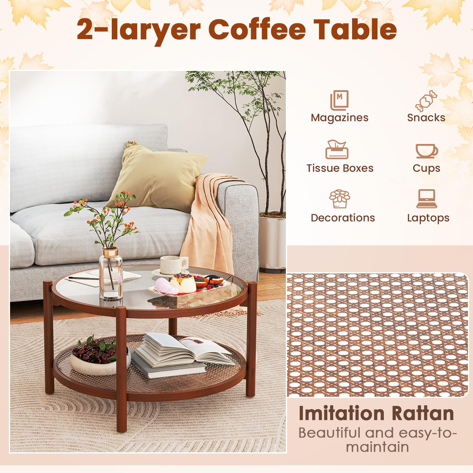 Our exquisite rustic coffee table with 2-tier design provides ample storage space for all your essentials. Crafted with a sturdy wood frame, the center table is designed to withstand daily use with ease. Capable of holding a total of 176 lbs, it offers both style and substance, making it a reliable furniture piece for various settings. Moreover, the enduring tempered glass tabletop not only enhances the visual appeal of the coffee table but also ensures easy cleaning. With a PE rattan shelf that is resistant to fading, this rustic coffee table is built to last. Whether you need a stylish centerpiece for your living room or a functional addition to your office, this center table fits the bill perfectly.