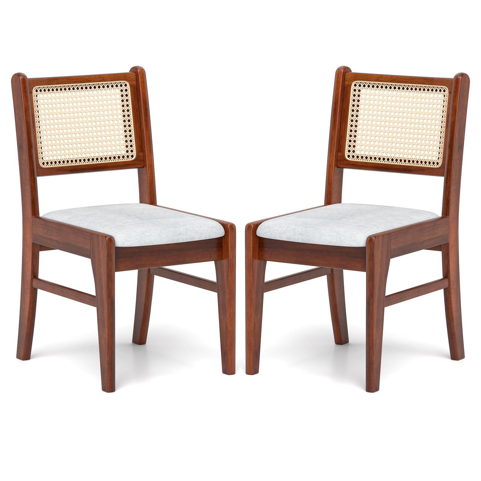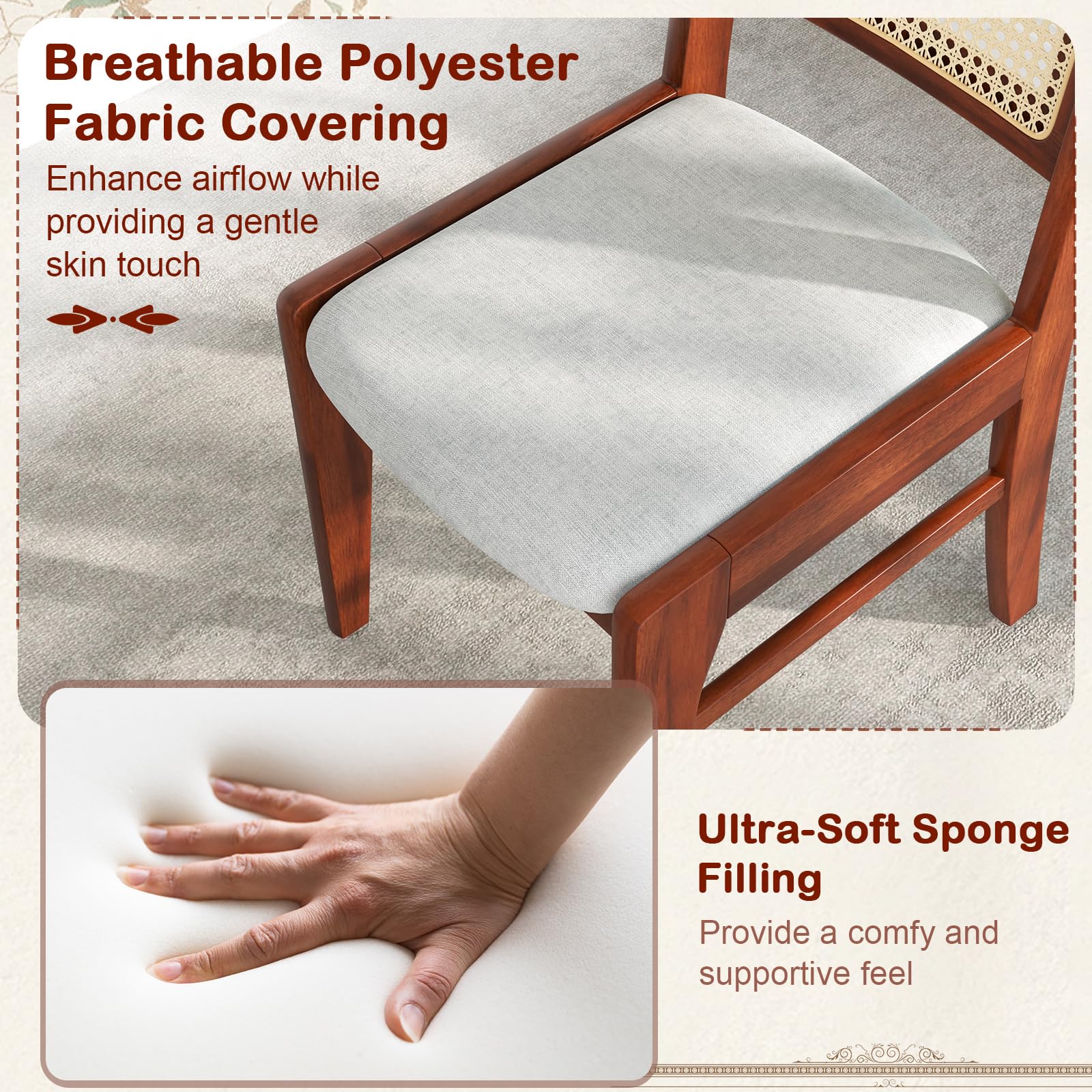 This wooden dining chair set features beautifully woven rattan backrests, which not only add a touch of sophistication but also ensure optimal ventilation for a pleasant seating experience. The seats with comfortable polyester upholstery offer superior comfort and support during meals. More than that, our chairs are supported by robust rubber wood frames, providing reliable stability for everyday use. With their elegant and stylish look, these mid-century modern wooden dining chairs could effortlessly blend into various decor themes, from modern to rustic.