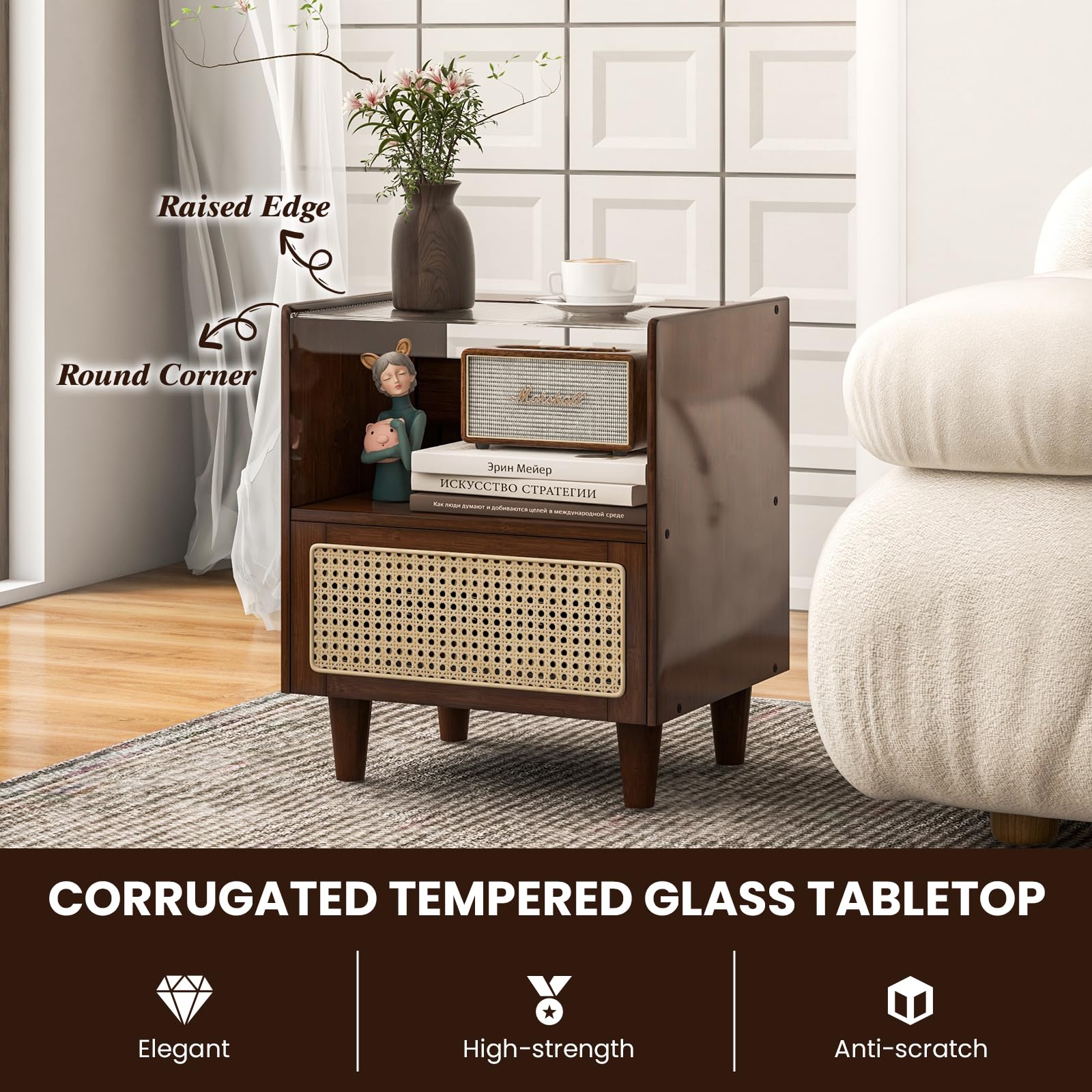 - Space Organizer]: Apart from that, this bedside table also features corrugated tempered glass tabletop, open compartment and practical rattan drawer, creating more storage space. And the raised edges prevent items from falling.