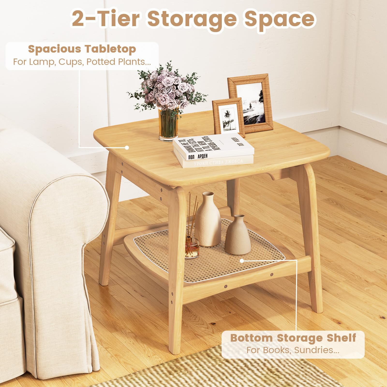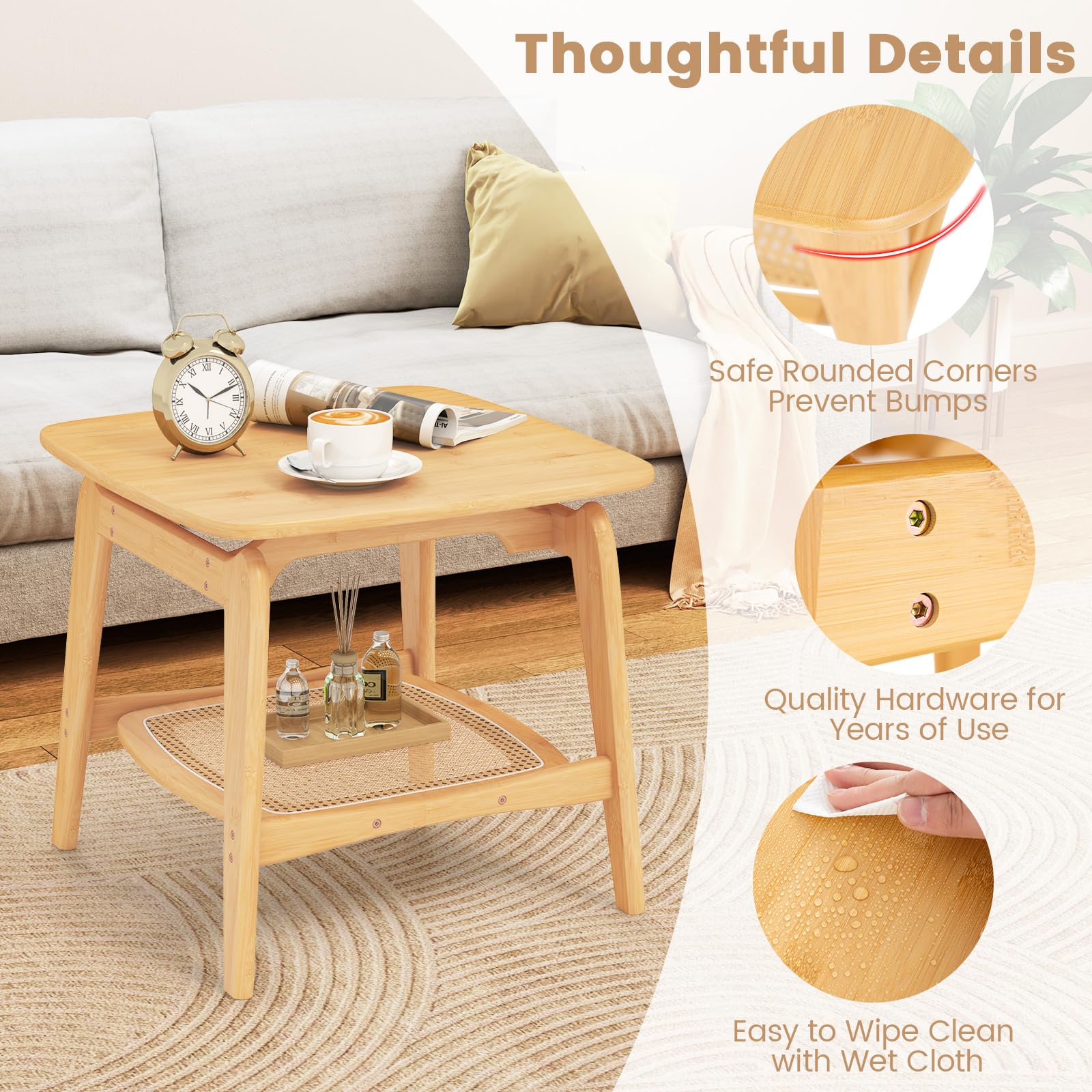 Featuring a bamboo frame and a woven faux rattan shelf, this table exudes mid-century modern appeal while seamlessly fitting into any interior. The 2-tier design offers a spacious top for showcasing your favorite items and a lower shelf for convenient storage. Its versatile style is perfect for various settings, from the living room to the balcony or office. Built with anti-slip footpads and rounded corners, it ensures stability and safety while protecting against bumps. Easy to assemble, this charming accent table will effortlessly elevate your space with its unique boho flair.