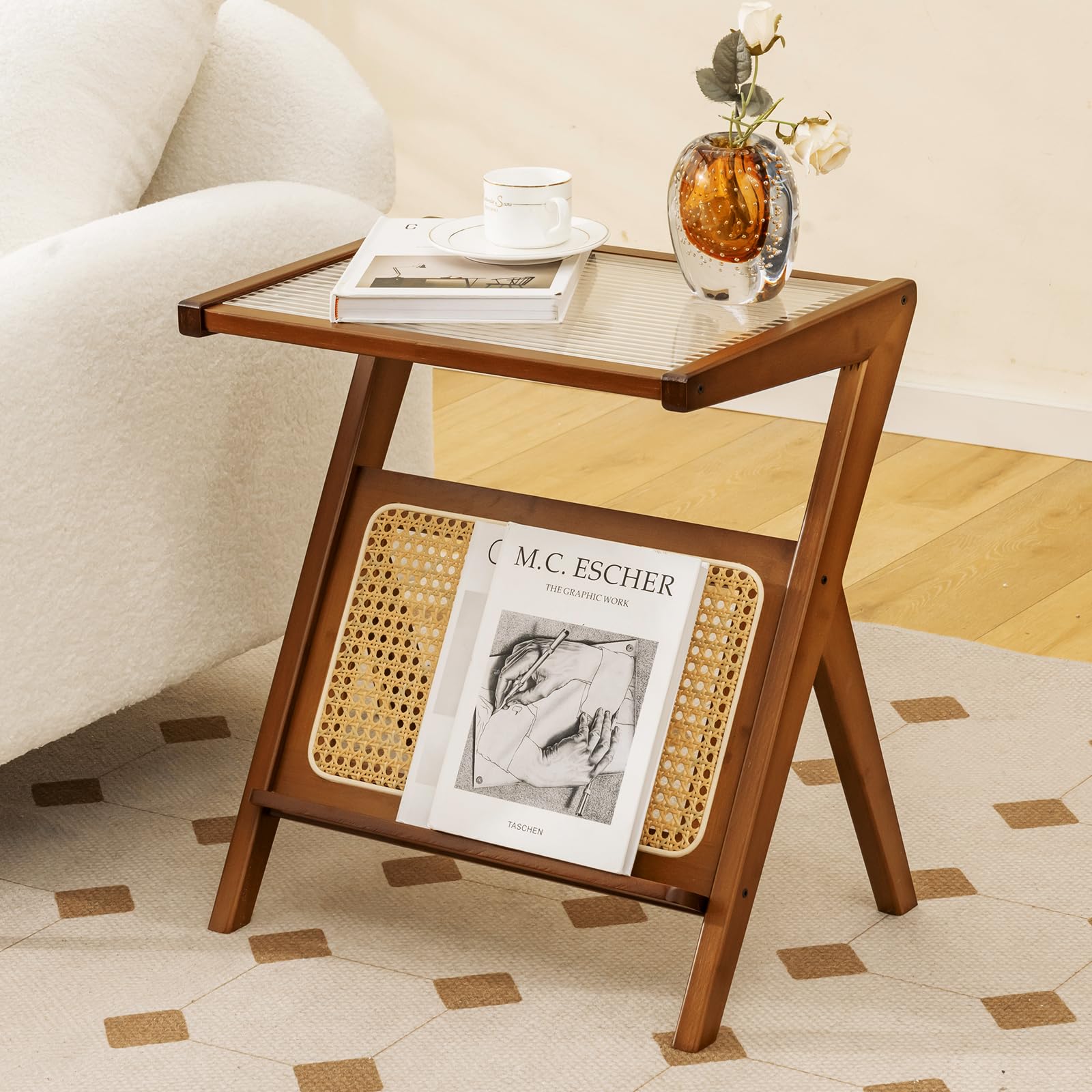 Experience the perfect blend of style and functionality with our exquisite bamboo end table. Crafted with a textured glass tabletop and a Z-shaped bamboo frame, it guarantees a long lifespan. Indulge in the rustic charm of the intricate hand-woven rattan shelf, complemented by a natural smooth finish that flawlessly complements any living space. Our cleverly designed L-shaped shelf doubles as a chic magazine rack, effectively decluttering your cozy haven. More details, like the felt foot pads, show our care for your comfort. Make a stylish statement in your apartment, dorm, or bedroom with our space-saving masterpiece.