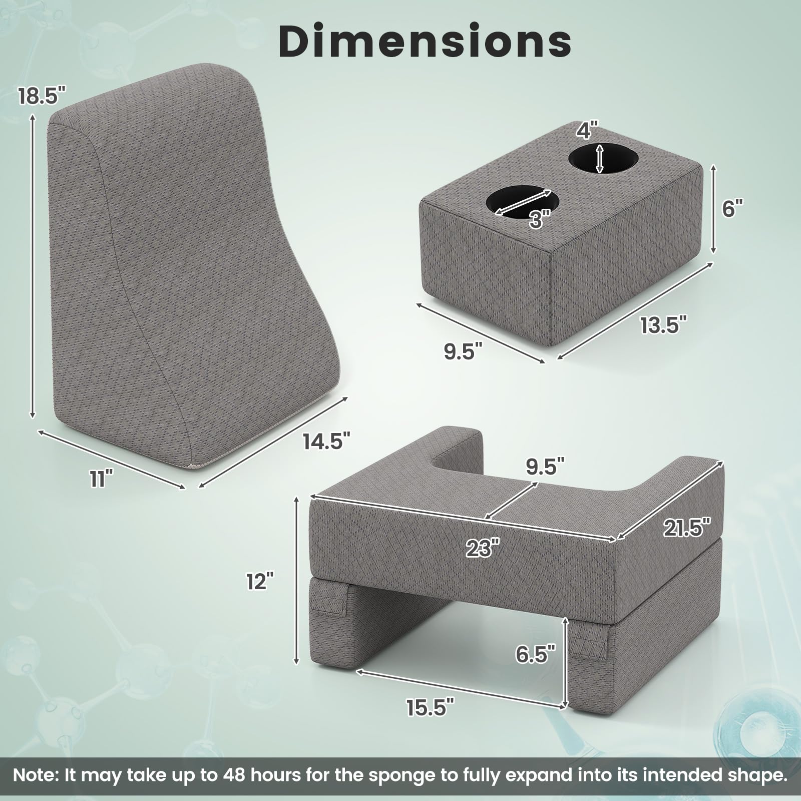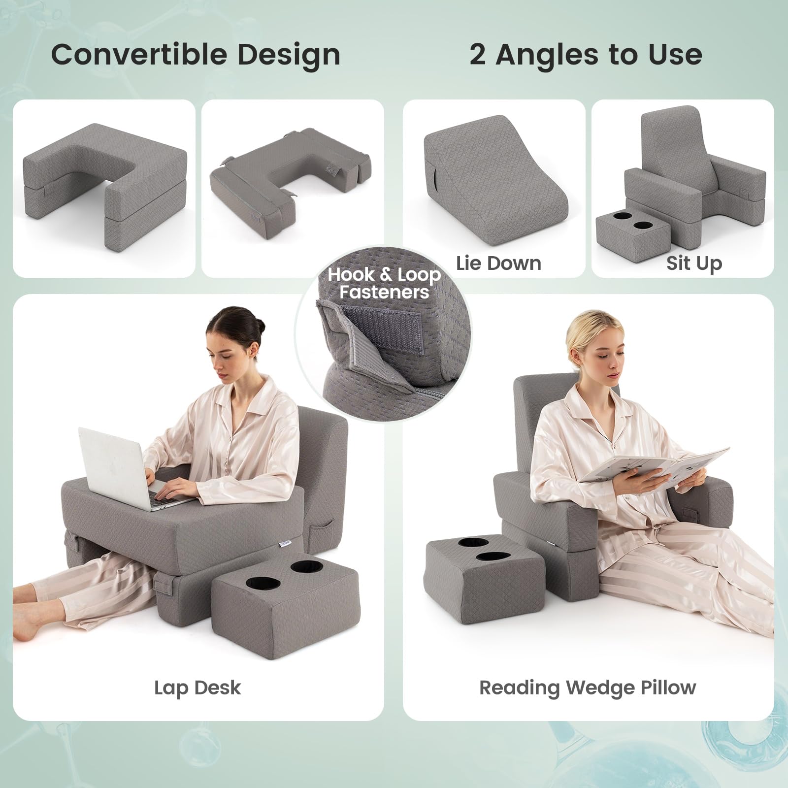 Dive into unmatched comfort with our deluxe reading pillow, expertly designed for endless hours of relaxation! Featuring an ergonomic back pillow with a contour that embraces you perfectly and an oversized lap desk supporting your arms and legs, comfort is simply unparalleled. The whole set, crafted with a high-density sponge, bounces back to life just 48 hours after unpacking. Enveloped in a breathable, skin-friendly fabric, removable for effortless washing, and topped with a non-slip base, this set ensures a hassle-free experience. Handy features like a side storage pocket and 2 cup holders mean everything you need is always within reach. Whether you're devouring your favorite book, leveling up in a game, or enjoying a movie marathon, our pillow set is the coziest companion for all your indoor escapades! Grab yours and revel in premium comfort!