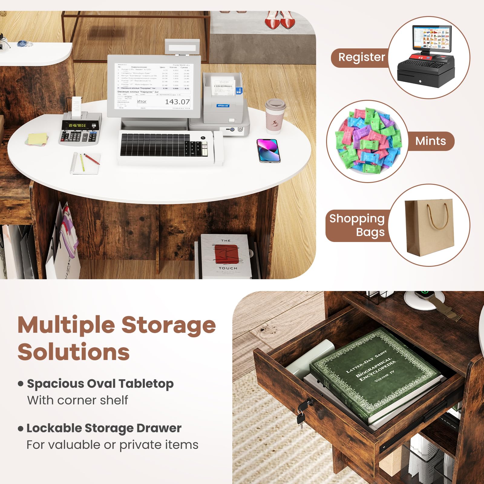 Transform your workspace with our multi-purpose reception desk! Grab your visitors’ attention with this expertly crafted desk that not only ensures supreme functionality but also enhances your decoration with its modern, seamless design. Featuring a spacious oval top and customized storage space, manage your workspace like a pro while keeping confidential items safe with its secure, lockable drawer. Built to last with sturdy, quality materials - and designed with non-slip foot pads- this front desk is a must-have for any bustling office or retail environment. Don’t settle for ordinary - upgrade to superior class and make this versatile reception desk the centerpiece of your professional space. Act now and redefine your work area with impeccable style and efficiency!