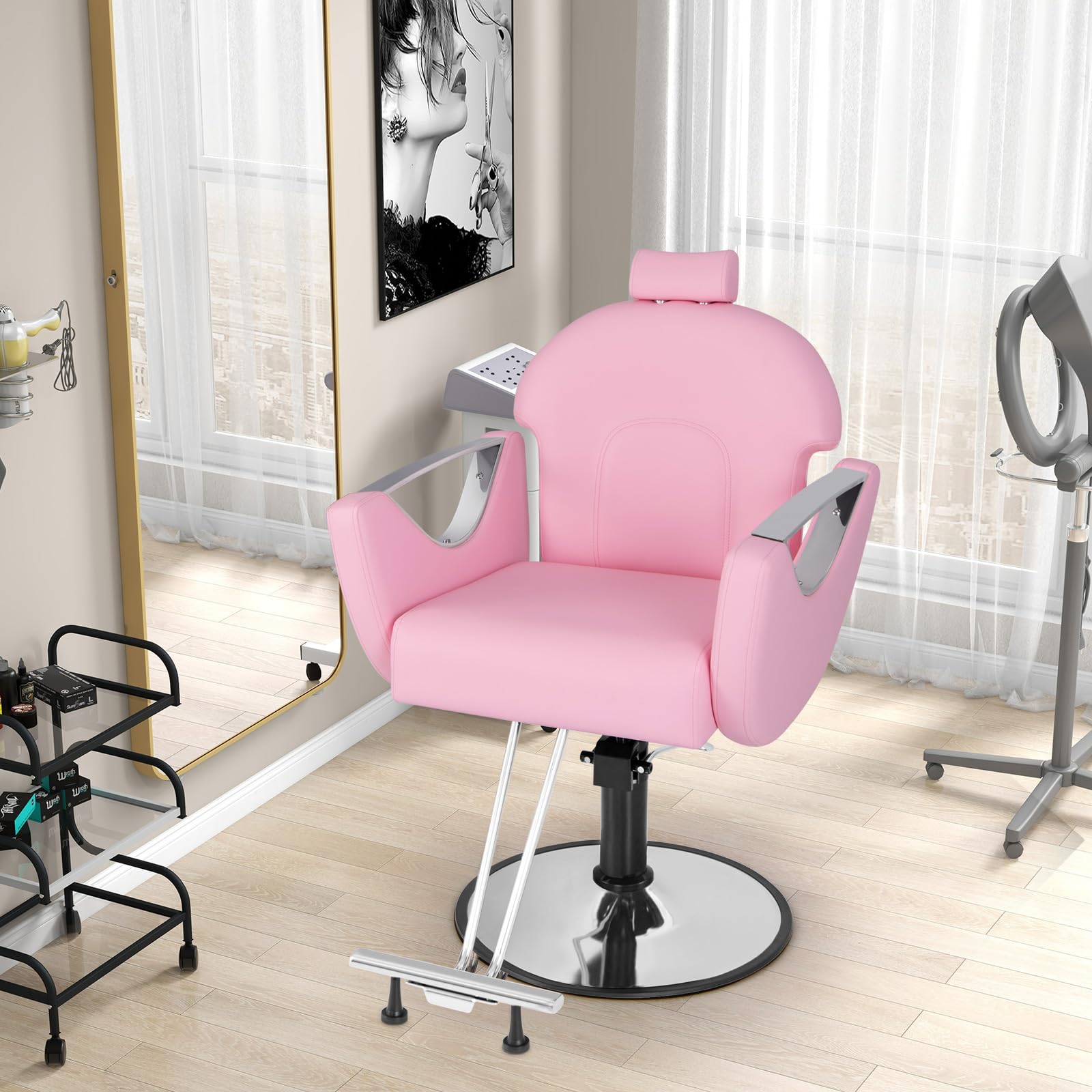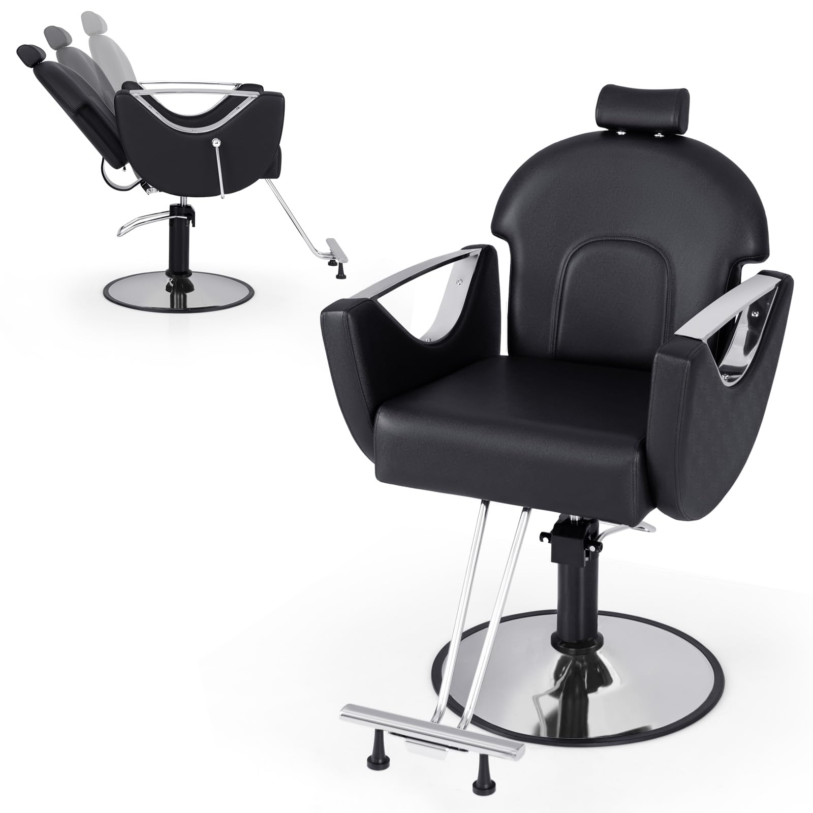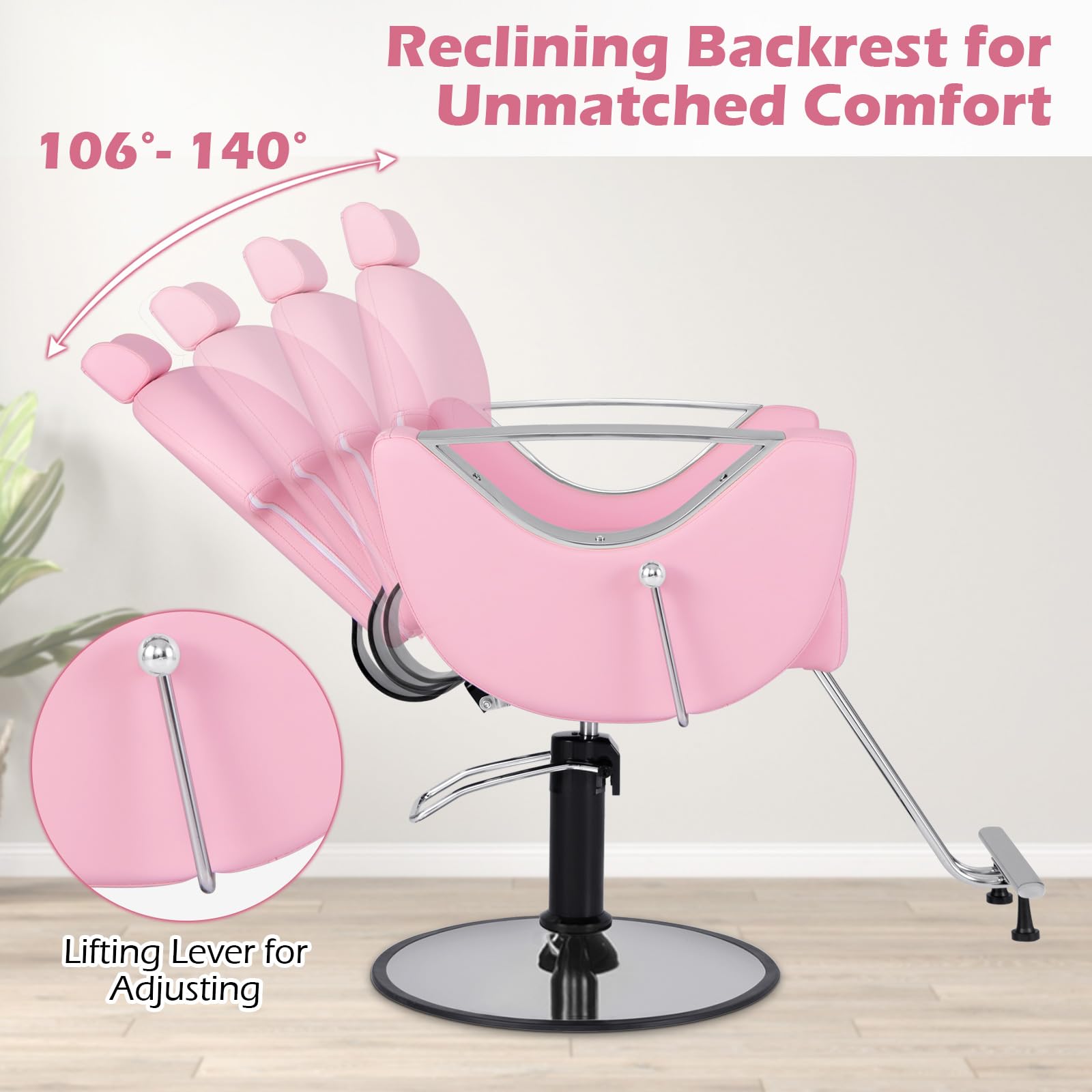Meet the ultimate in professional hair styling and barber shop equipment. Experience comfort and versatility with our barber chair, designed with a reclining range of 106° to 140°. The high-density sponge filling and premium PVC leather surface provide superior comfort and relaxation. This barber chair is built to accommodate a full spectrum of client needs, thanks to the adjustable seat height and detachable headrest with 6 optional positions. Moreover, enhanced functionality is evidenced in its 360° swivel design, making it simple for stylists to access all angles. Stability and durability are provided by its sturdy electroplating metal frame and large metal base. All in all, our hairdressing chair is suitable for various occasions, such as barber shop, beauty salon, cosmetic studio, and tattoo shop, etc.