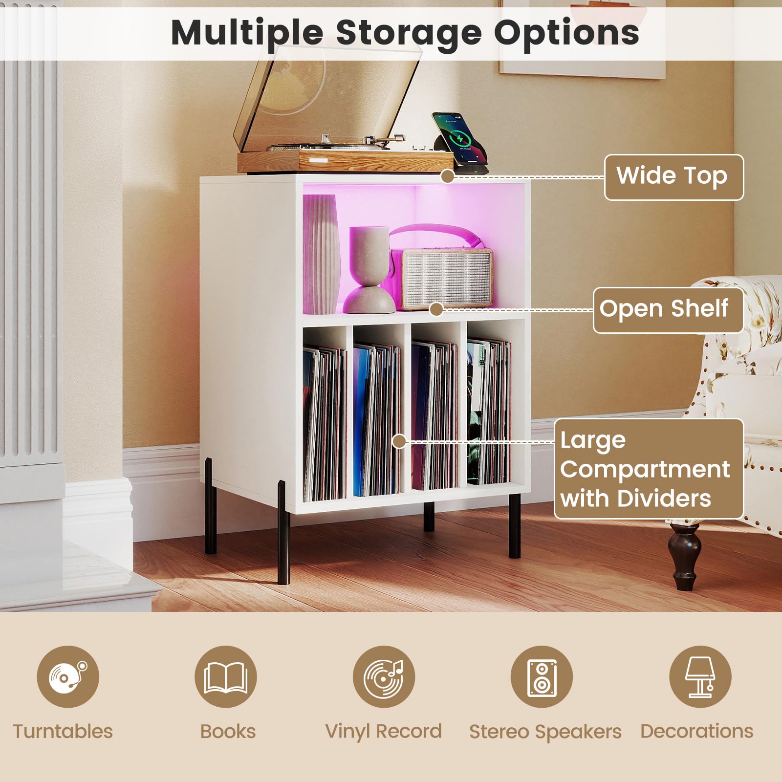 Not only does it provide a stable platform for your turntable, but it also elevates the ambiance with an integrated LED lighting system, which can be easily controlled via remote or smartphone app. Equipped with 2 power outlets, 1 USB port, and 1 Type-C port, along with a convenient cable management hole, you can effortlessly charge your devices while enjoying your favorite vinyl tunes. An additional open shelf offers ample space for accessories and audio equipment, while a vinyl storage holder beneath it keeps your record collection organized. Built with sturdy construction and featuring essential anti-tipping kits, this turntable stand ensures a secure and reliable way to showcase and enjoy your vinyl collection.