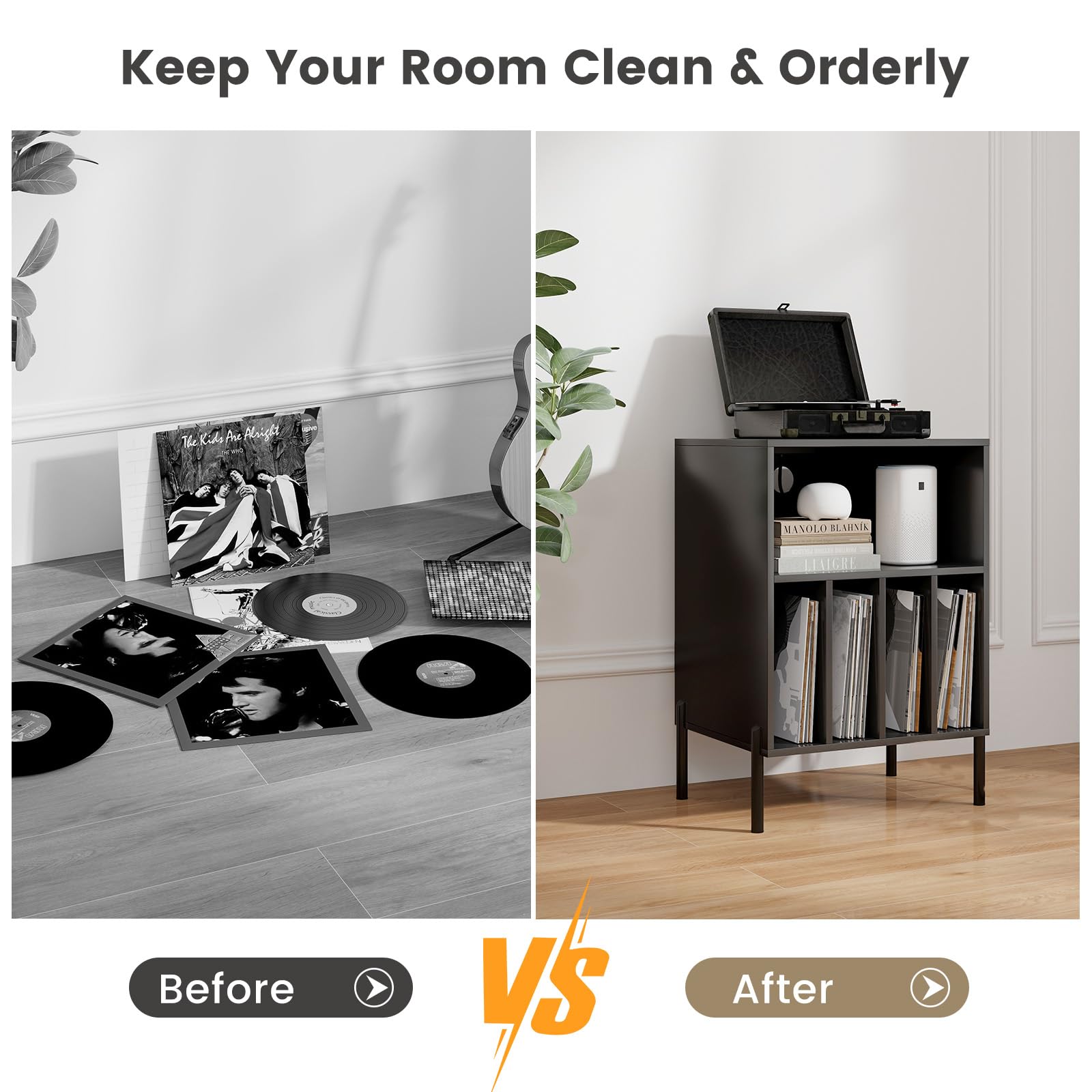 Whether you live in an apartment, dorm, RV, or home, this turntable stand will not take up too much space. Meanwhile, its modern and stylish appearance fits most of your home decoration. Apart from being used as a record shelf, this turntable stand can also be used as a nightstand or end table. It comes with more thoughtful details such as a big open shelf and 4 long storage spaces, which offer you adequate storage space for records, albums and CDs, magazines, and collectibles. Besides, this turntable stand has 2 power outlets and 2 USB and 1 Type-c ports for you to charge record players and other electronic devices. And the surface is waterproof and fine-polished, so you can easily clean it with a wet cloth.