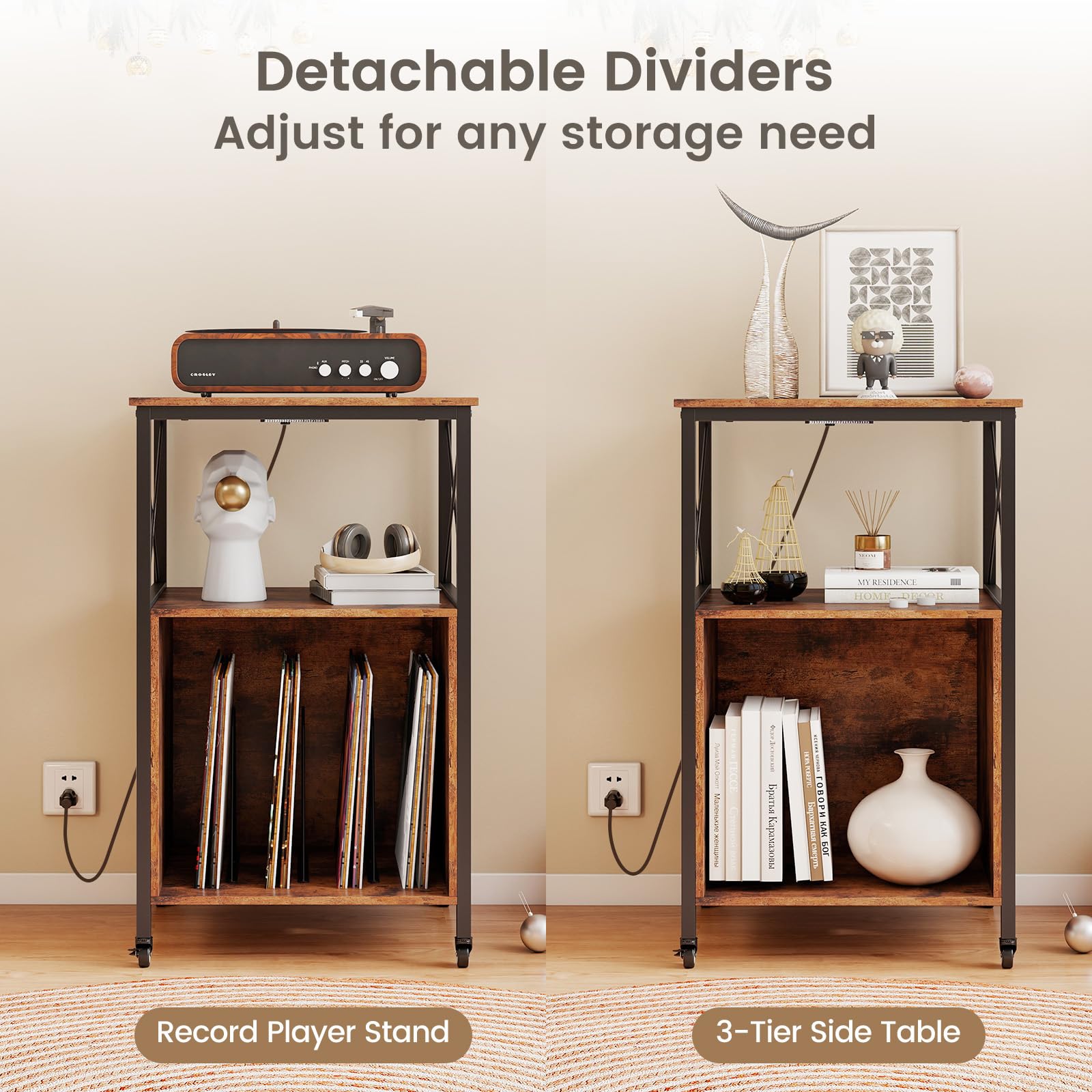 Elevate your audio experience and organize your vinyl collection in style! The turntable stand is equipped with recessed power strip to charge devices easily. The wide top and open shelf perfectly accommodate your record player. Below, a compartment with detachable dividers provides versatile storage solutions for vinyl records. To enhance convenience, the record player stand is mounted on wheels for easy positioning. Its robust metal construction provides a stable platform for your audio equipment and essentials. Al in all, this mobile vinyl record storage holder is an essential addition for music enthusiasts.
