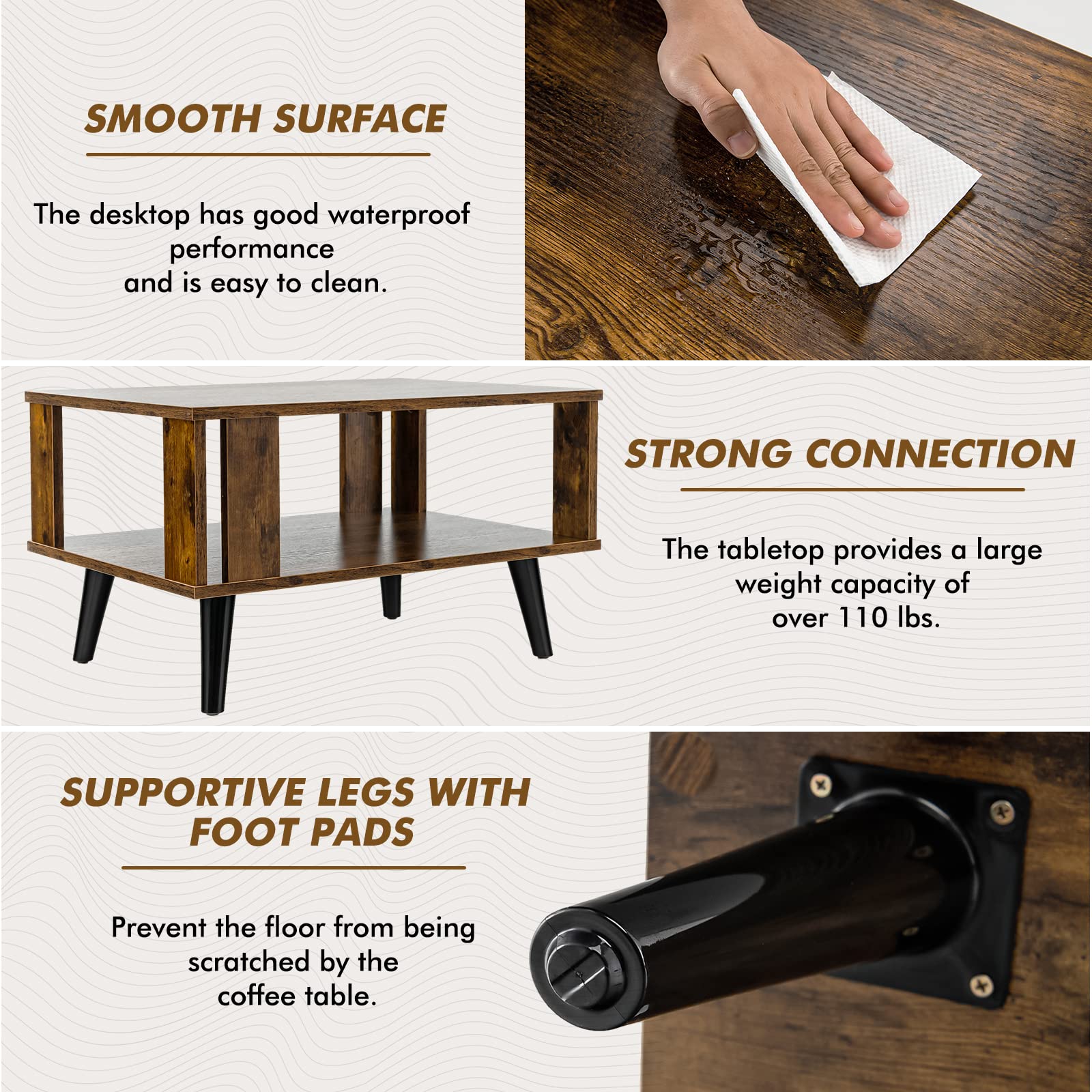 High-quality engineered wood ensures stable construction of the coffee table