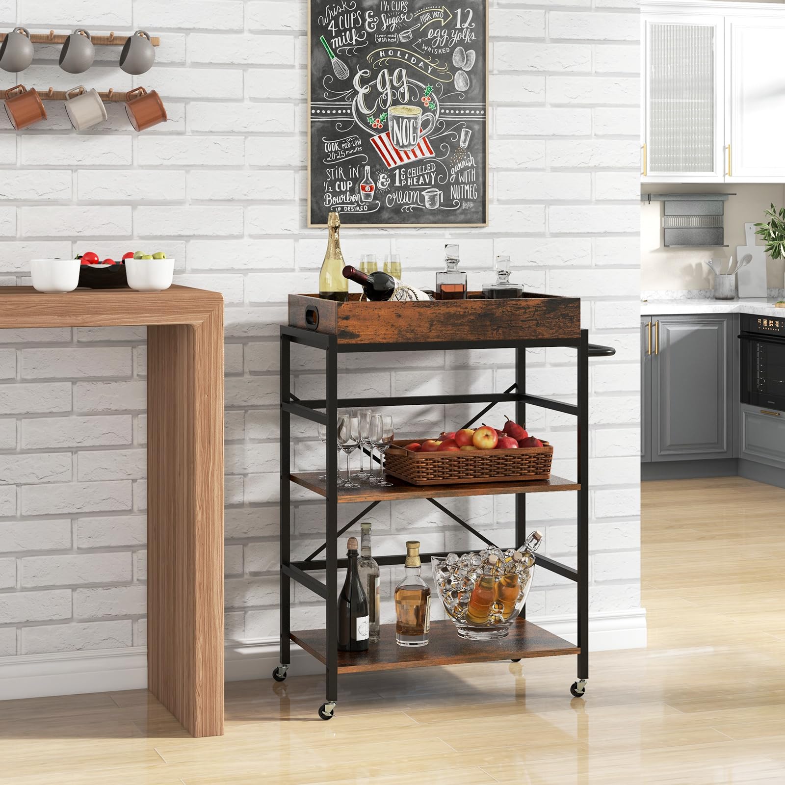 Featuring 3 open storage tiers, it offers plenty of space for wines, fruits, snacks, tableware, and more. The removable tray with 2 side cut-out handles makes serving a breeze. Additionally, this rolling kitchen cart is equipped with 4 lockable universal casters and a convenient metal handle for easy movement. The wheels can be removed to convert it into a stationary storage shelf if desired. Crafted with a heavy-duty metal frame and thickened boards, this cart offers reliable strength and stability. Enhance your space with this industrial bar cart that seamlessly blends functionality with style.