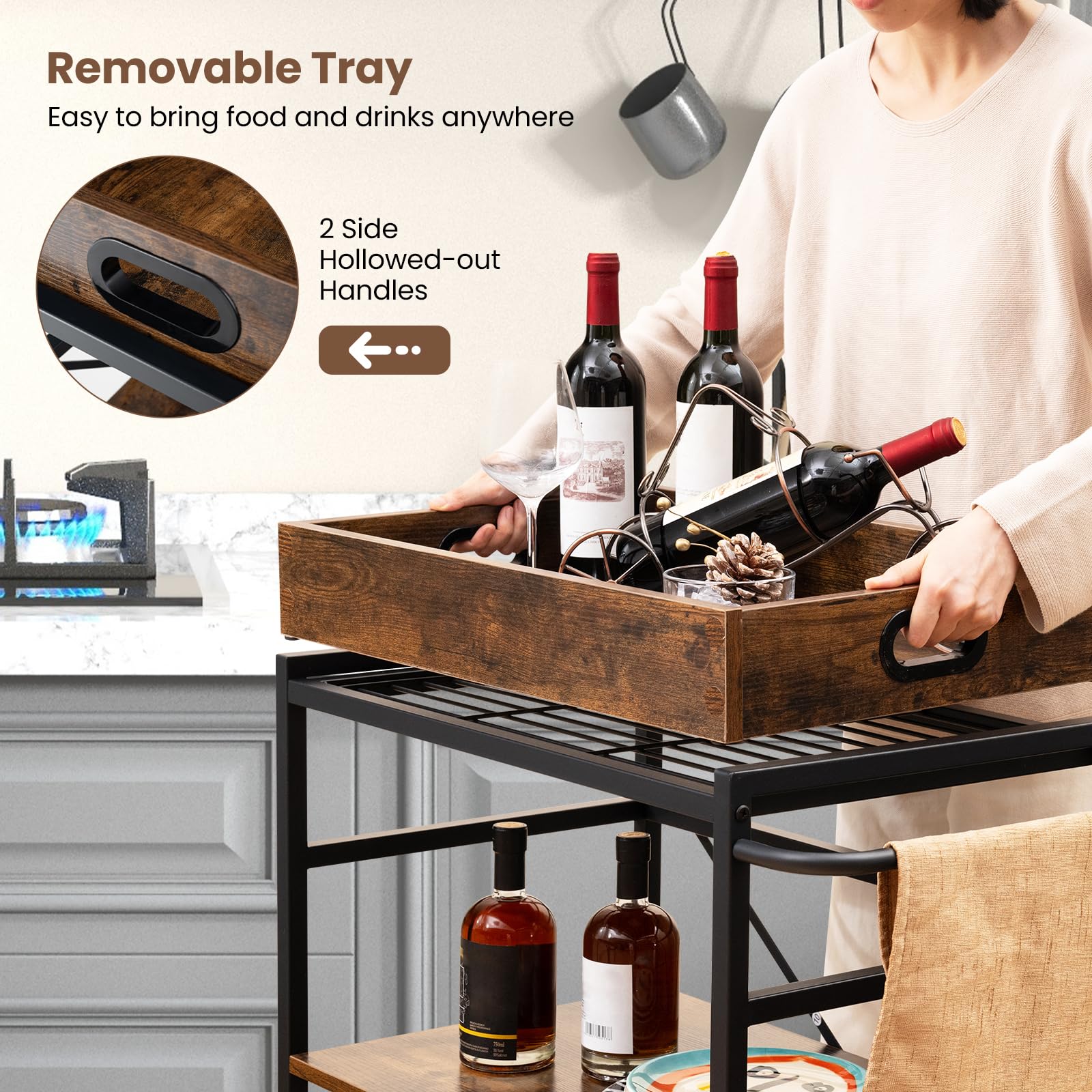 - [Convenient Removable Tray]: This bar cart features a removable food tray with 2 side hollowed-out handles, allowing you to easily transport food and drinks anywhere. Additionally, the metal shelf beneath can be positioned on the top or bottom tier based on your needs.