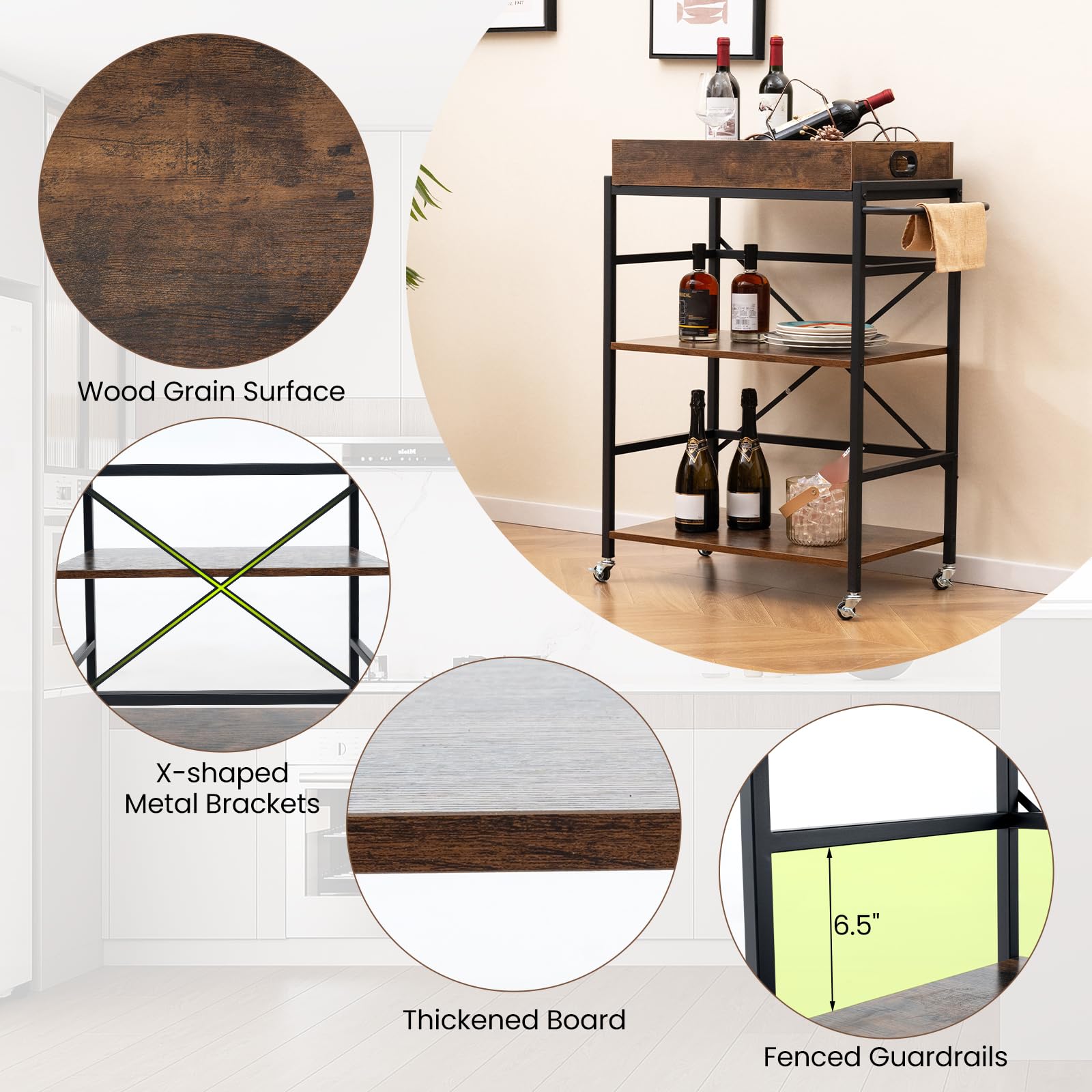 - [Industrial Style for Any Setting]: The rustic brown wood grain surface combined with black metal frame adds an industrial charm, making this rolling utility cart a stylish addition to any setting. It’s perfect for kitchens, dining rooms, bars, restaurants, and more.