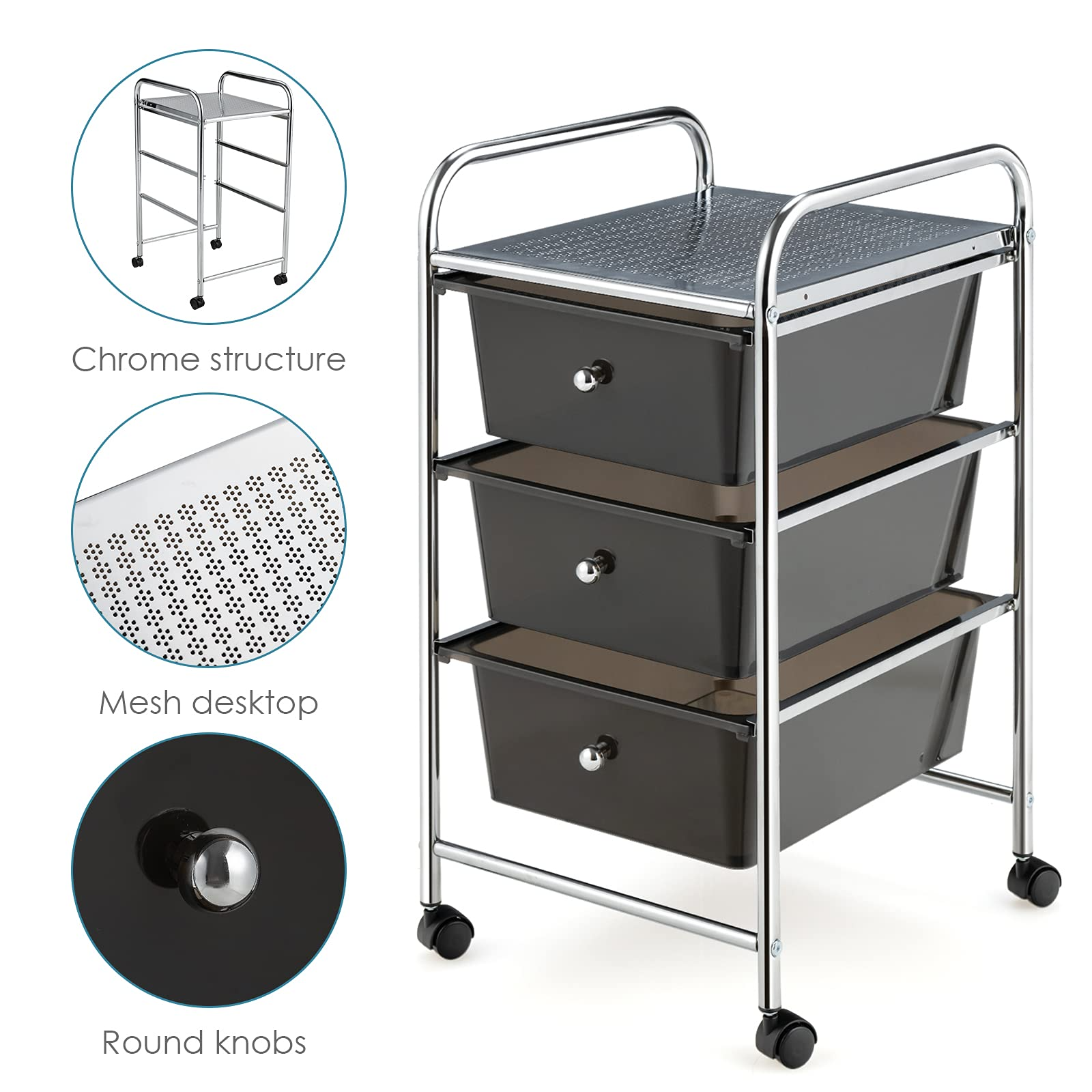 This is our brand new 3- drawer storage trolley cart which offers a stylishsolution for organizing and storing your items easily. This versatile cart isconstructed from a sturdy chrome plated steel frame and includes 3 slidingdrawers and 4 black casters for added mobility. What's more, it has two griphandles for convenient handling. In addition, the metal panel on the top canput things and have a good protection of the drawers. Don't hesitate to buy itnow!