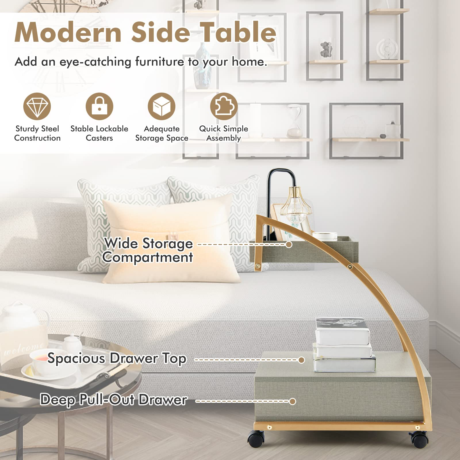 The 2-tier side table features a unique C-shaped frame integrates 3 storage spaces, including a tray top, an open storage shelf and a drawer, which can well keep your items in order. What's more, there are 4 smooth casters to achieve flexible movement. Meanwhile, 2 wheels with brakes allow the side table to remain stationary while in use.?Therefore, you can use this side table in various rooms, using it as a bedside table, sofa table, snack cart or coffee table. Moreover, composed of a sturdy steel frame and durable material, the cart has a total weight capacity of 44 pounds. In addition, this side table has a sleek, modern design with gray linen-like surface and gold frame. It is definitely a practical and beautiful addition to your living space.
