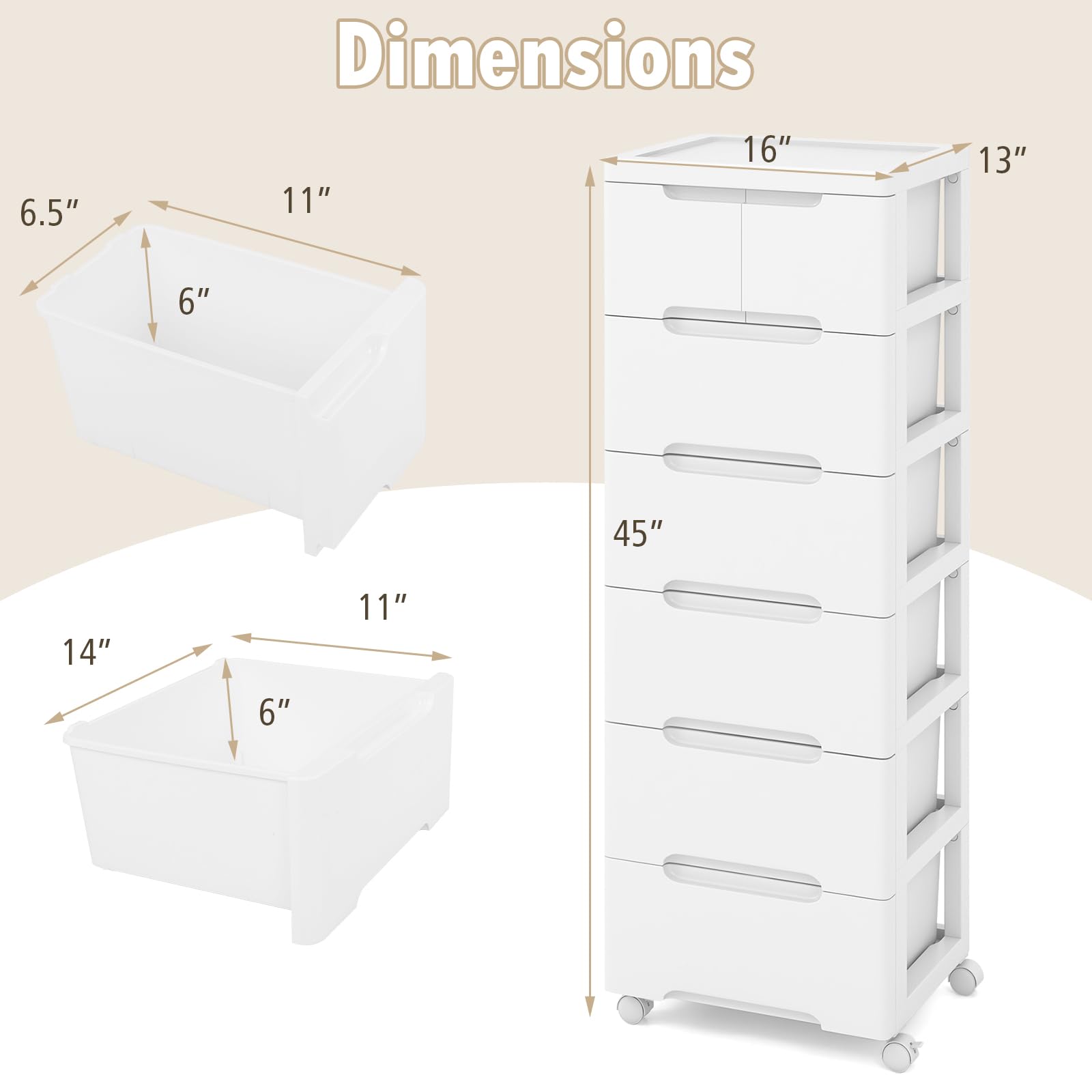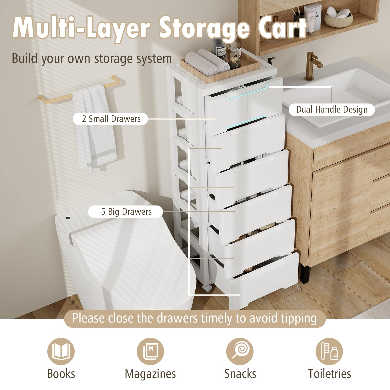 • [Ideal Storage Solution]: Keep your home clutter-free with the rolling storage unit that features a combination of wide cabinet top and 7 drawers. It is perfectly tailored to store your books, magazines, snacks or toiletries. Please close the drawers timely to avoid tipping.