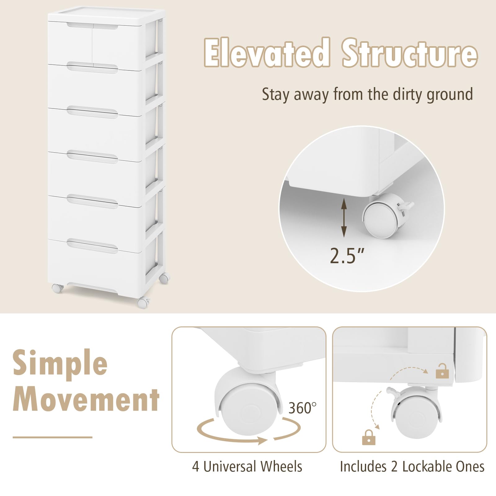 • [Mobile Convenience]: Equipped with smooth, universal wheels, the mobile storage organizer easily glides from room to room. And 2 lockable wheels add stability when stationary, offering the perfect blend of mobility and security.