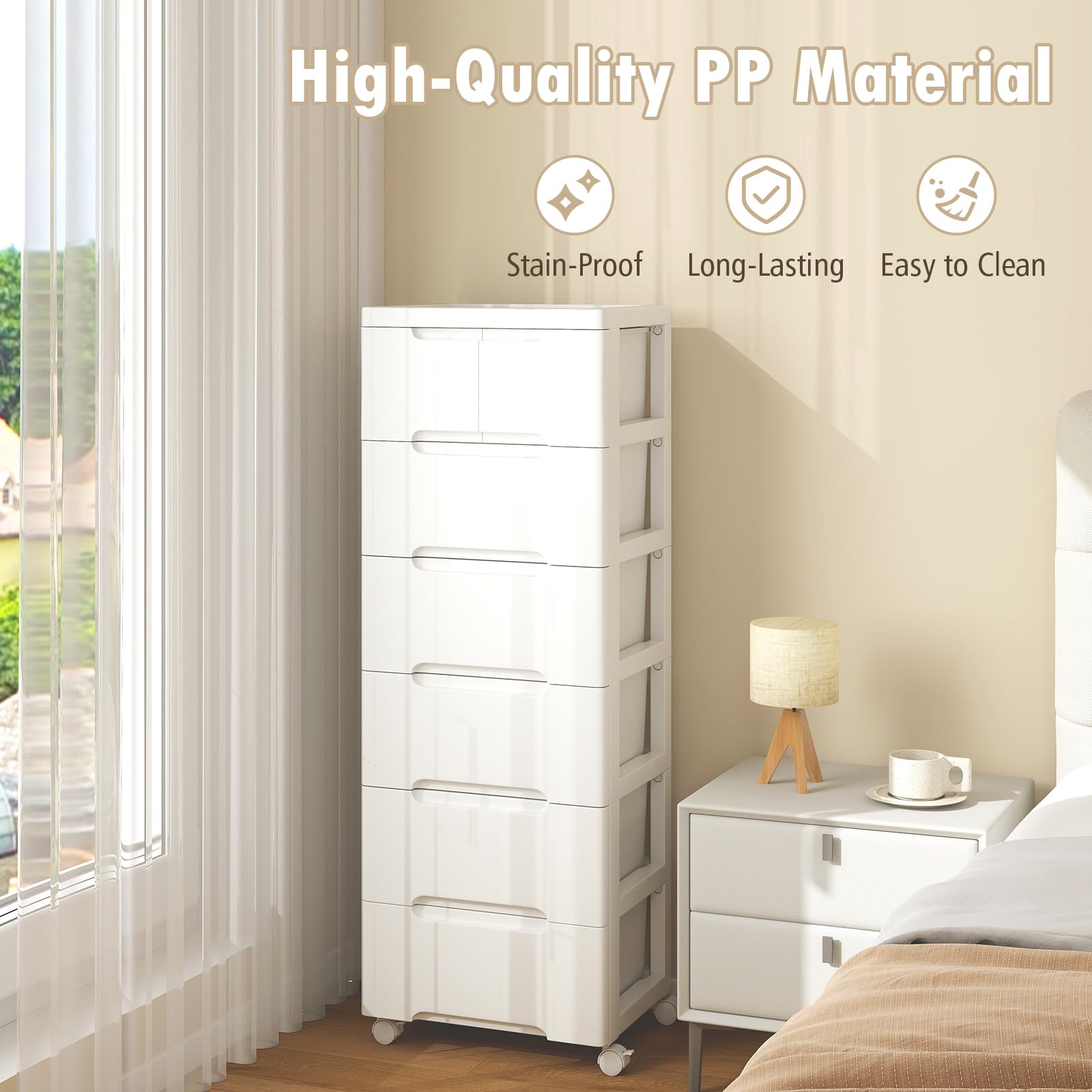 Crafted from PP material, the rolling storage cabinet features a spacious cabinet top, which provides a perfect space for showcasing decorations, and 7 drawers for versatile storage solutions. With smooth universal wheels for easy mobility, 2 of which are lockable for stability, this storage organizer effortlessly moves around your home. Its varied drawer sizes are perfect for storing art supplies, kitchen gadgets, and office essentials, making it adaptable to your needs. Resistant to stains and lightweight yet long-lasting, this storage unit promises a long service life. The tool-free assembly, with interlocking components for quick setup, ensures a hassle-free experience without the need for any hardware.