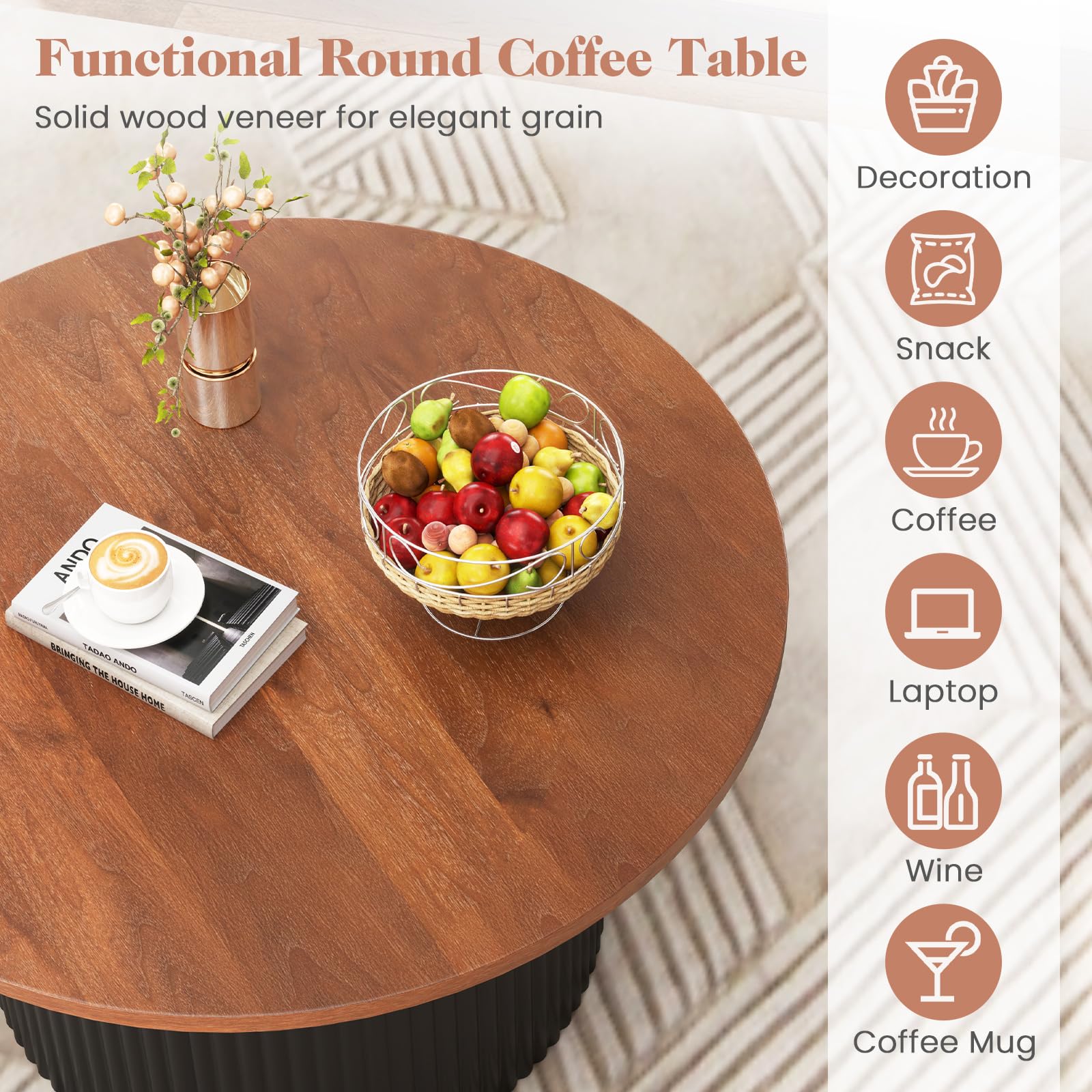 Add a touch of mid-century modern charm to your home with our Round Coffee Table. Crafted with a solid wood frame and a beautifully finished wooden top, this 32" table combines elegance and functionality. Its spacious tabletop is perfect for holding decorations, snacks, or daily essentials, while the unique wave-shaped support post ensures stability and durability. Whether placed in your living room, study, or reception area, this versatile accent table enhances your space with its timeless design. With user-friendly features like an easy-to-clean surface and adjustable foot pads, this coffee table is as practical as it is stylish.