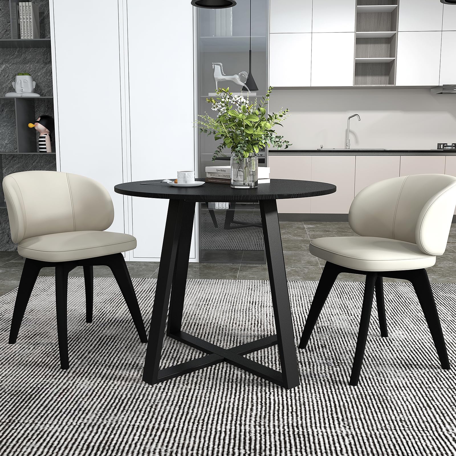 Our mid-century modern round dining table measures 36” x 30” (Dia. x H), which could seat up 4 people, making it ideal for intimate dinners or festive gatherings. Featuring sleek all-black finishes complemented by subtle wood grain accents, the kitchen table exudes a sense of contemporary elegance. Other than that, the dinette table is supported by a solid rubber wood frame and reinforced by a pedestal base, which is built for stability and durability, ensuring a secure dining experience. Cleaning and upkeep are also a breeze with the waterproof MDF tabletop. Make every meal a memorable experience with our round dining room table!