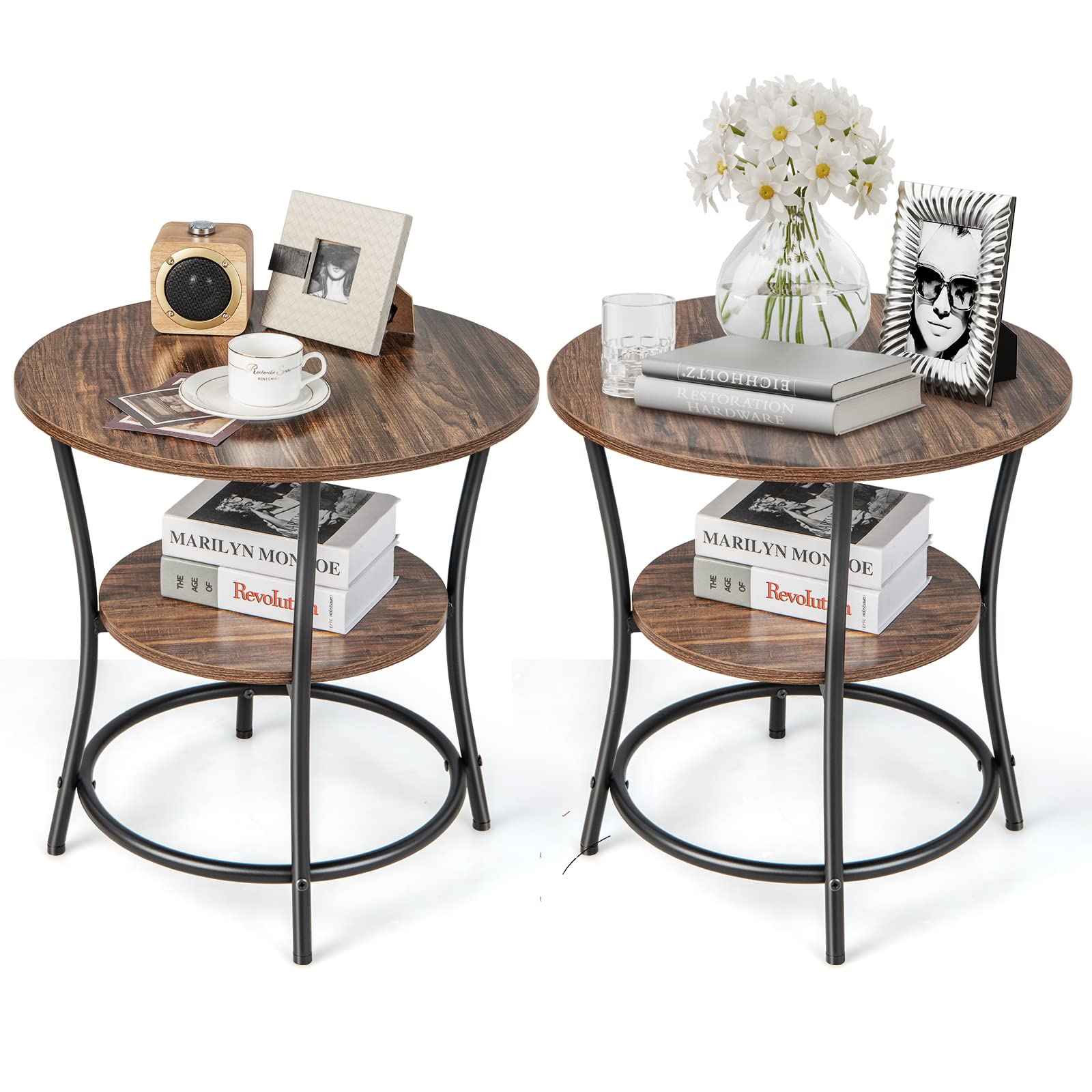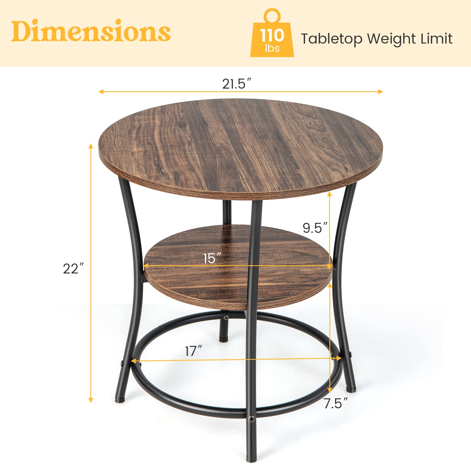 This is a small space organizer that expands the room's storage space and adds a rustic appeal. With the 2 shelves to hold essentials and ornaments, life becomes much easier and more enjoyable. And the metal framework helps to strengthen the structure for a larger capacity. For example, the tabletop can support up to 110 lbs. In addition, the adjustable foot pads ensure that the end table is always stable, leveling out any unevenness in the floor. With a size of 21.5" x 21.5" x 22" (L x W x H), the small side table fits in any place in any way.