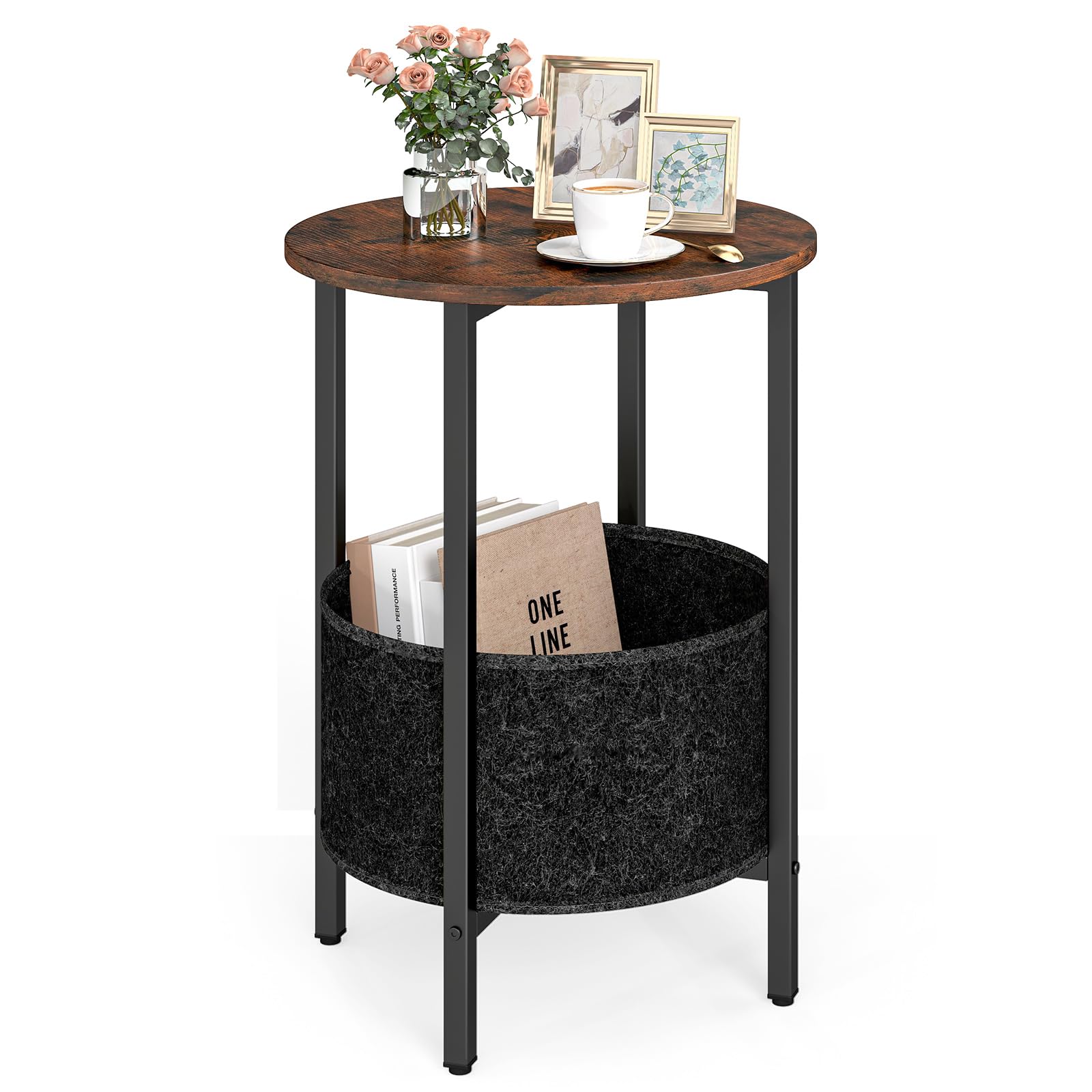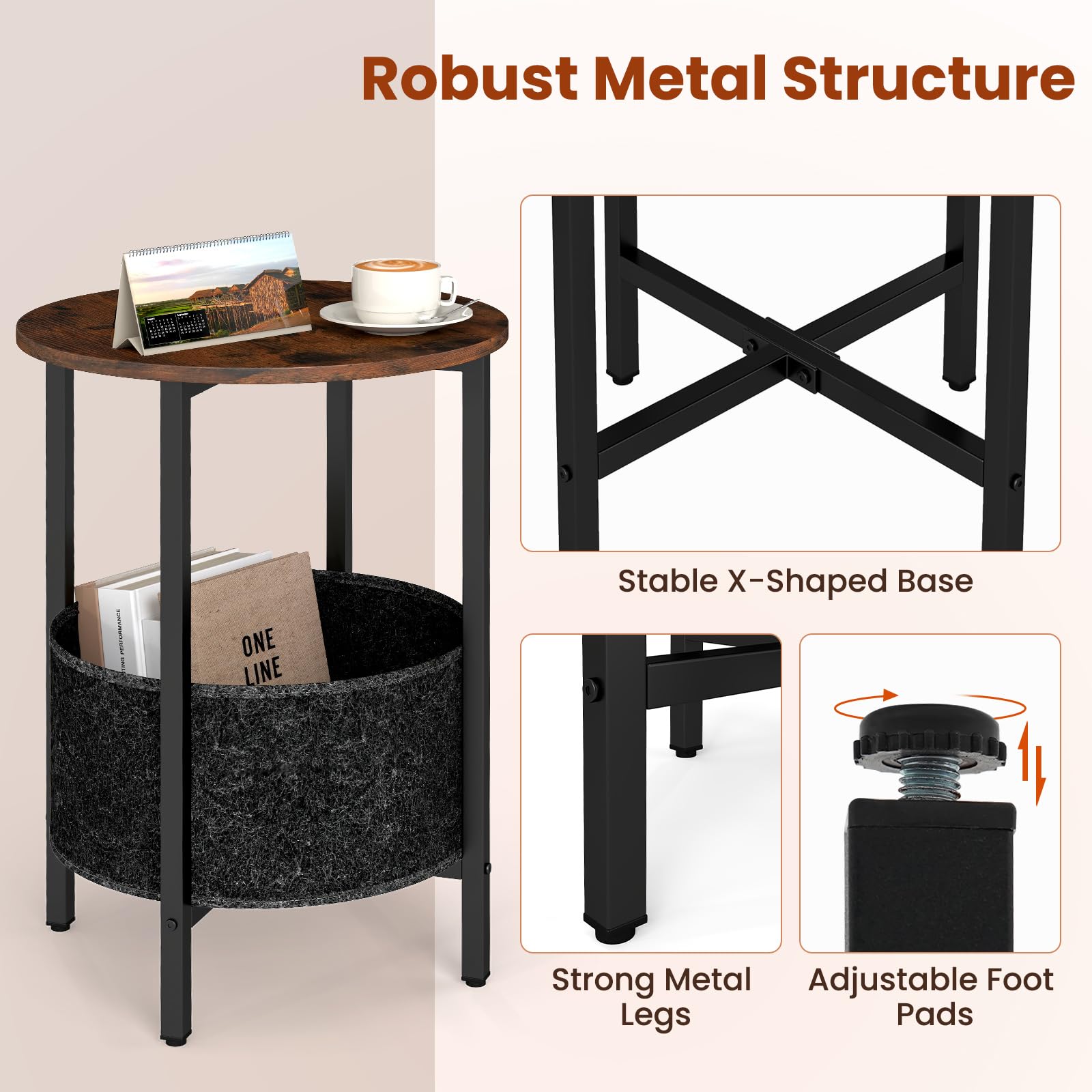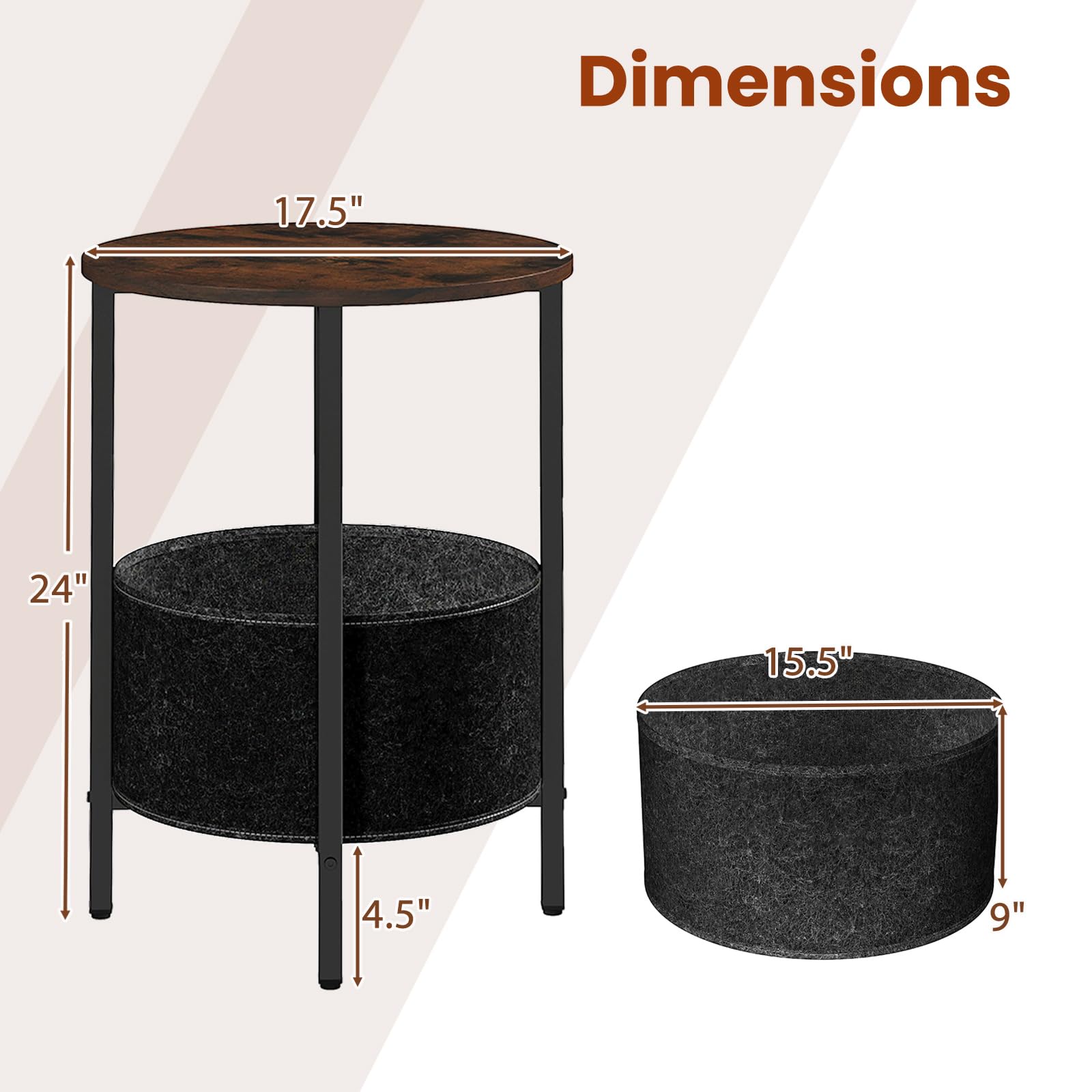 The versatile side table boasts a roomy 17.5" round tabletop and a detachable felt basket underneath for storage. Supported by a robust metal structure with an X-shaped base and adjustable foot pads, it can stably hold up to 66 lbs. With its multifunctional design, it can be used as an end table, nightstand, or decorative side table, standing at 17.5"L x 17.5"W x 24"H. Not only does this table elevate your home decoration, but its sleek and space-saving build fits seamlessly into any room, making it ideal for small spaces like living rooms, bedrooms, or studies.