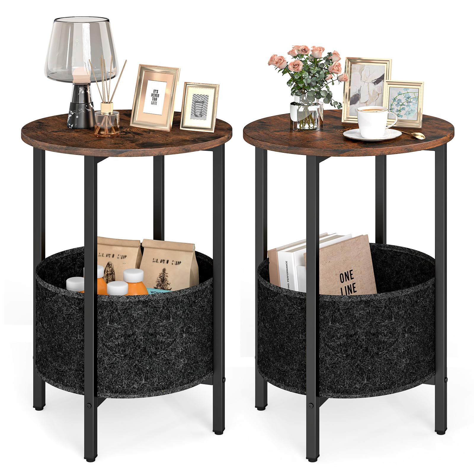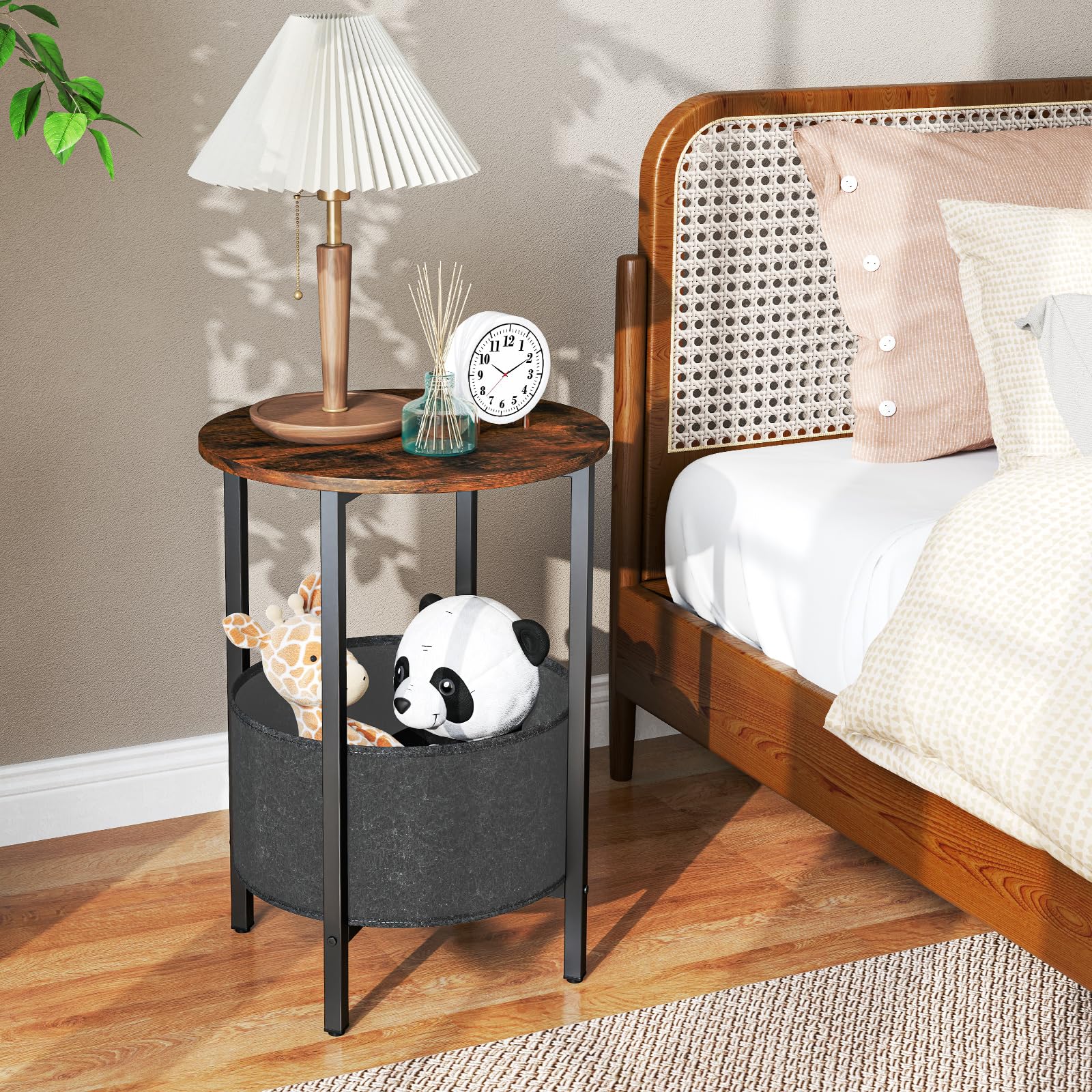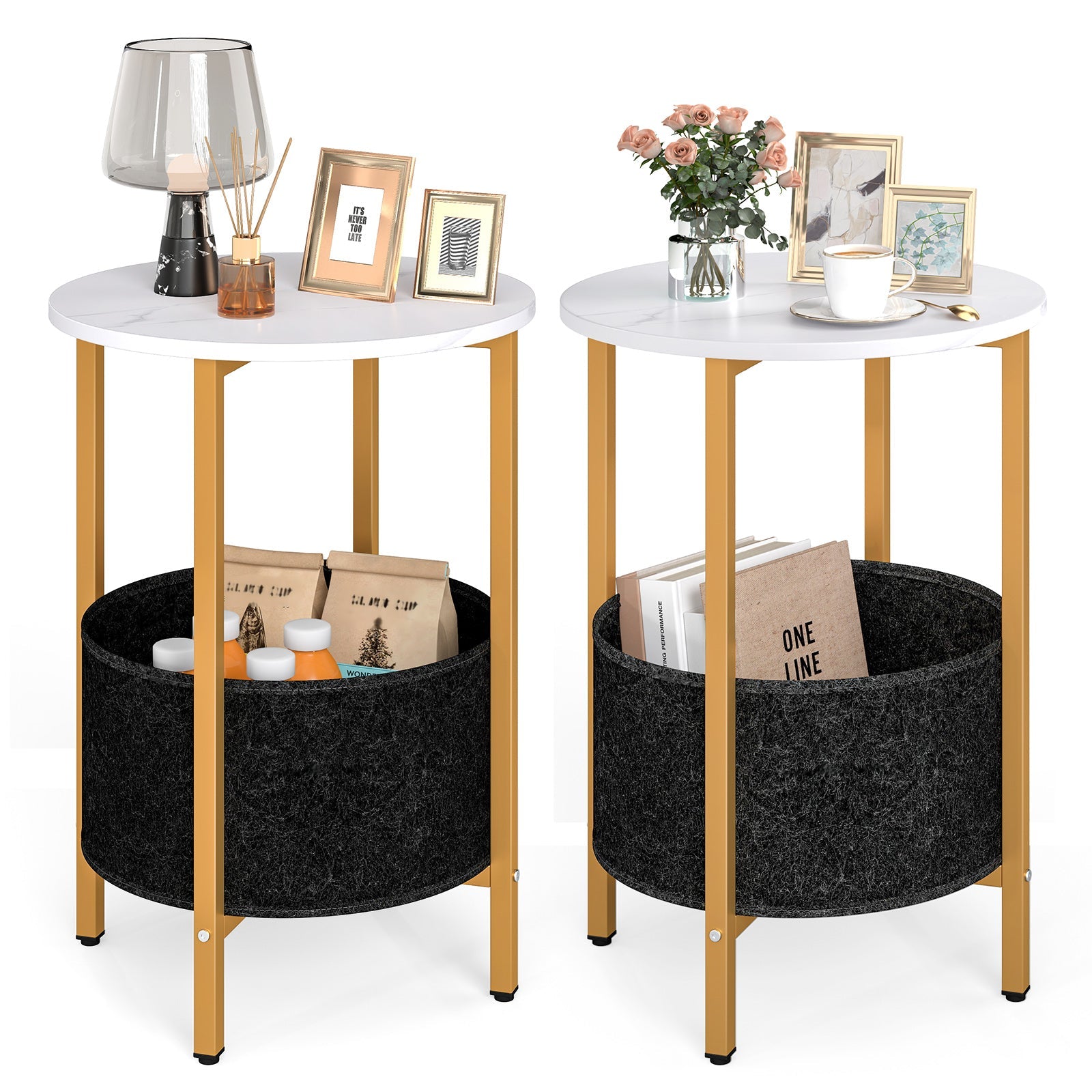 The versatile side table boasts a roomy 17.5" round tabletop and a detachable felt basket underneath for storage. Supported by a robust metal structure with an X-shaped base and adjustable foot pads, it can stably hold up to 66 lbs. With its multifunctional design, it can be used as an end table, nightstand, or decorative side table, standing at 17.5"L x 17.5"W x 24"H. Not only does this table elevate your home decoration, but its sleek and space-saving build fits seamlessly into any room, making it ideal for small spaces like living rooms, bedrooms, or studies.