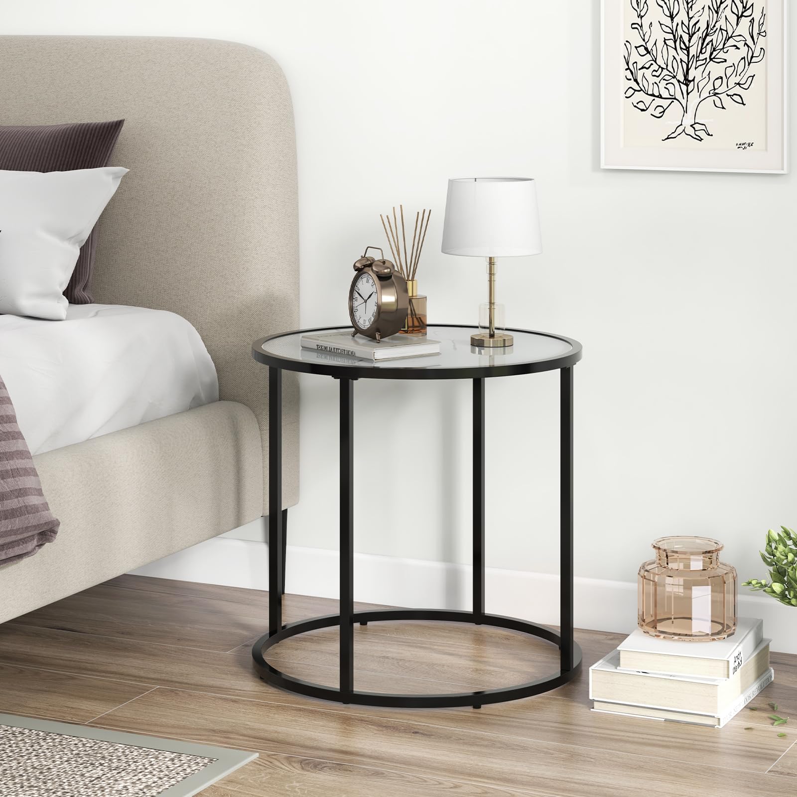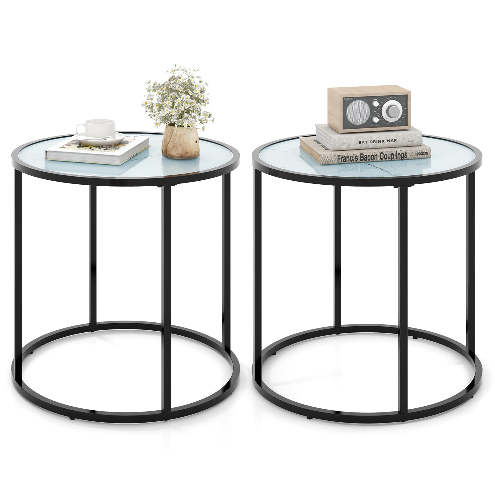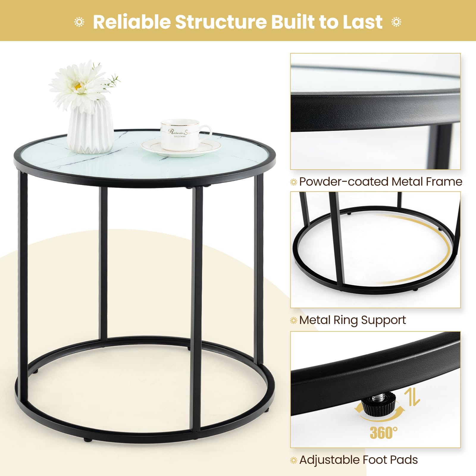 - Modern Appeal: Featuring a sleek faux marble glass top and black metal frame, the round end table creates a contemporary look that brightens your room. It is a stylish addition to your living room, bedroom, balcony, or any small space.
