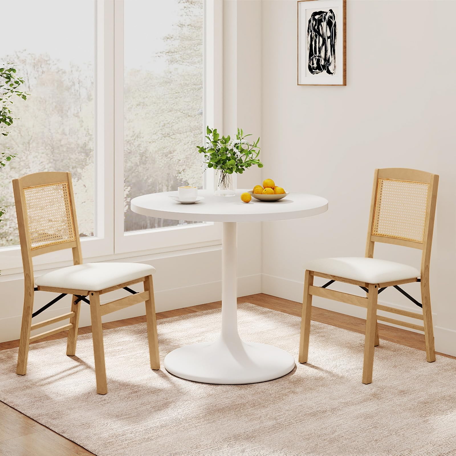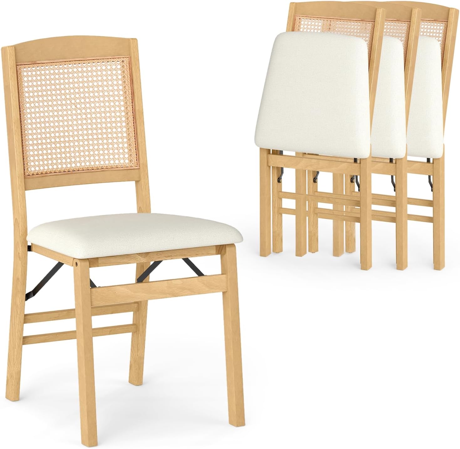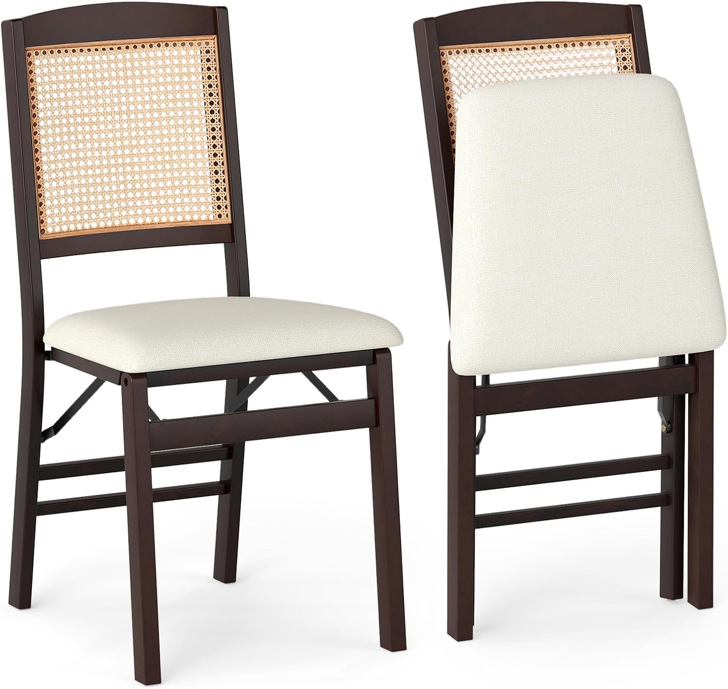 Crafted from solid rubber wood, each chair offers strong and long-lasting support. The breathable linen fabric and soft sponge fillings make the dining chairs exceptionally cozy to sit on. Moreover, the quick folding design allows effortless storage. Featuring a beautifully woven PE rattan backrest, these chairs bring a boho charm to any indoor space. Ready to use right out of the box, these rubber wood indoor chairs provide convenient, stylish seating for your dining room, kitchen, or study.