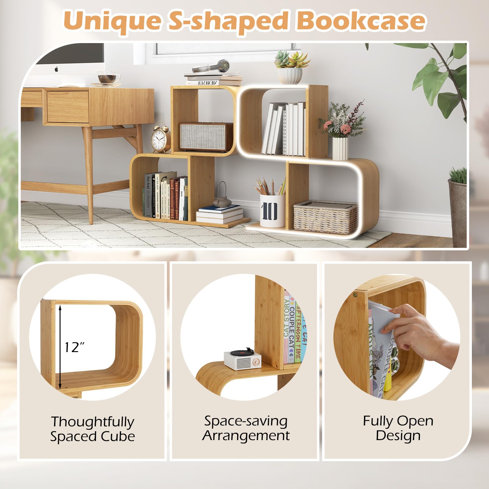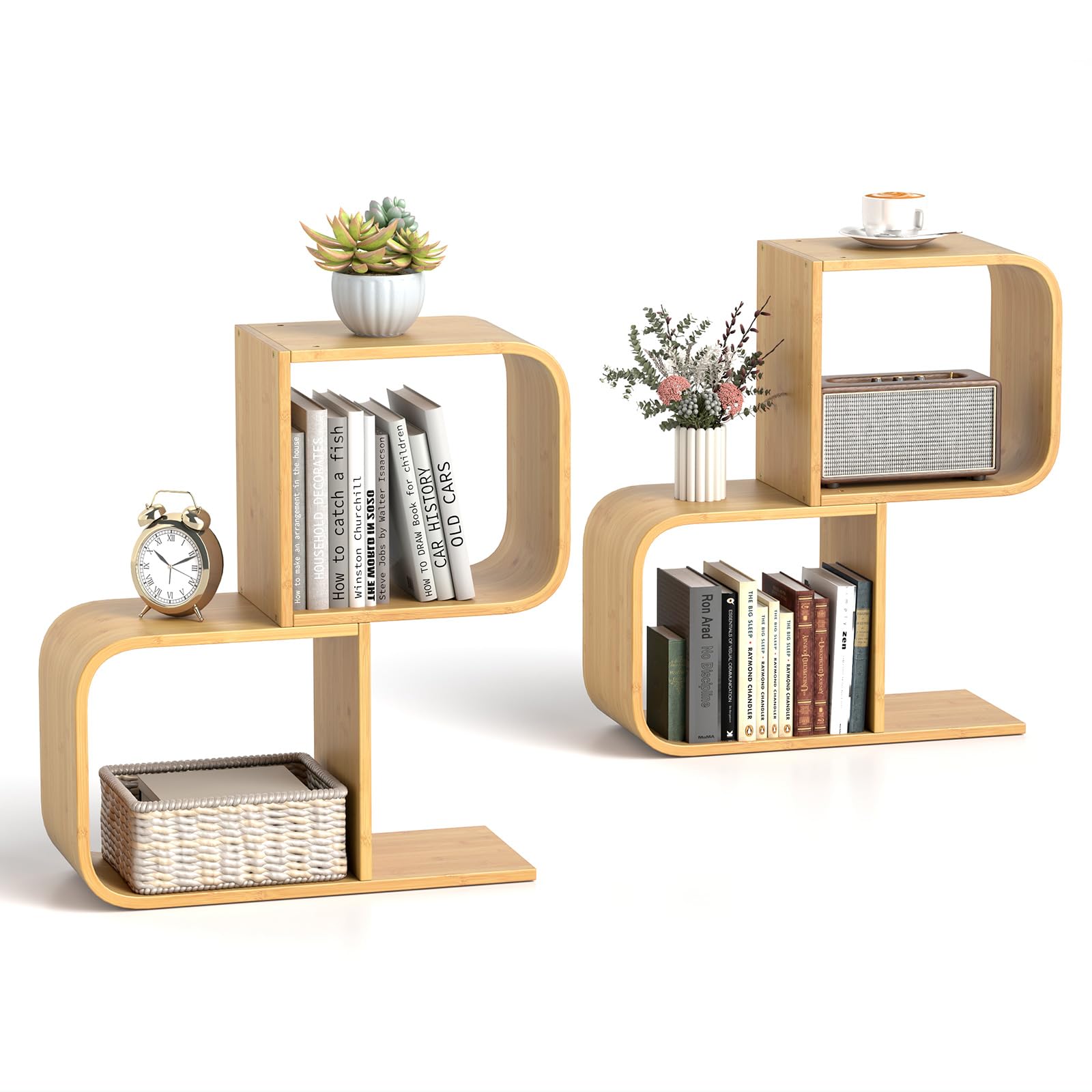 Organize your space in a sustainable and stylish way with this bamboo bookshelf! The S-shaped design creates a visually striking display while 2 cubes make it easy to hold a variety of items, from books to decorative accents. Worried about safety? Don’t be! Our innovative bookshelf comes with anti-toppling kit for your peace of mind. Whether used in the living room, study or office, this bookcase complements a wide range of interior styles. Maximize your living area with this space-efficient bookshelf that fits snugly in corners or against walls.