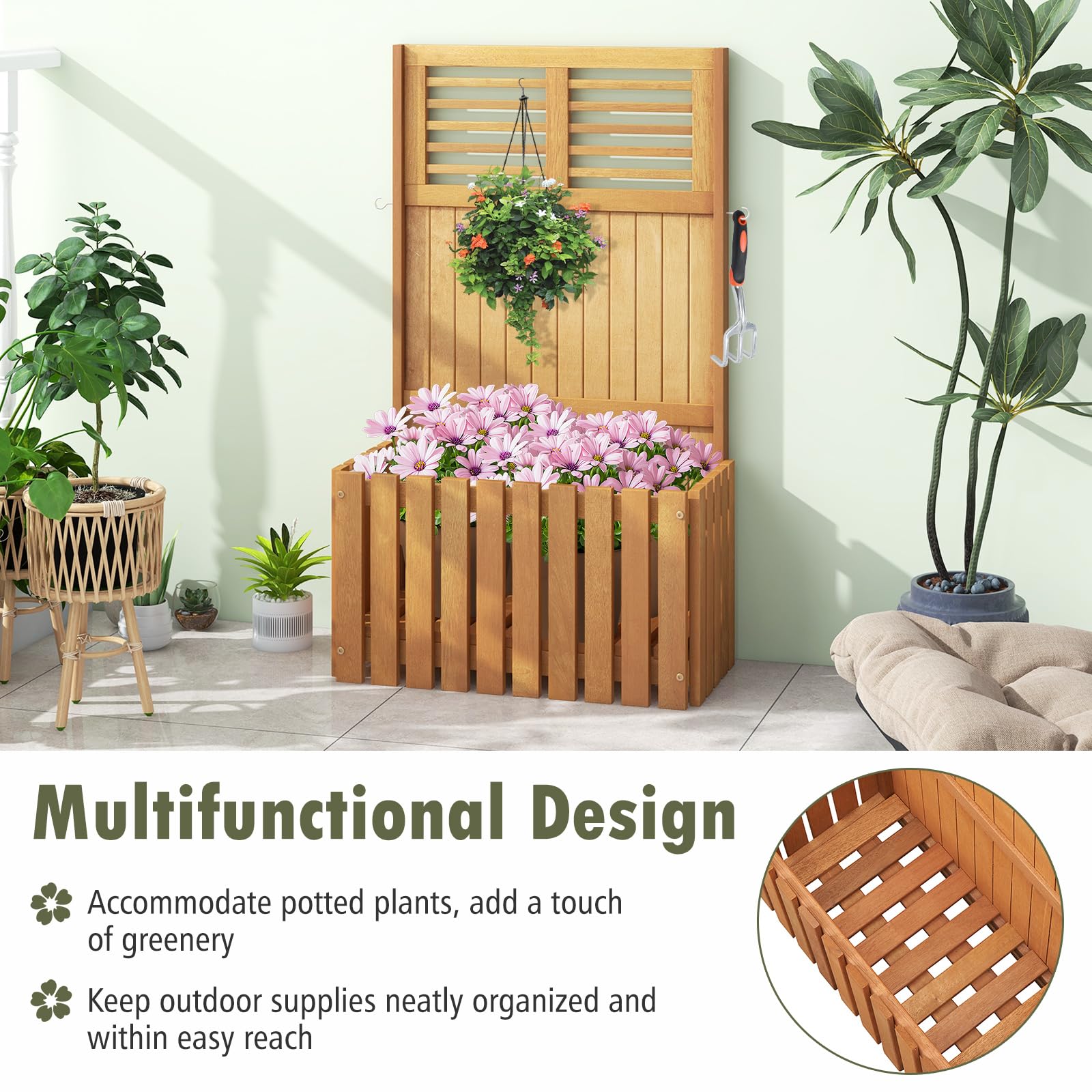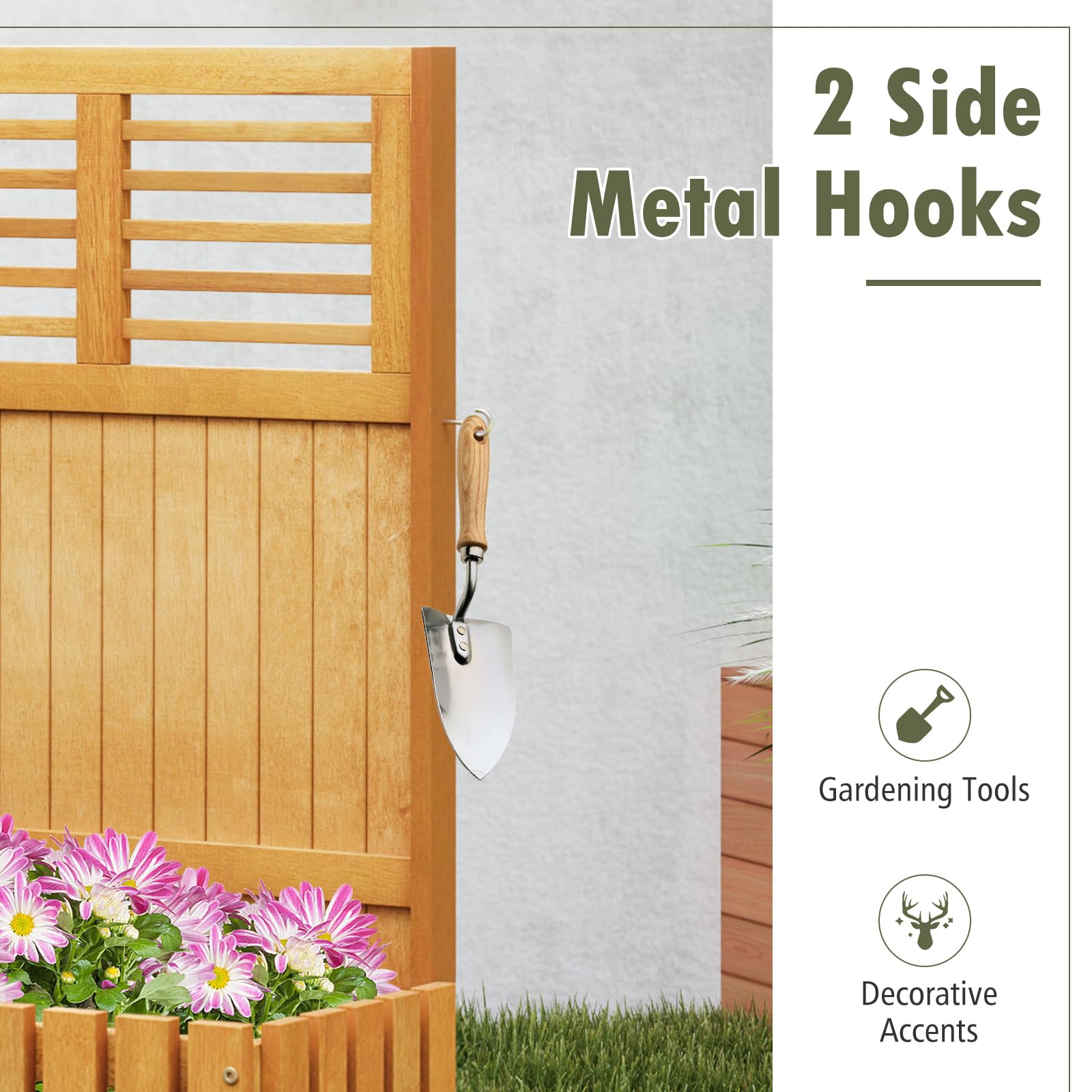 Our wooden raised garden bed measures 25” x 13” x 41” (L x W x H), and comes with a planter box for displaying vibrant blooms while there is a privacy screen for creating intimate outdoor spaces and 2 metal hooks for hanging decorations. The planter box can also be used as a storage compartment, keeping outdoor supplies neatly organized and within easy reach. More than that, this wood planter is crafted of 100% solid wood, complied with PEFC certification for sustainable practices, ensuring unparalleled durability and weather resistance. And it features a protective coating of waterproof teak oil, preserving the wood's natural beauty for years to come. A stylish and adaptable element for transforming your outdoor living space into a tranquil retreat.