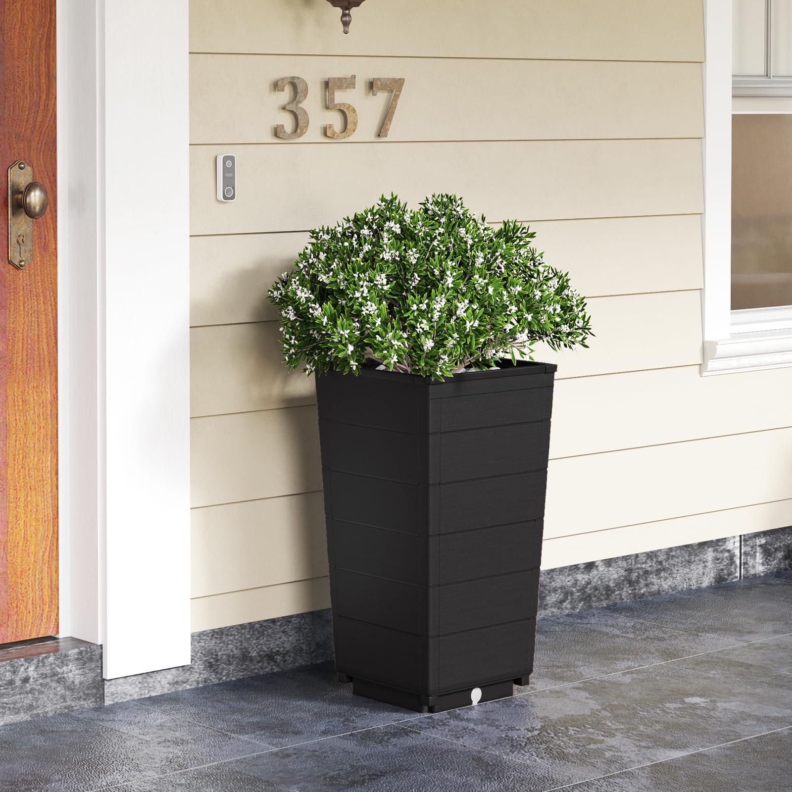 Our tall planters cater to the modern lifestyle, offering a stylish upgrade for home offices, front porches, or any indoor and outdoor spaces. No more daily watering chores. Simply refill the bottom reservoir on regular intervals, and your plants will be ready to welcome you home or offer a natural respite during work breaks. Crafted from optimal PP material with a sleek wood grain pattern, these planters are simple to maintain, install, and move around, standing up to everyday use at all seasons.