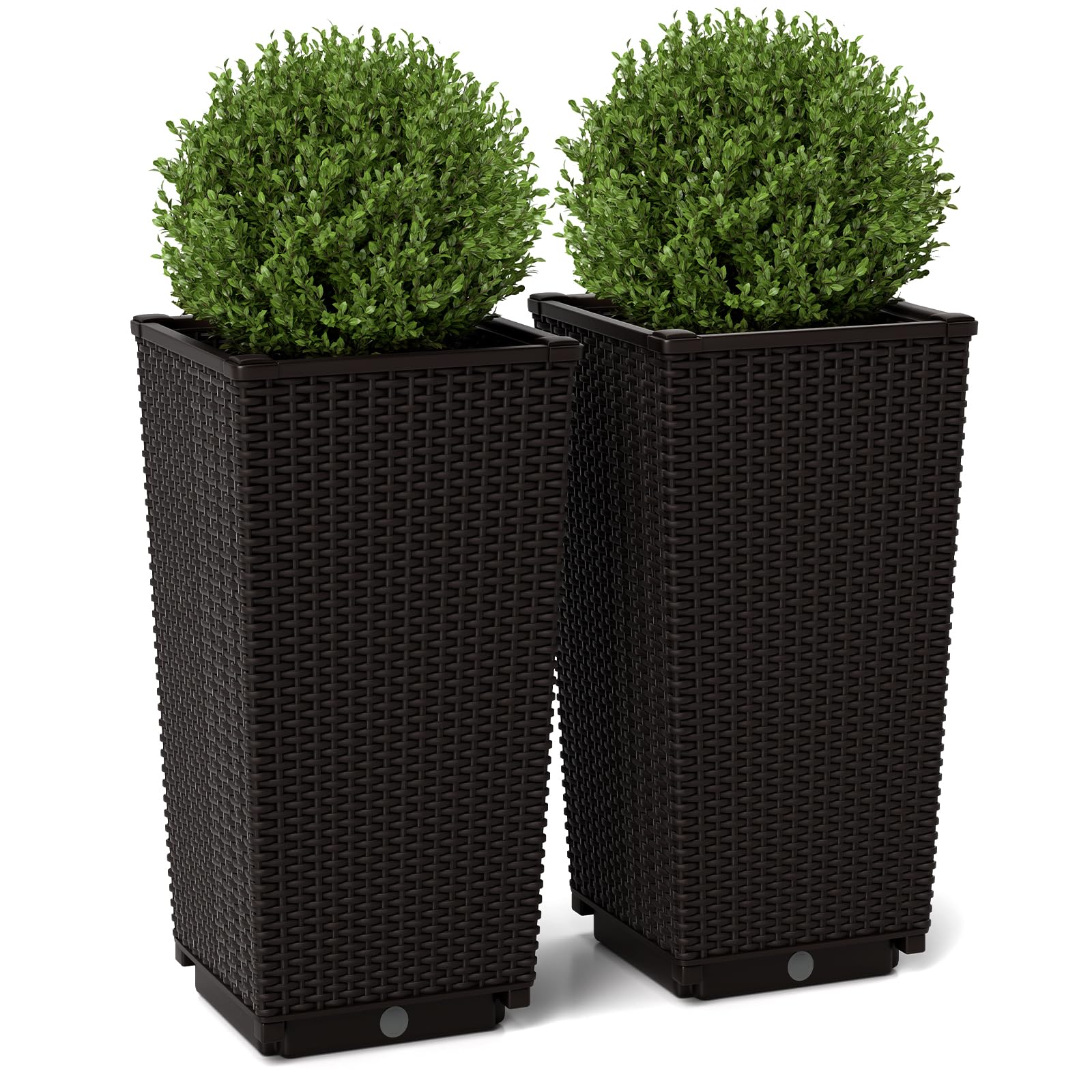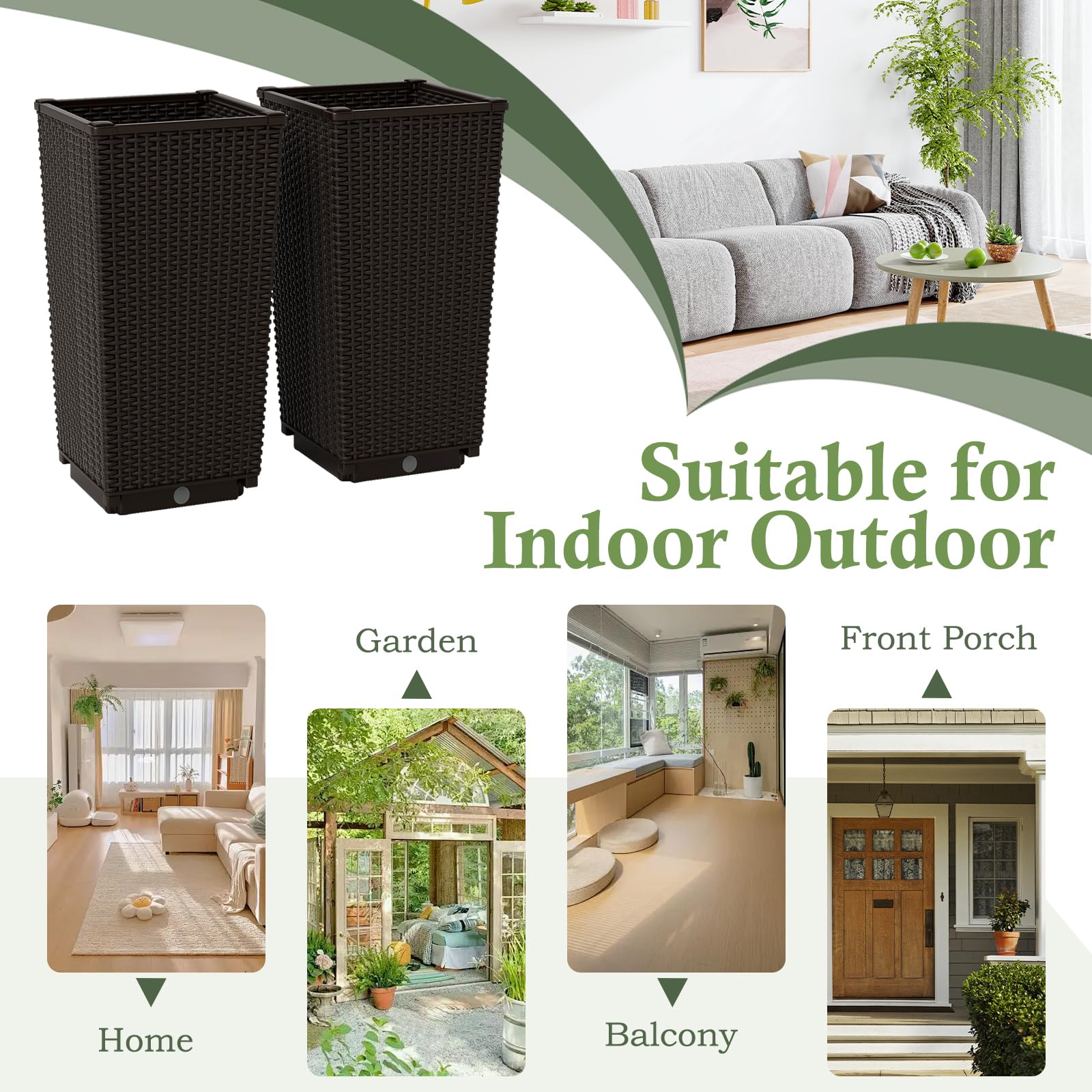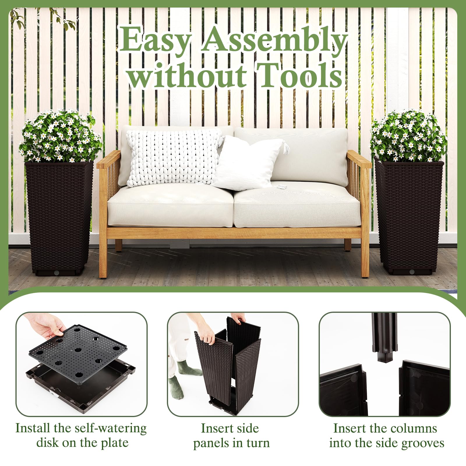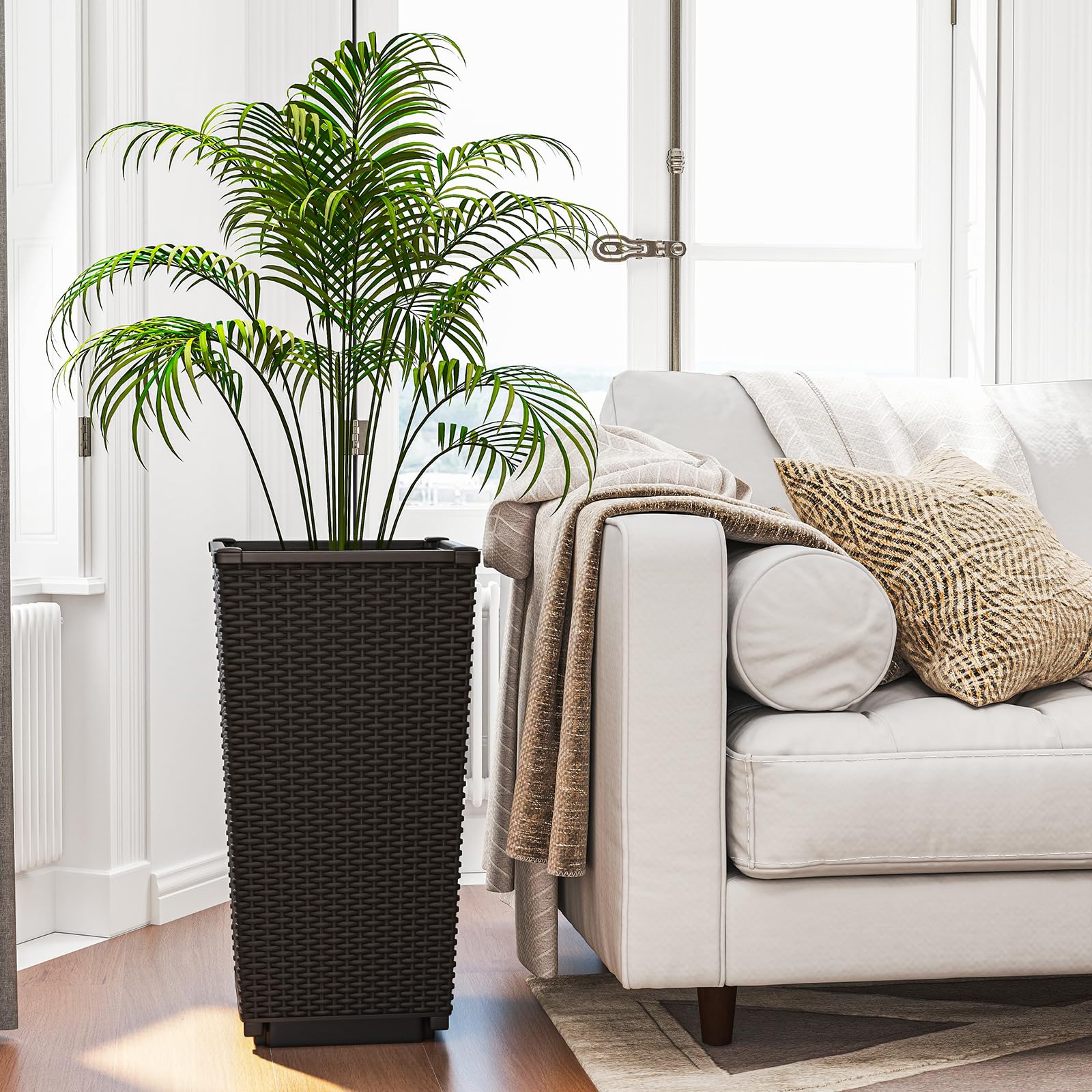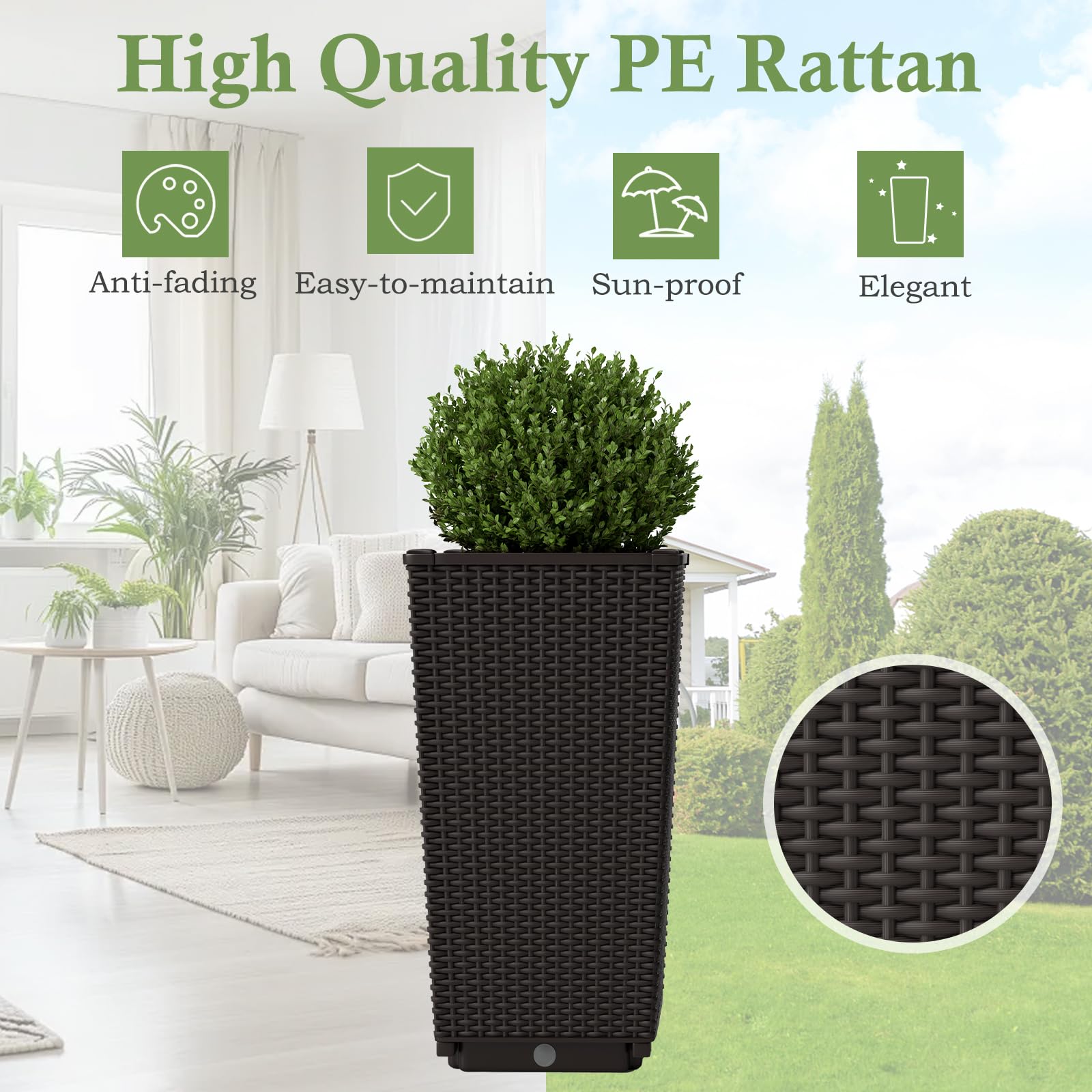 Turn every day into a vibrant flourish of nature's best with the rattan planting box! Crafted from high quality PP, these planters stand out for their durability and weather-resistant properties. This resilience guarantees longevity and a consistent aesthetic appeal, making them a perfect choice for indoor and outdoor occasions, such as front porches, decks, living rooms. The outdoor wicker flower pots are equipped with self-priming irrigation system and drainage holes to prevent over-drying or water accumulation. This system is friendly for gardeners by simplifying plant care and enhancing growth. Measuring 13” x 13” x 23” (L x W x H), these tall planters are ideal for fostering a variety of plants, from deep-root vegetables to blooming flowers. Thanks to the ease of assembly, these planters are designed for immediate use.