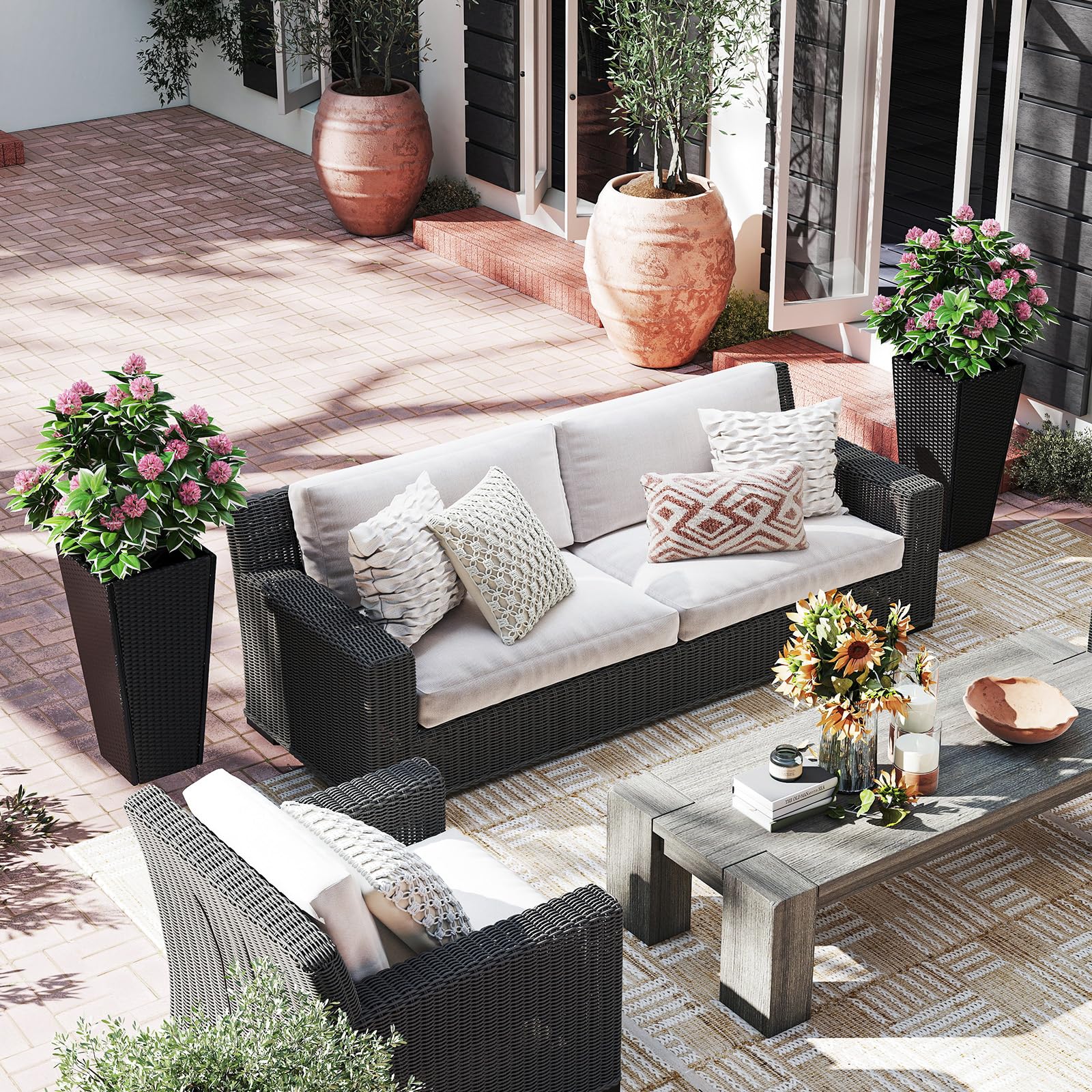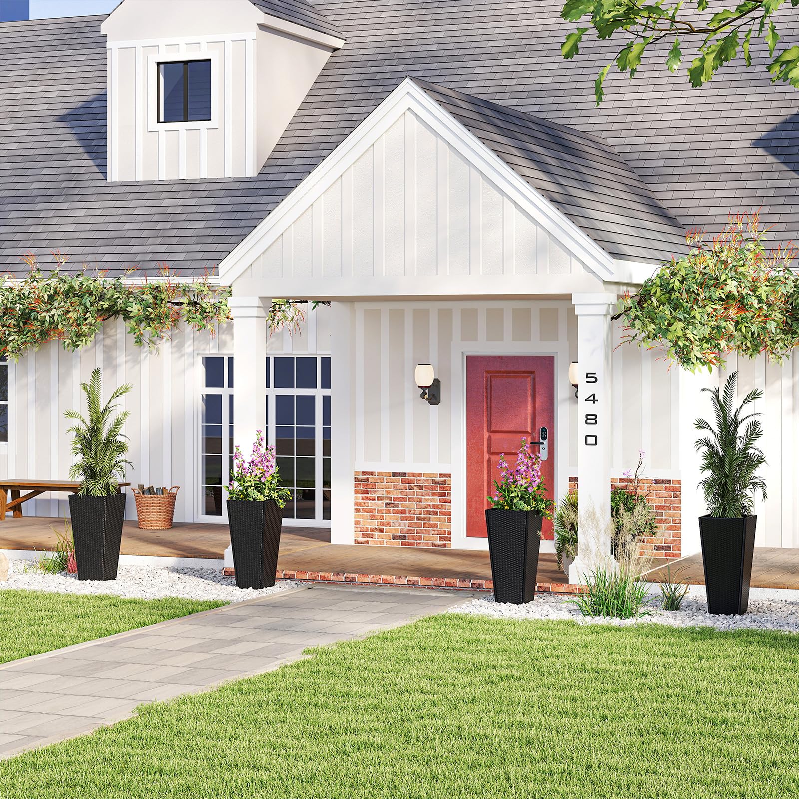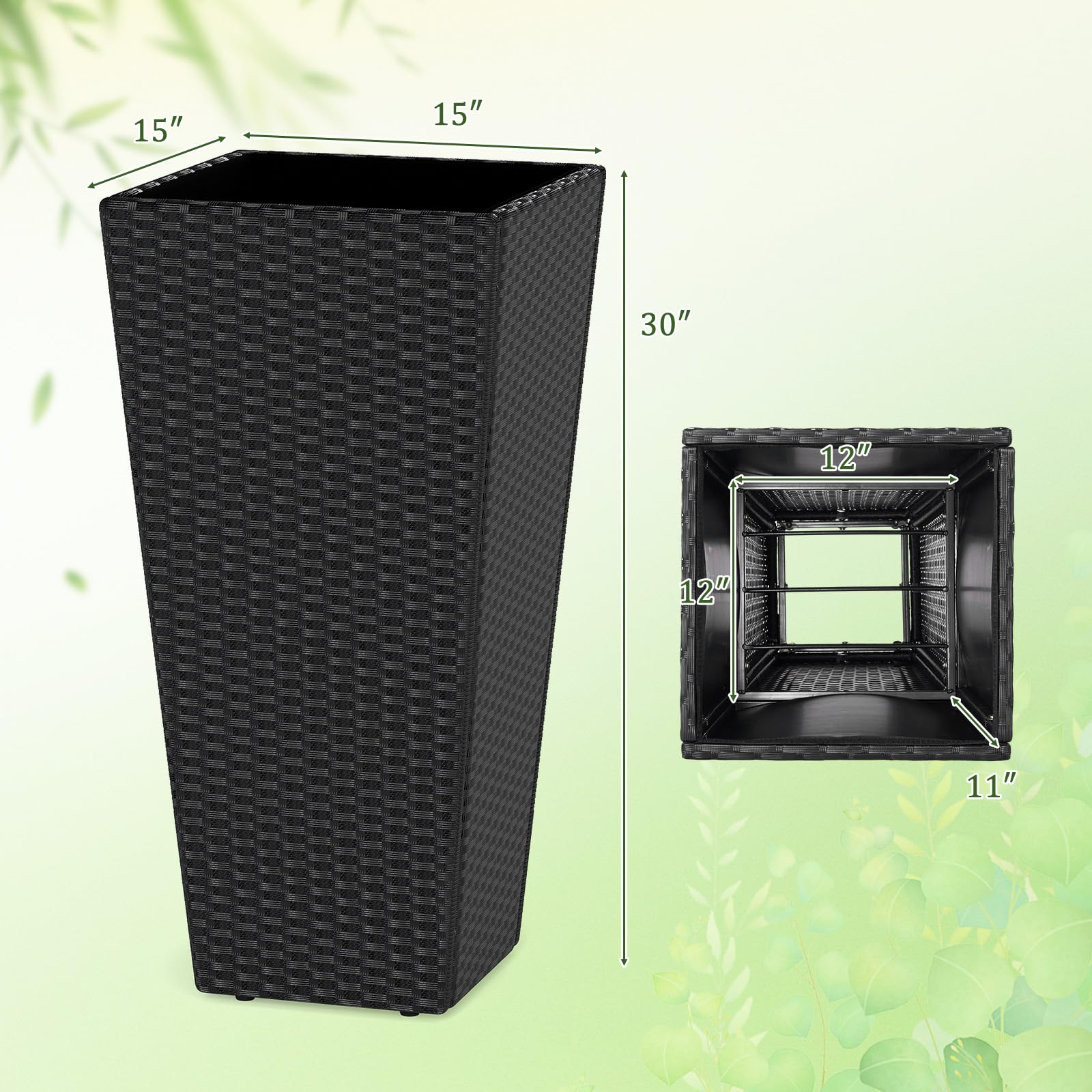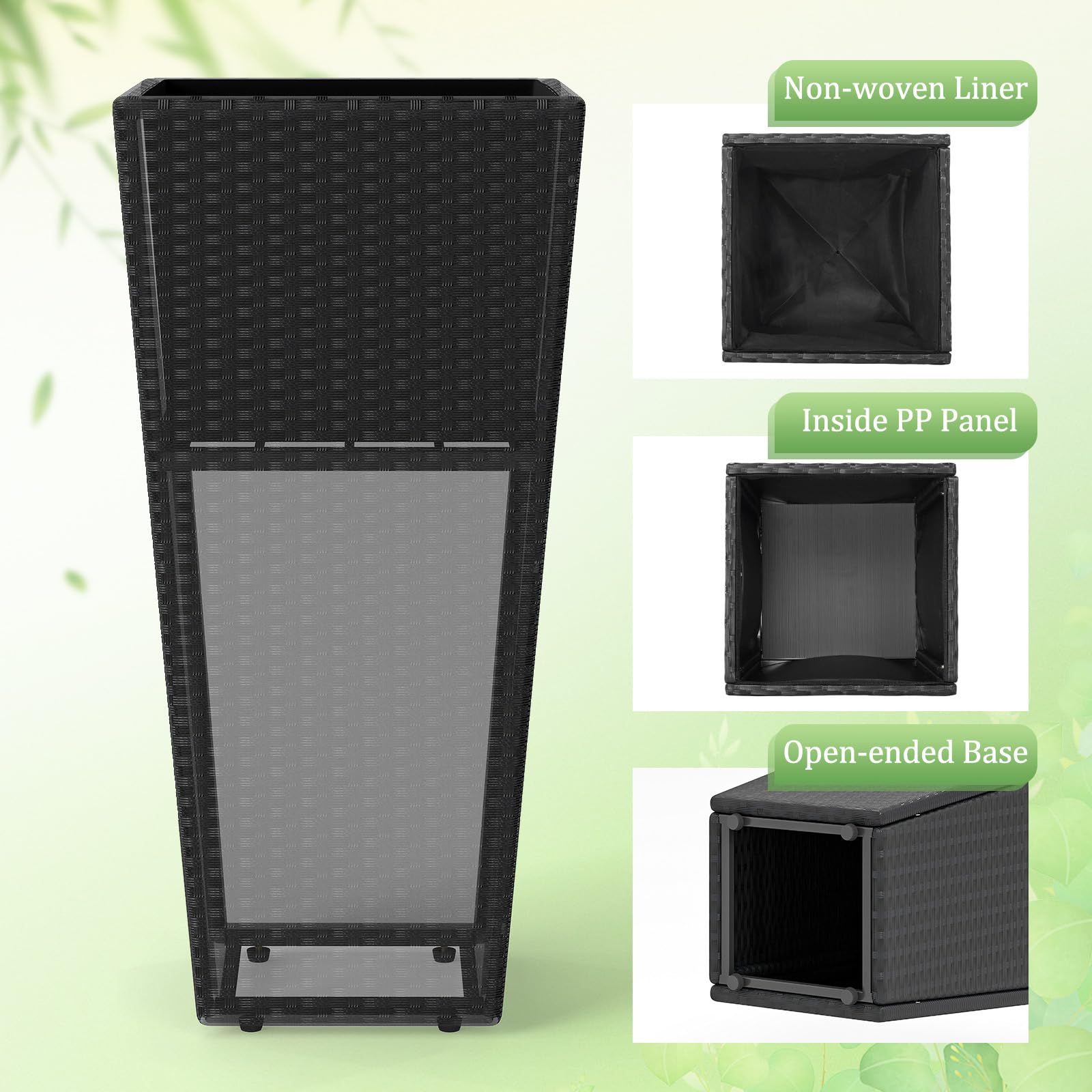 The open-ended base promotes excellent water drainage, while the internal PP panel and non-woven liner protect the soil, making them ideal for sustaining healthy plant growth. Boasting a sophisticated PE rattan construction, the outdoor flower pots resist wearing and fading, ensuring they look great year after year. Additionally, a robust metal frame supports each planter, complimented by adjustable foot pads that cater to uneven surfaces. The substantial 30” height and sleek tapered design provide ample space for your plants and enhance the visual appeal of various setting—from garden corners to patios and balconies.