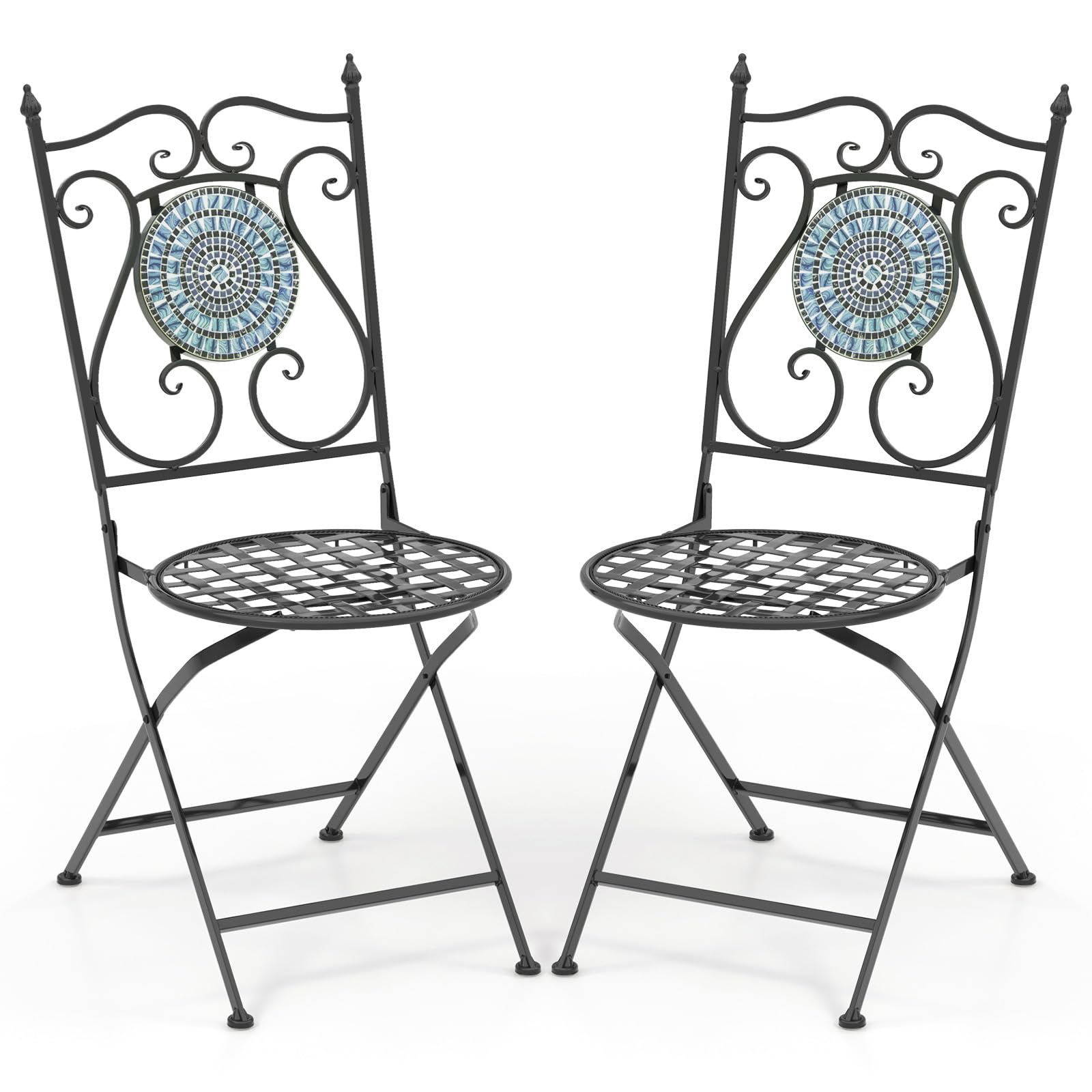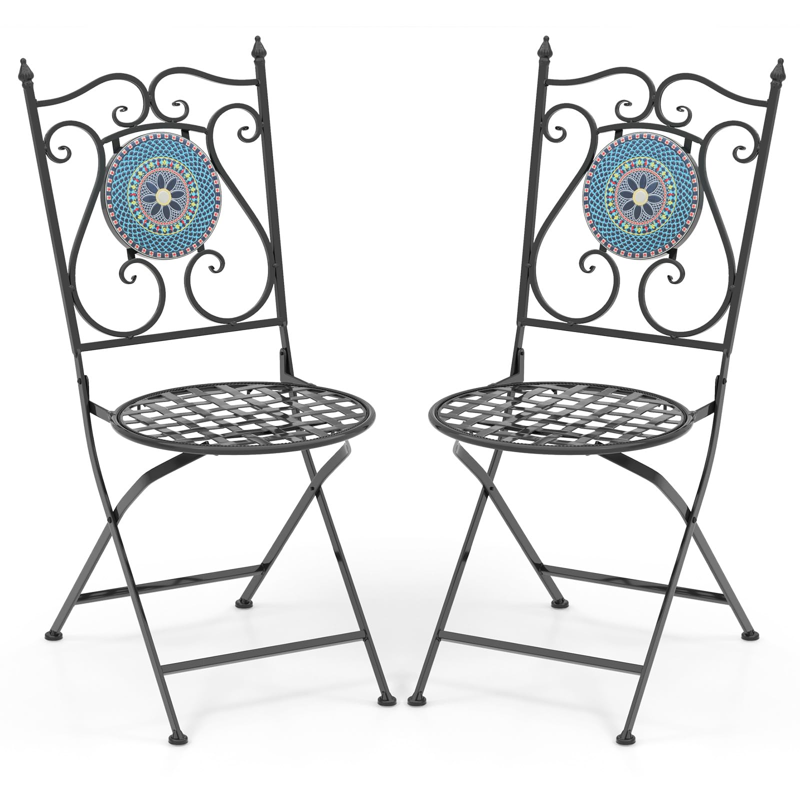 With heavy-duty metal frame, the chairs are built to withstand the test of time. The standout feature of the 2 chairs is the beautifully designed mosaic patterns. The intricate patterns and vibrant colors add a touch of elegance and charm to any space. When not in use, the chairs can be folded to save space, which are also portable. Overall, the mosaic chair set is a perfect combination of style, functionality and durability.