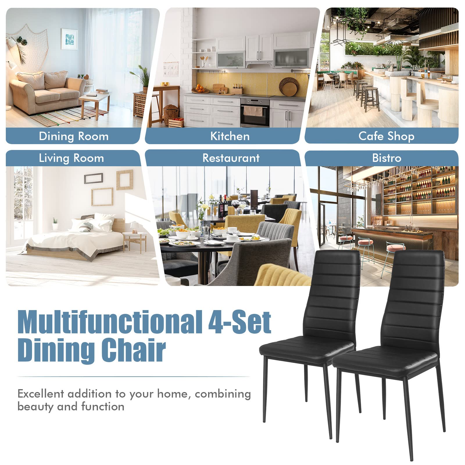 Our dining chairs set provides 4 practical chairs which can be put near the dining table allowing you to enjoy delicious dining or leisurely afternoon teas with your family or friends. The seat and backrest are padded with high-density and high-rebound sponges that can maintain their original shape for suitable support and optimum comfort. Moreover, the premium PVC leather surface is odorless, waterproof, and dirt-resistant, ensuring long-term service life. And thanks to the ergonomic backrest that can perfectly fit your body curve, it can effectively alleviate the pressure and fatigue of your back. In addition, the solid metal frame and non-skid footpads help enhance stability, so each chair is stable enough to load up to 250 lbs. With a classic all-black appearance, it can match various home styles.