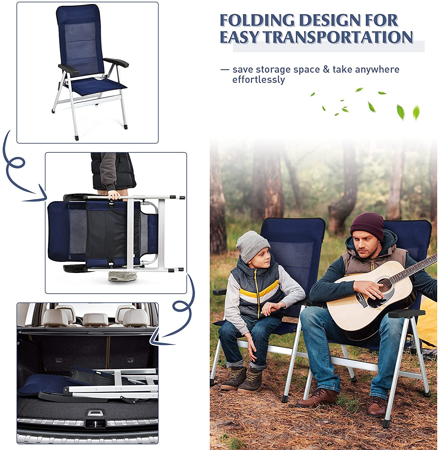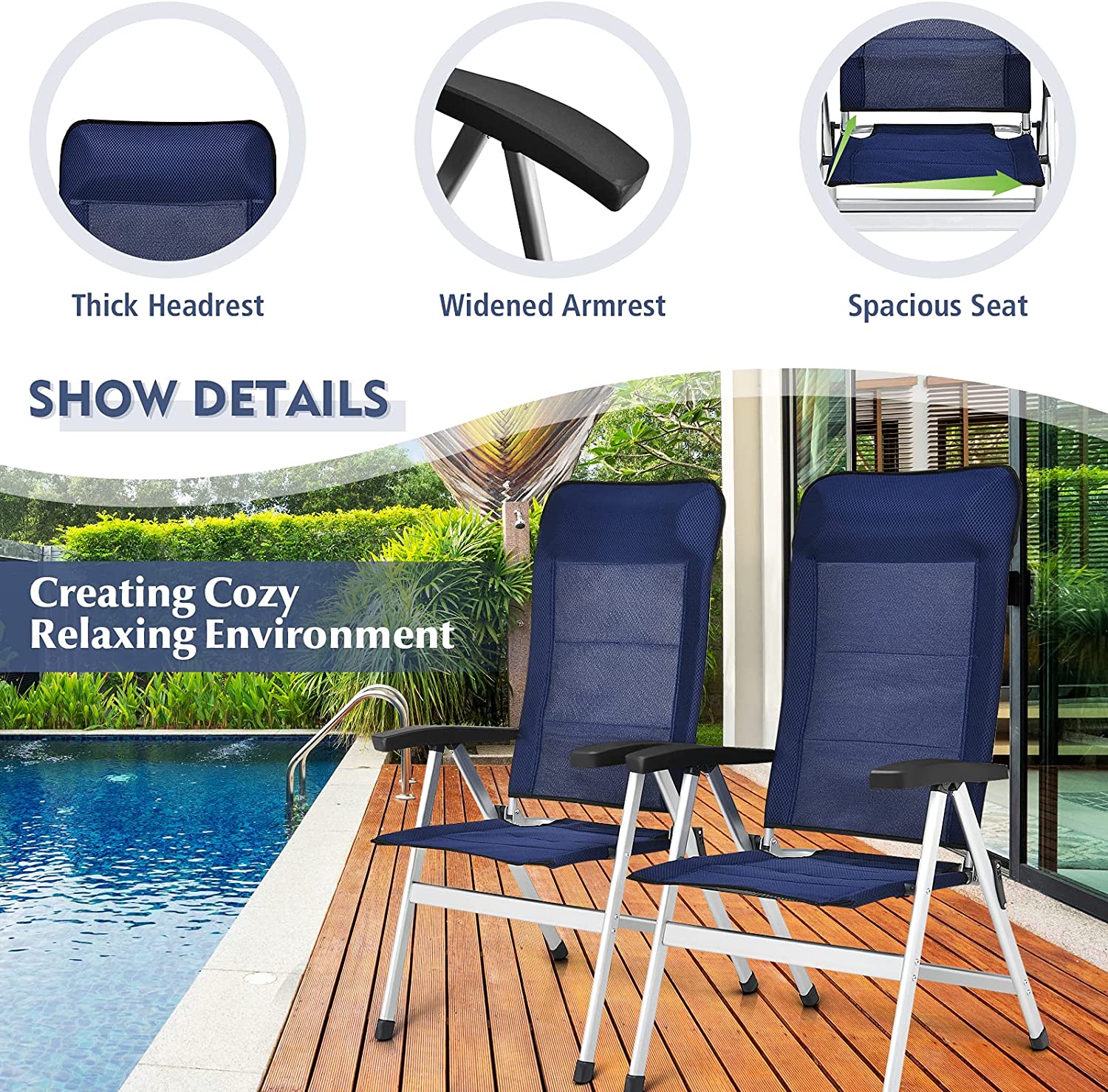 The dining chair is designed to provide you great comfort and relaxation. Made of high-quality aluminum and iron, this chair features outstanding sturdiness and strong weight bearing capacity of 300lbs. The chair has 7 levels adjustable backrest to satisfy versatile needs of users such as reading or having a rest. Soft sponge-filled pillow, 2 curved armrest and 35" backrest provides extraordinary comfort. Additionally, foldable design helps to improve space-saving efficiency. If you are looking forward to a product like this, our chair will be your wise choice.